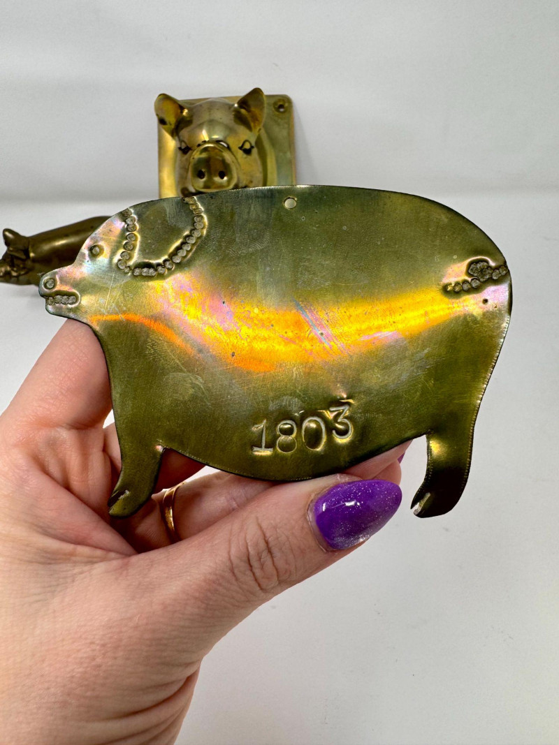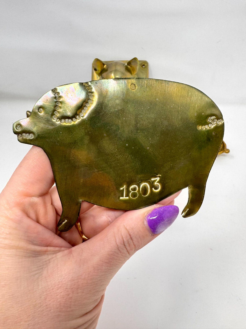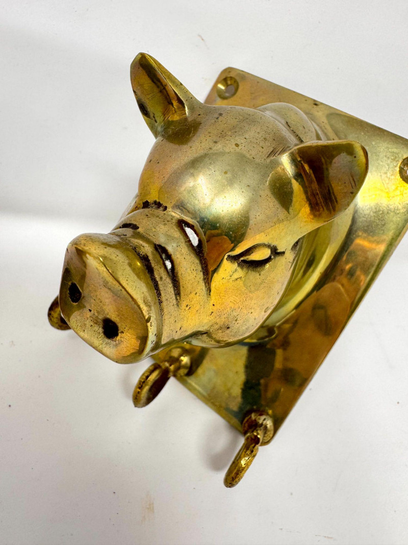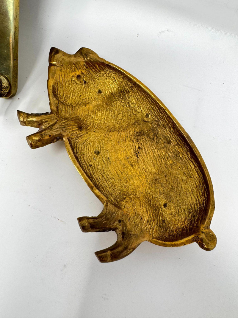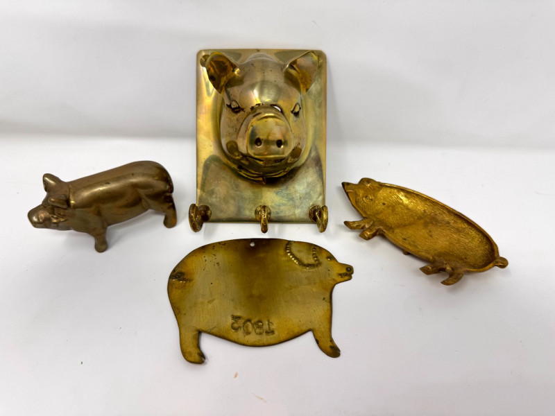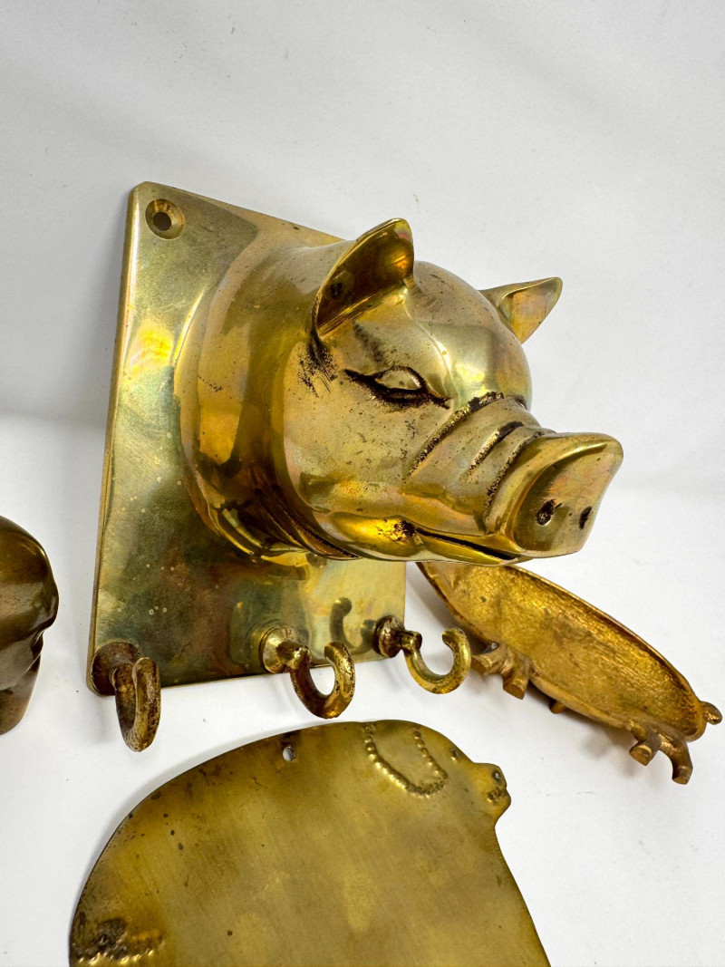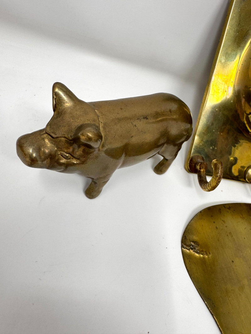 Brass Pig Wall Key Holder w/ 3 Hooks + Pig-Shaped Brass Pieces.
