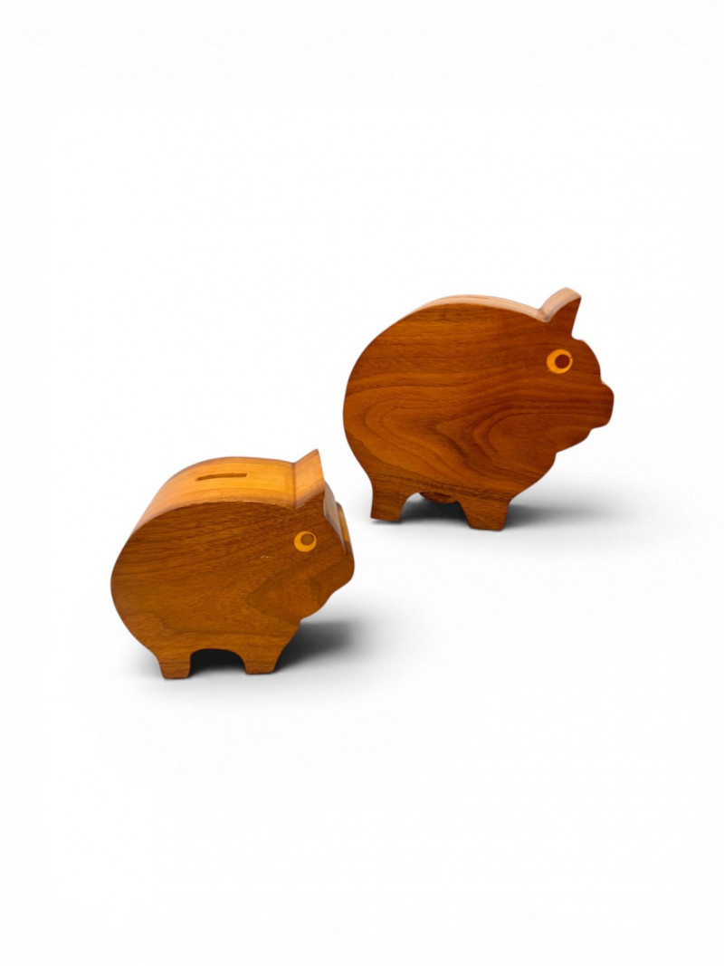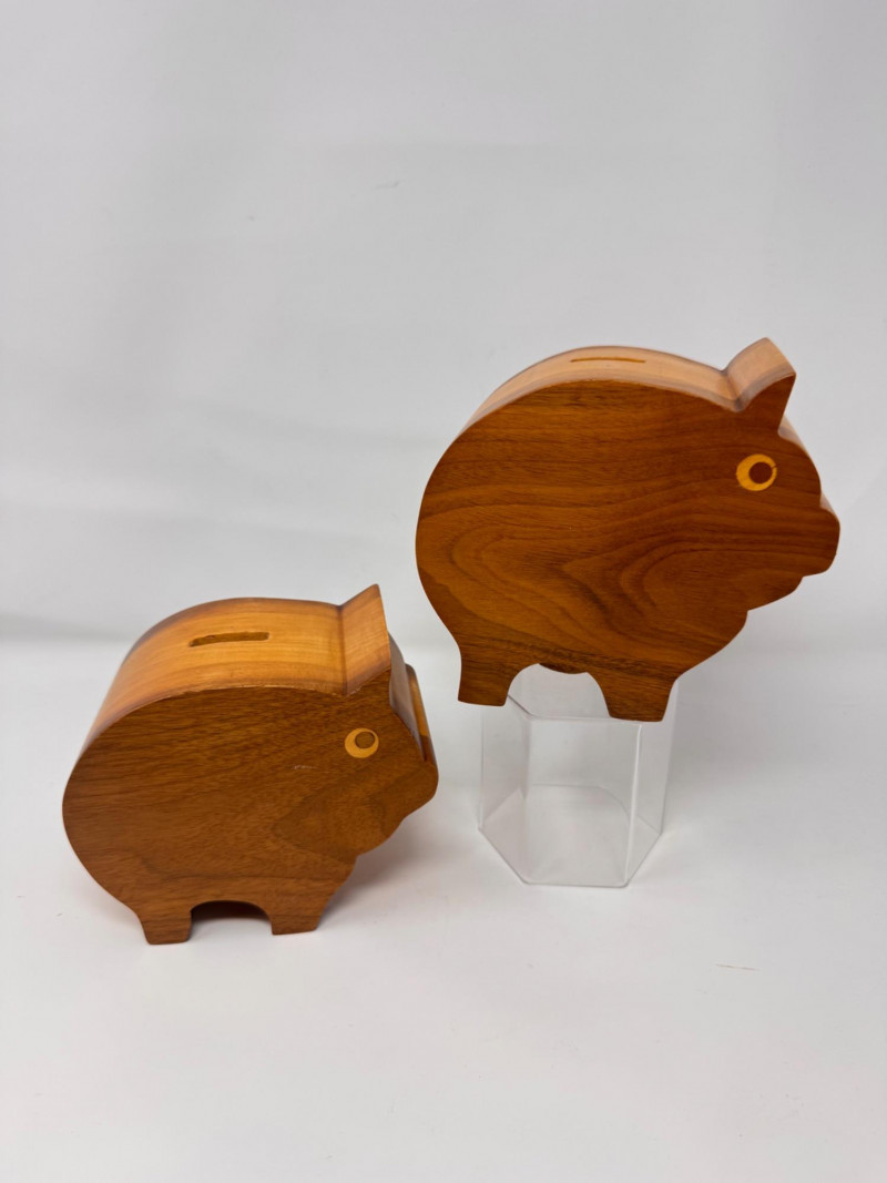 2 Handcrafted Wood Piggy Banks Carved Pig Design.