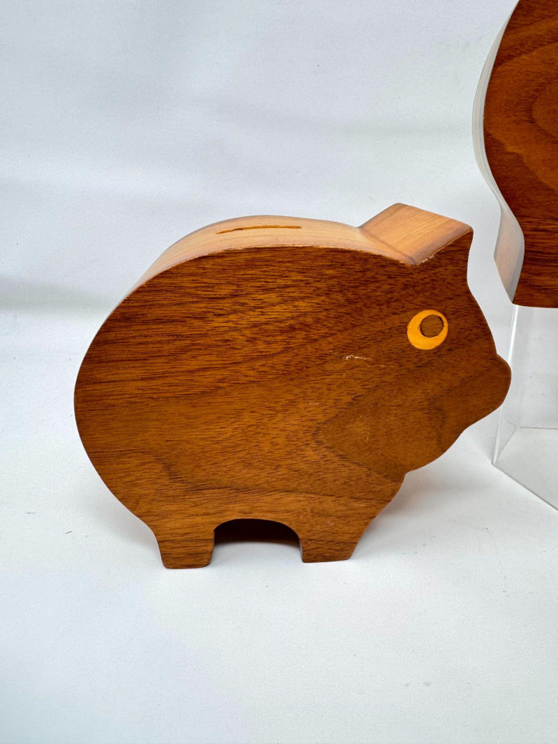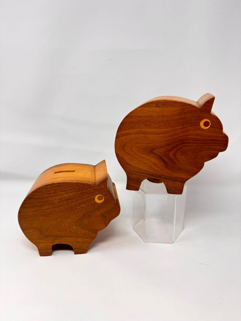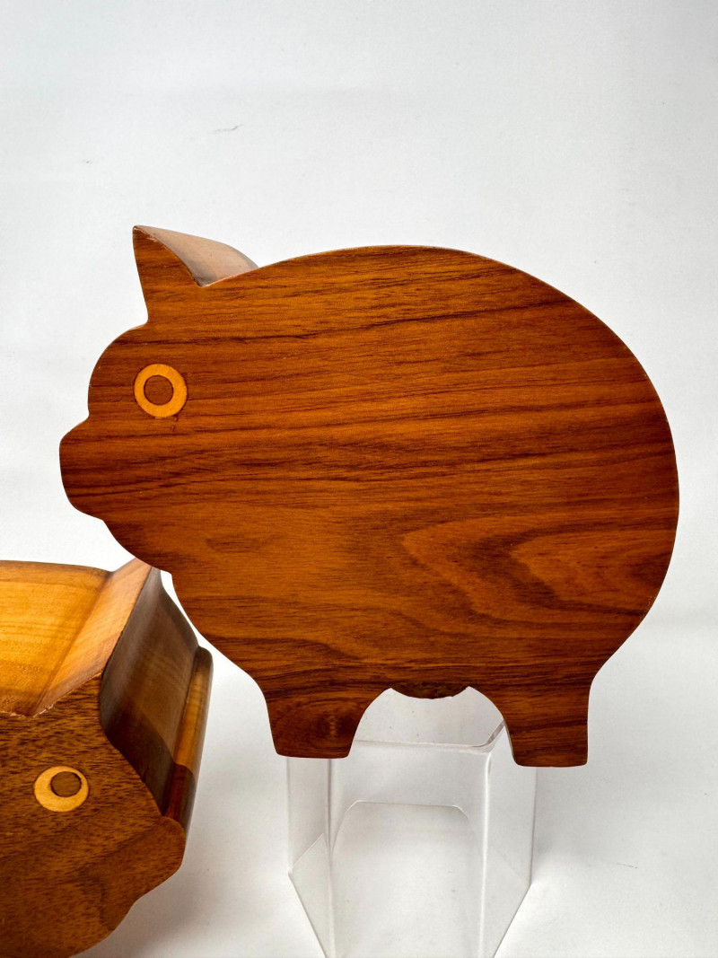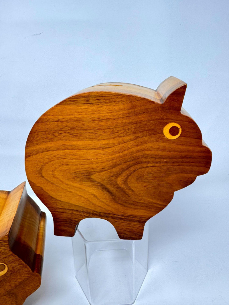 Lot # 17 - 2 Handcrafted Wood Piggy Banks Carved Pig Design