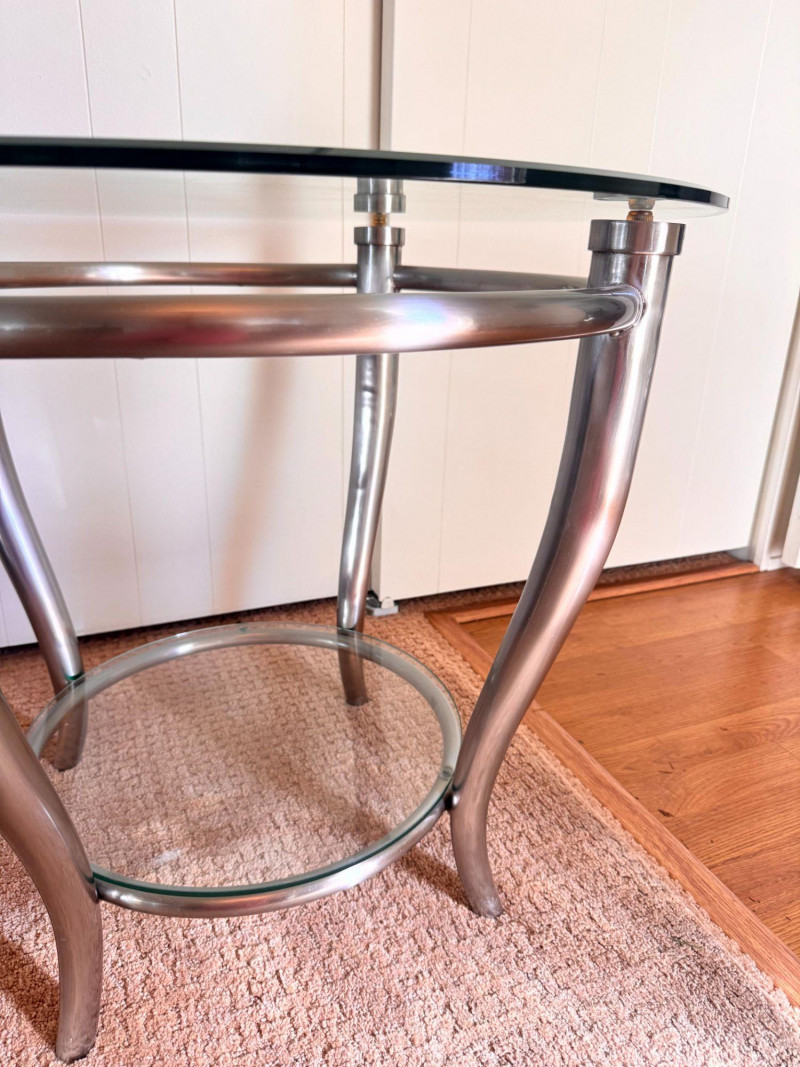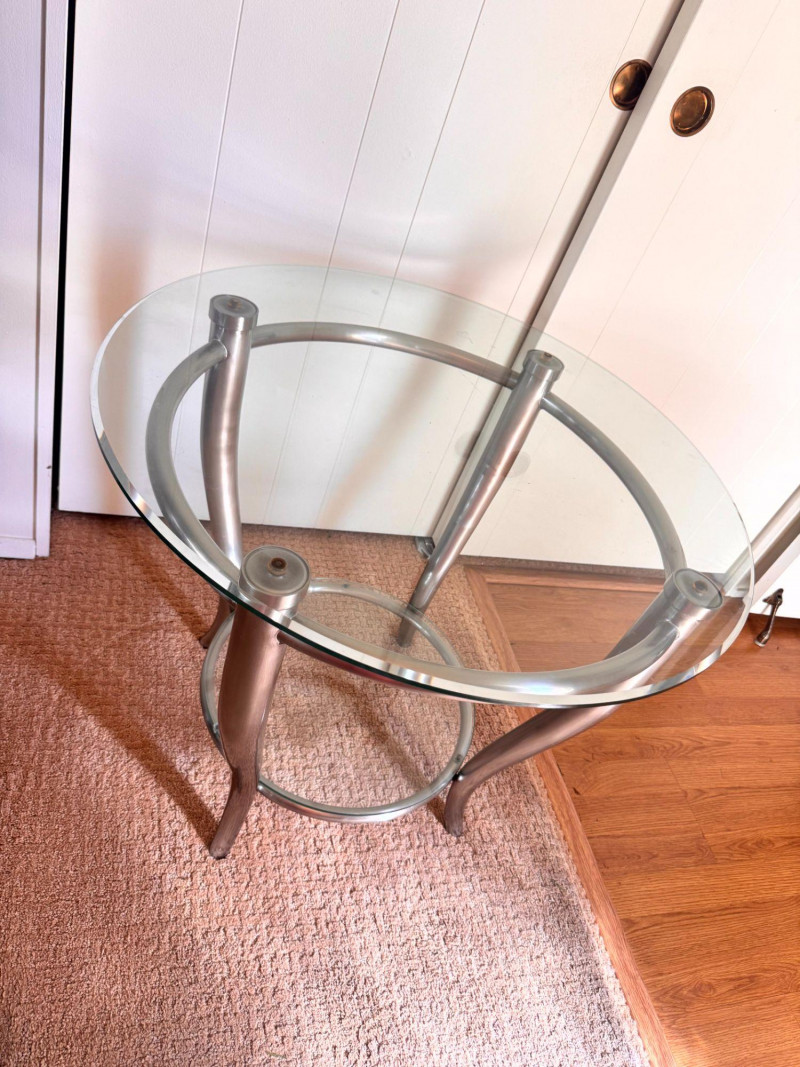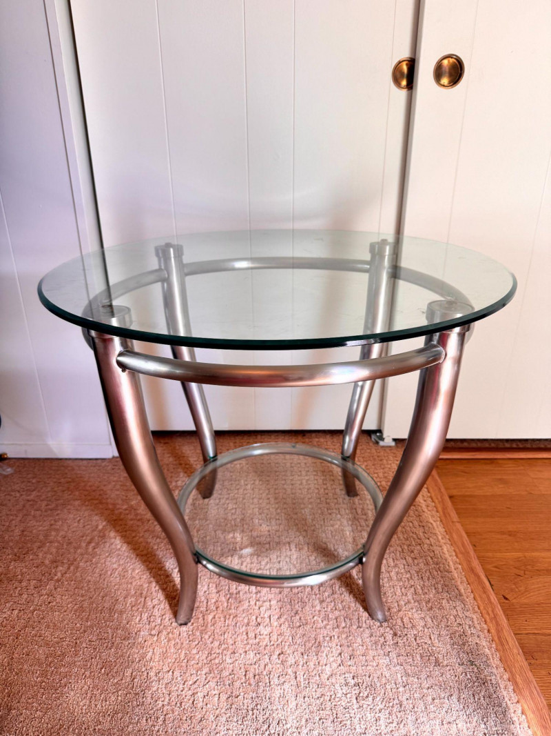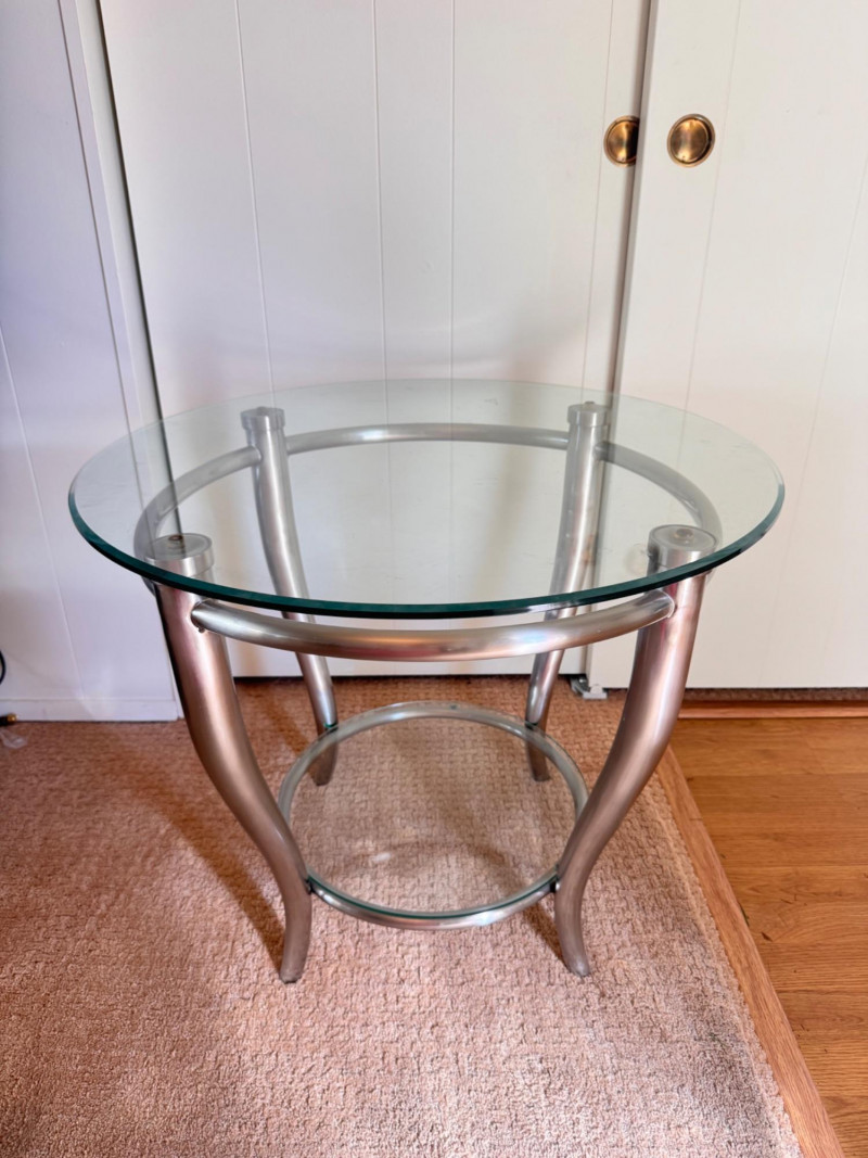Large Round Glass Side Table w/ Brushed Metal Curved Base.