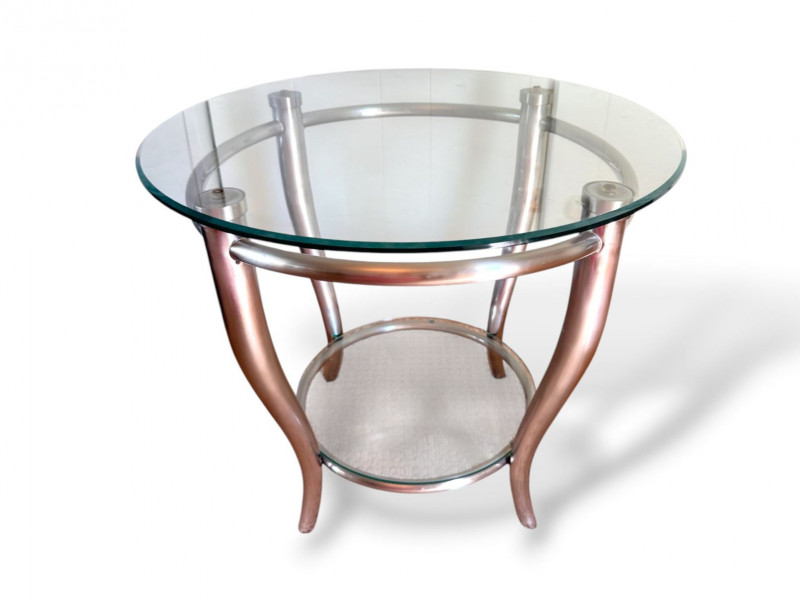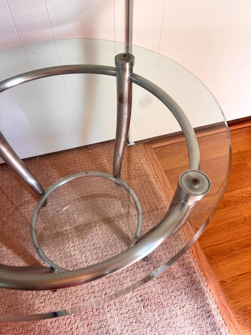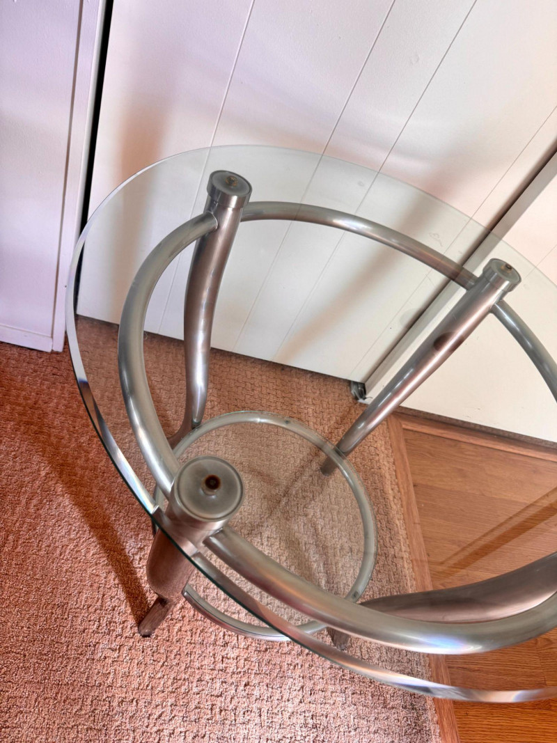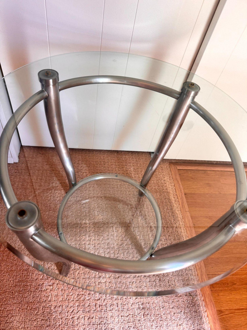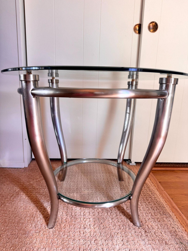 Large Round Glass Side Table w/ Brushed Metal Curved Base.