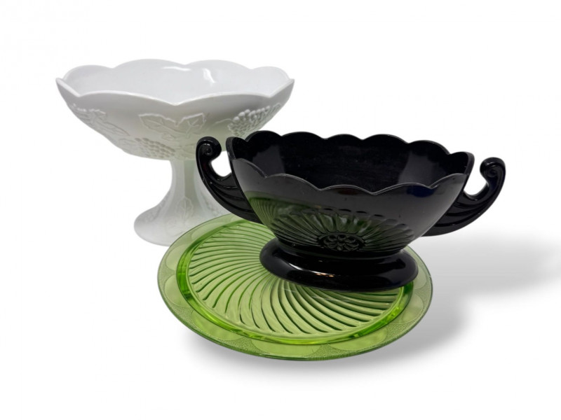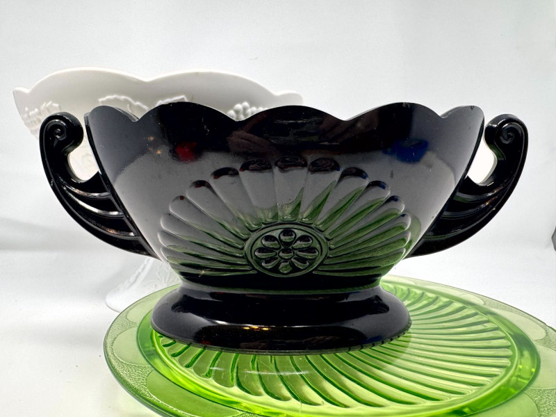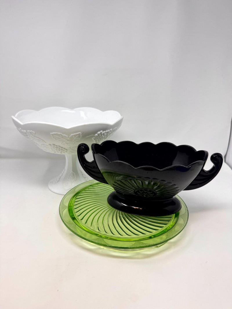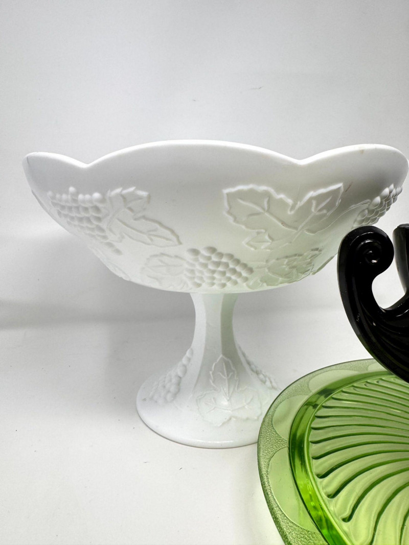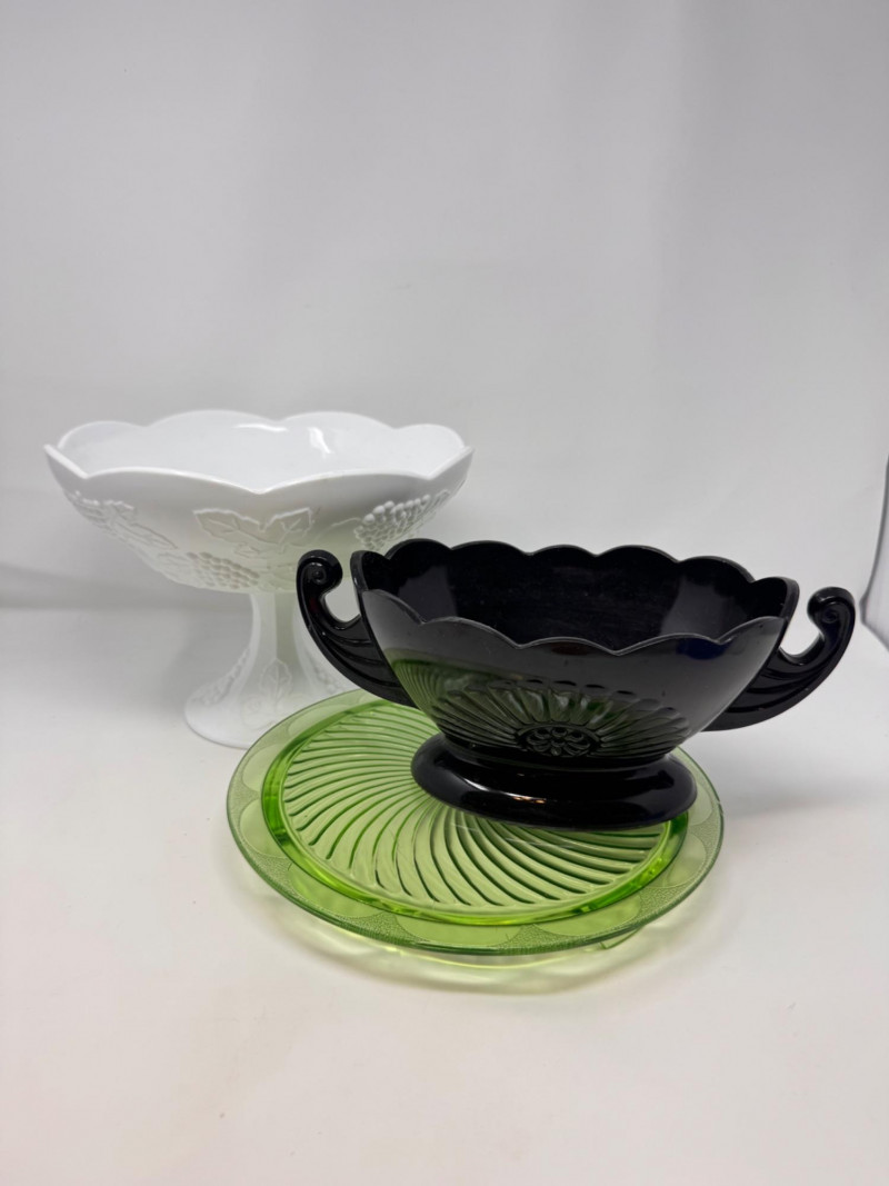 Lot # 37 - Vintage Milk Glass Pedestal, Black Fruit Bowl & Depression Glass Plate