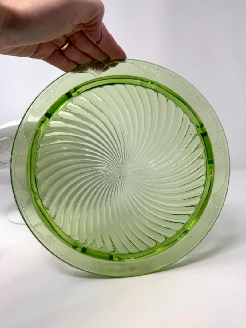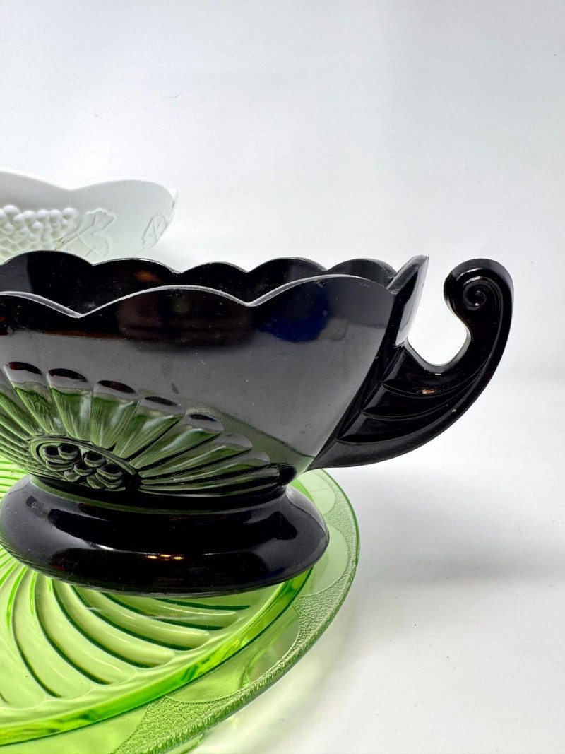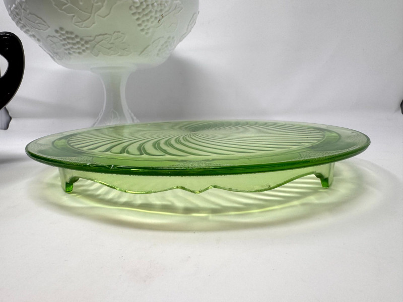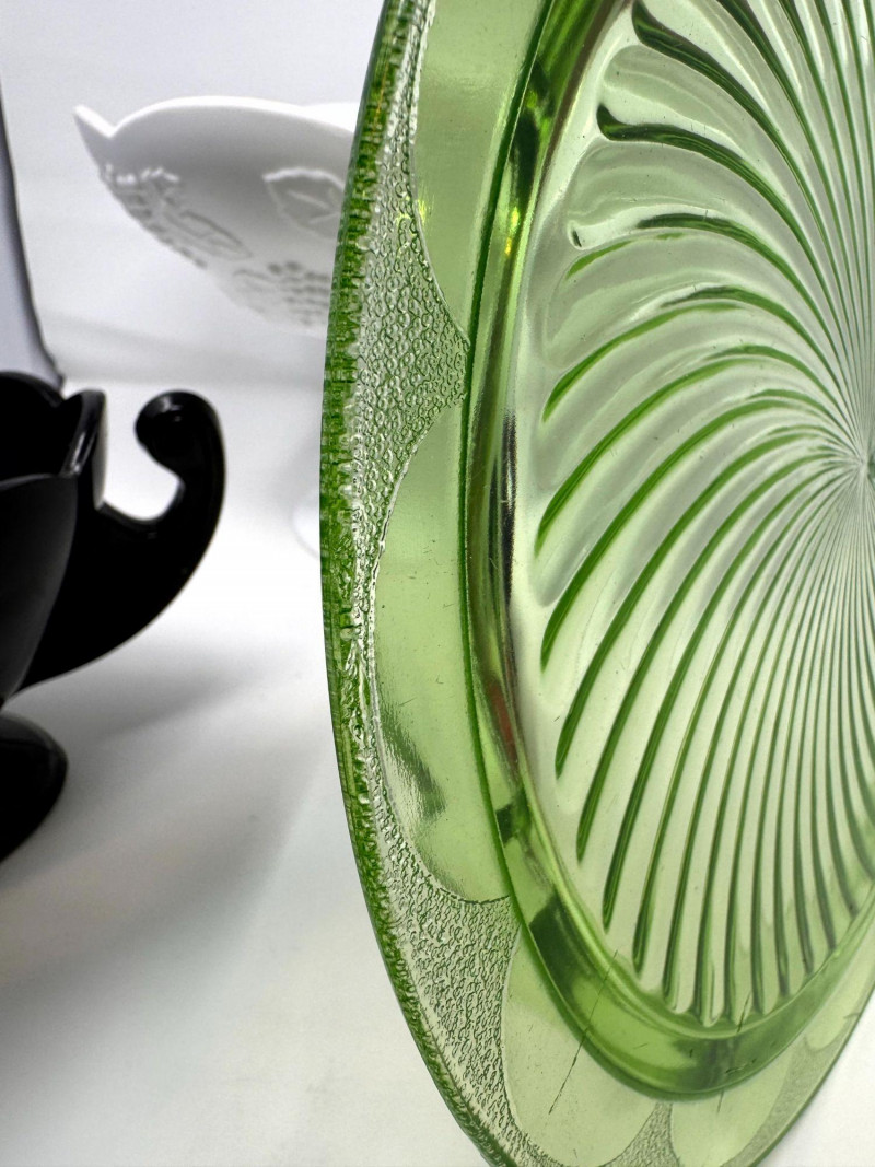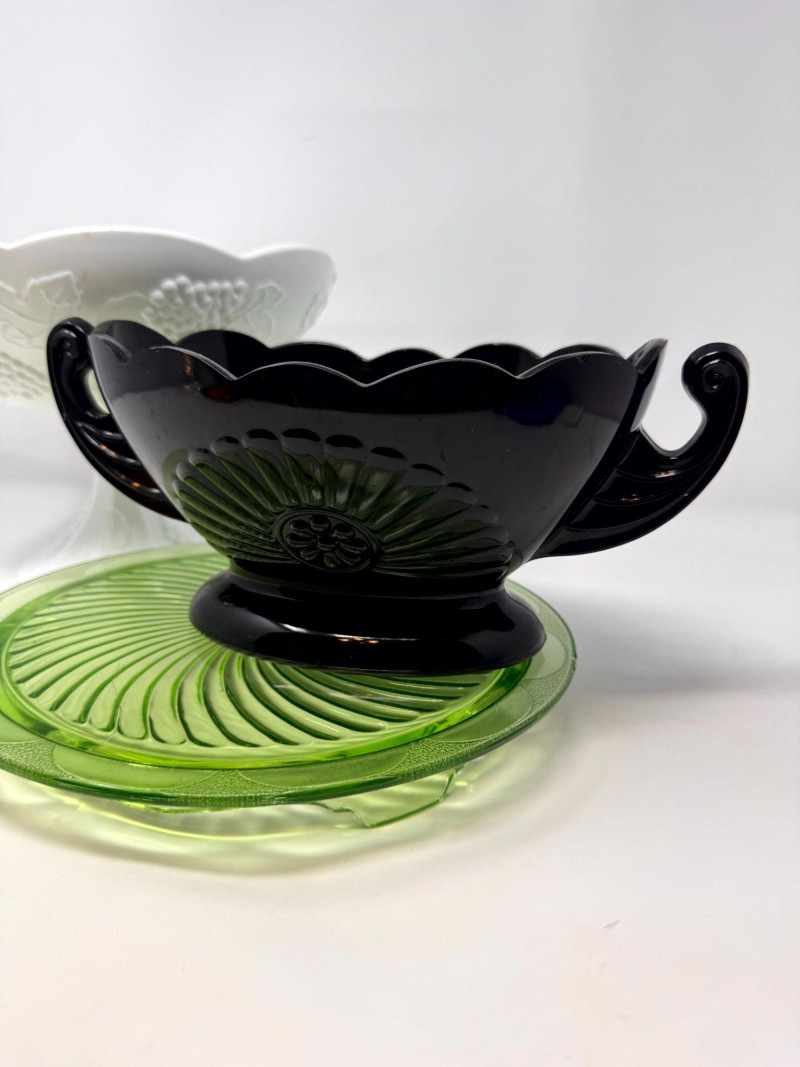 Lot # 37 - Vintage Milk Glass Pedestal, Black Fruit Bowl & Depression Glass Plate