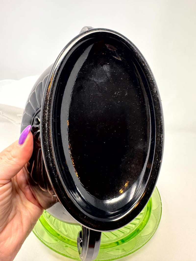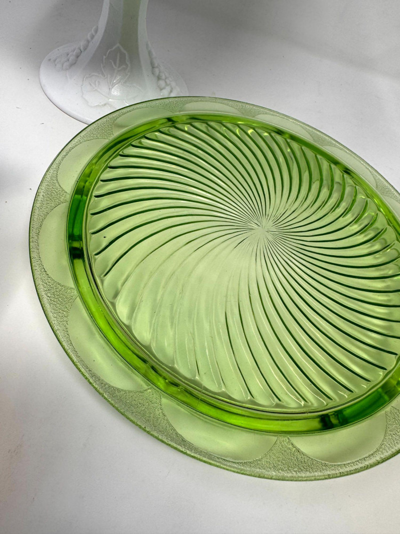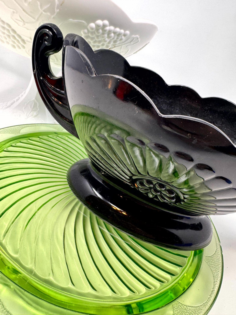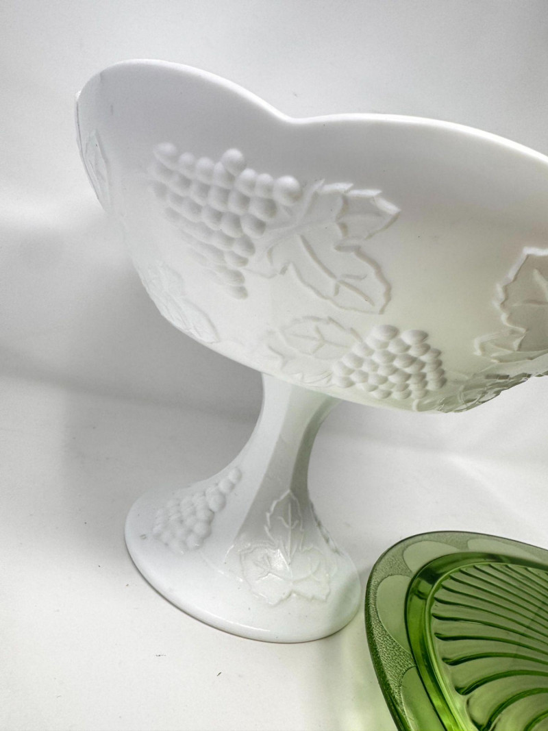 Vintage Milk Glass Pedestal, Black Fruit Bowl & Depression Glass Plate.