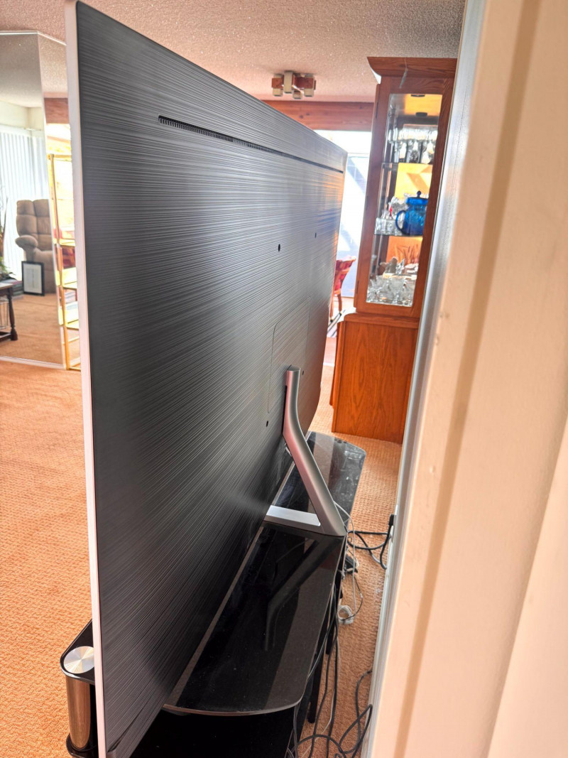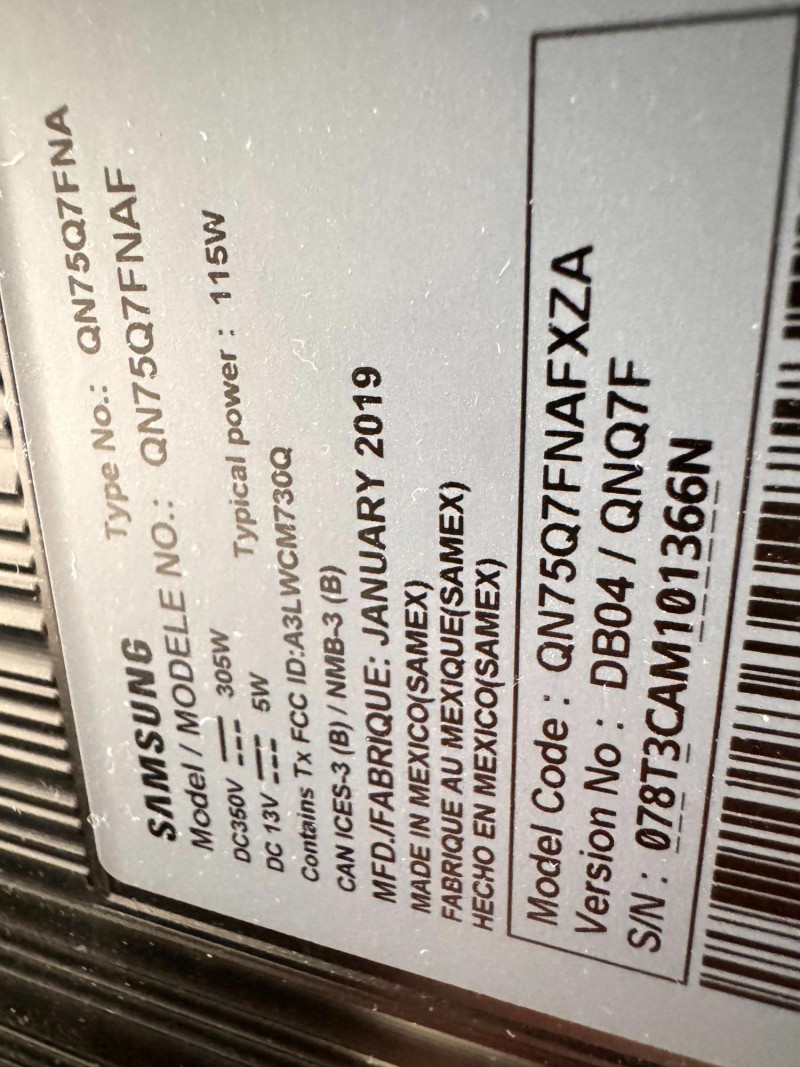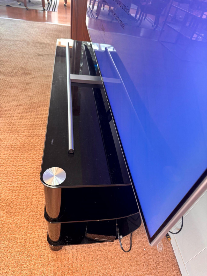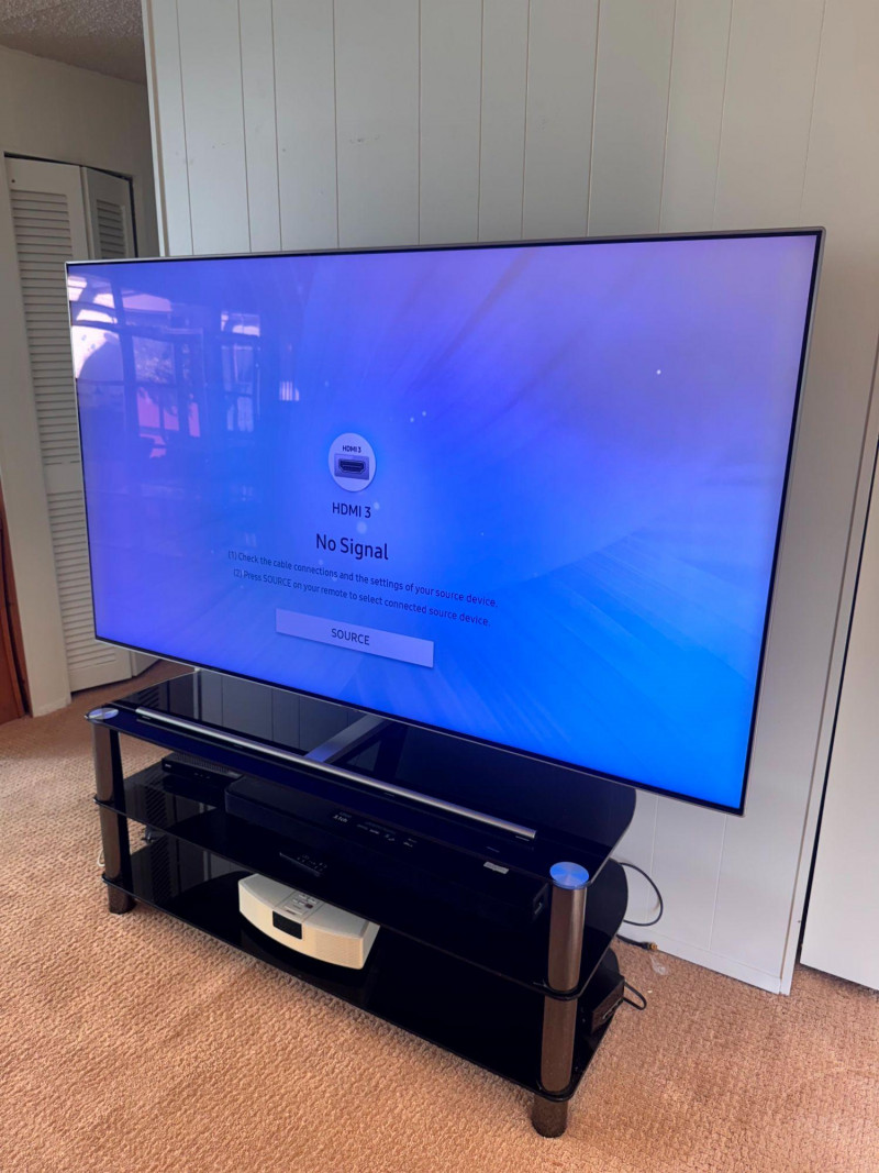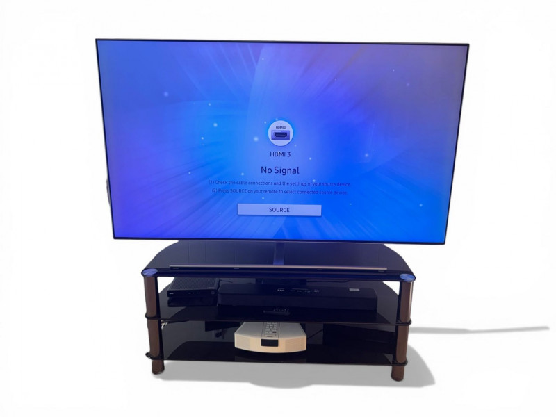 Samsung 75” QLED TV w/ Tempered Glass Stand - Works Great! Bidding on this lot is an agreement that: (1.) You will have at least 2 capable, able bodied persons to lift and load at a minimum. (2.) You will bring a hand truck and/or any other tools needed to remove this item. If these steps are not followed your item will be forfeit and no refund given.