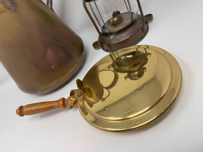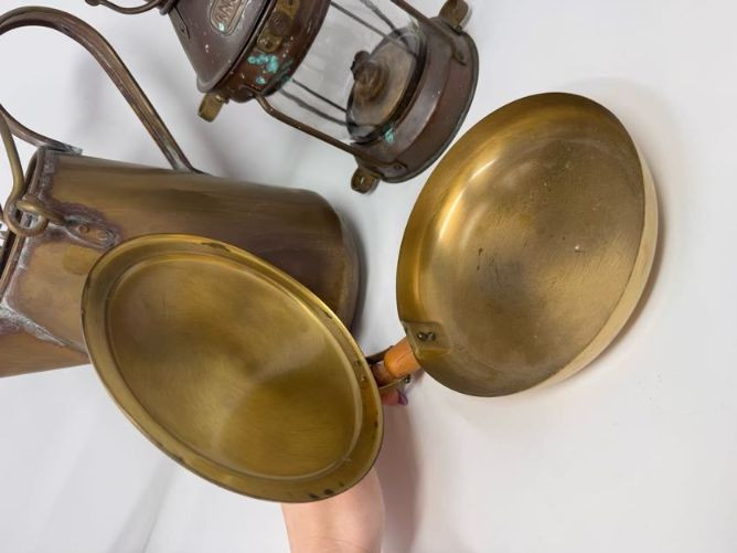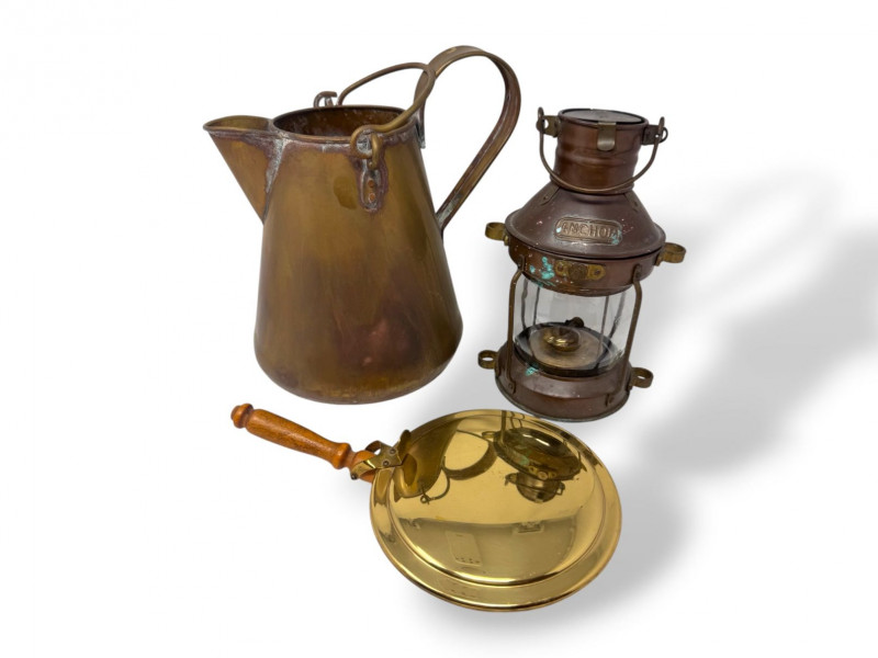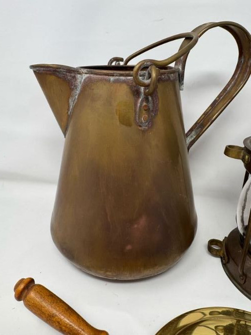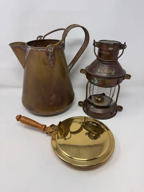 Copper Pitcher Made in Holland w/ Anchor Lantern & Brass Bed Warmer.