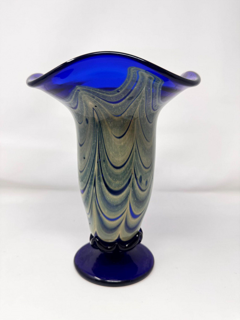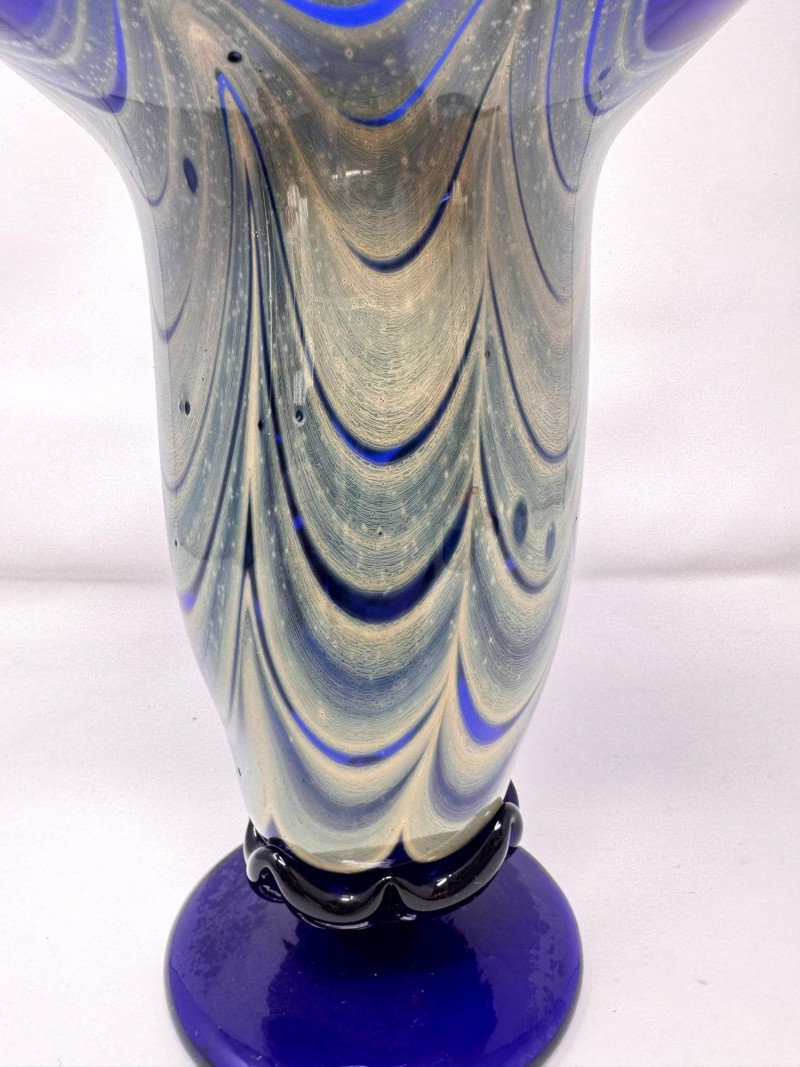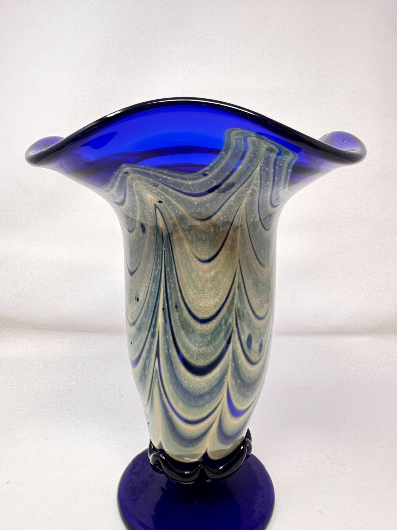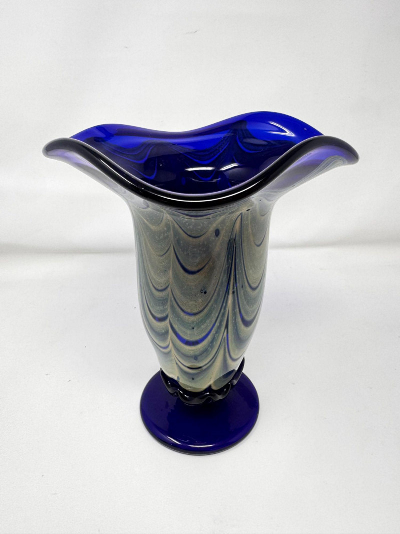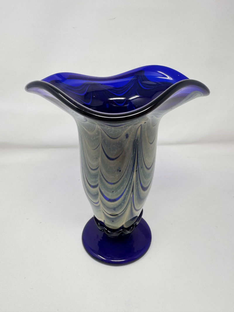 Lot # 54 - Signed Blown Glass Art Vase - Blue Swirl & Ruffled Rim