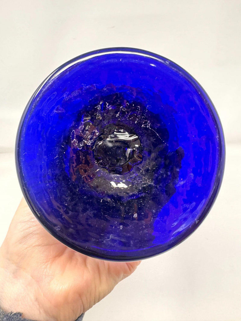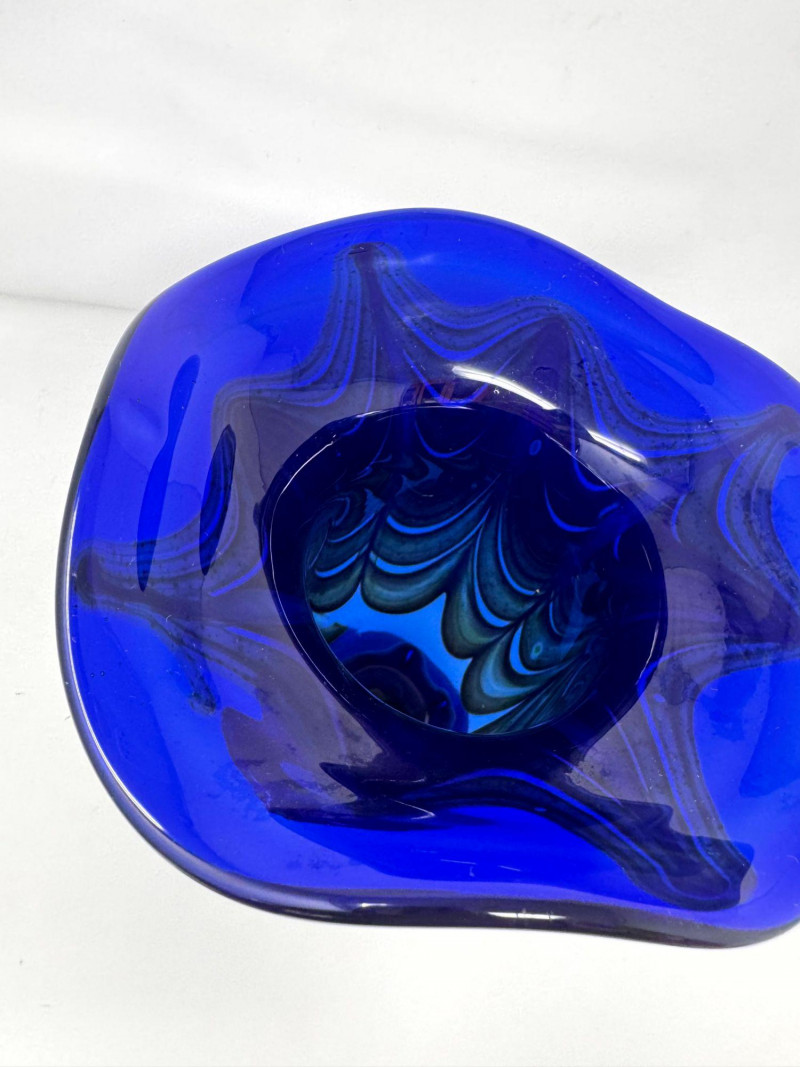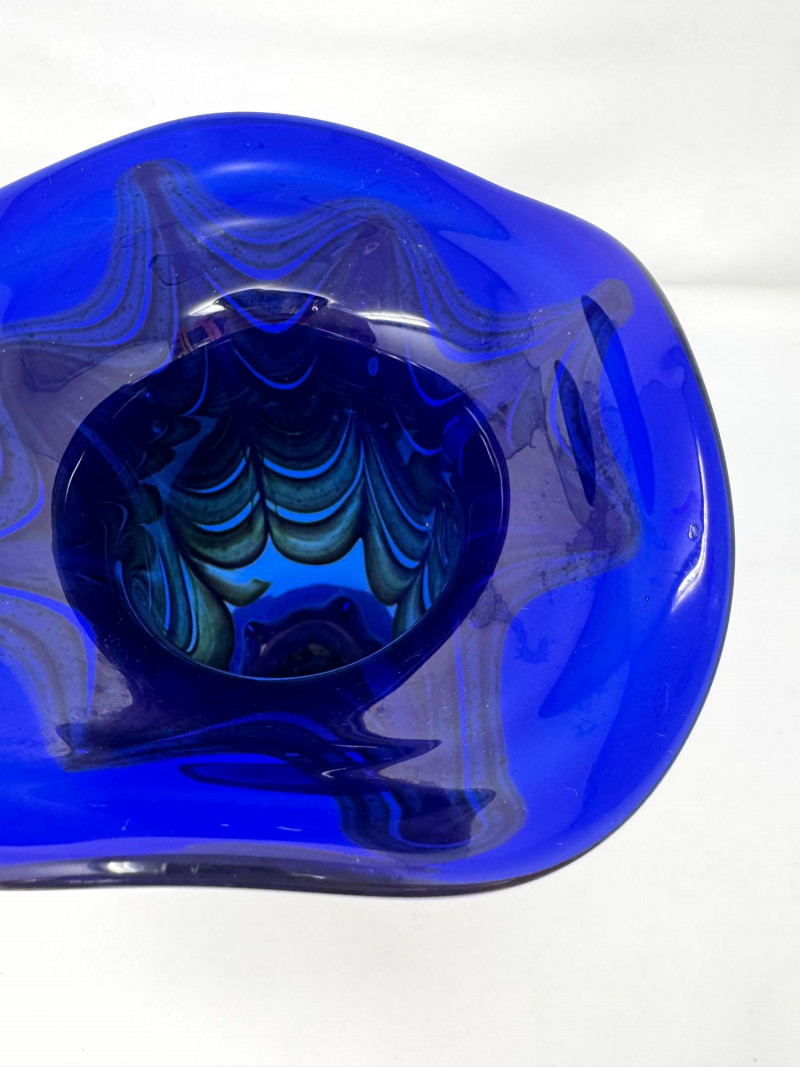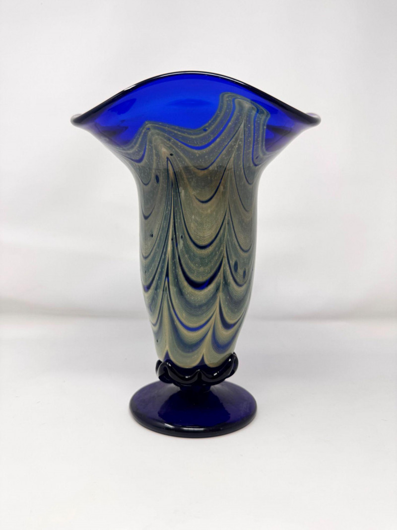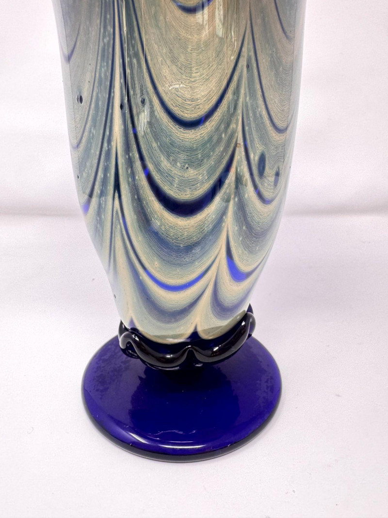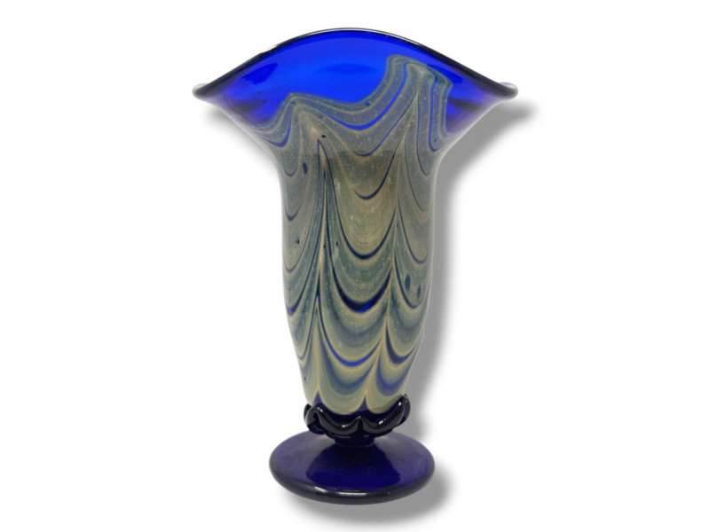 Lot # 54 - Signed Blown Glass Art Vase - Blue Swirl & Ruffled Rim