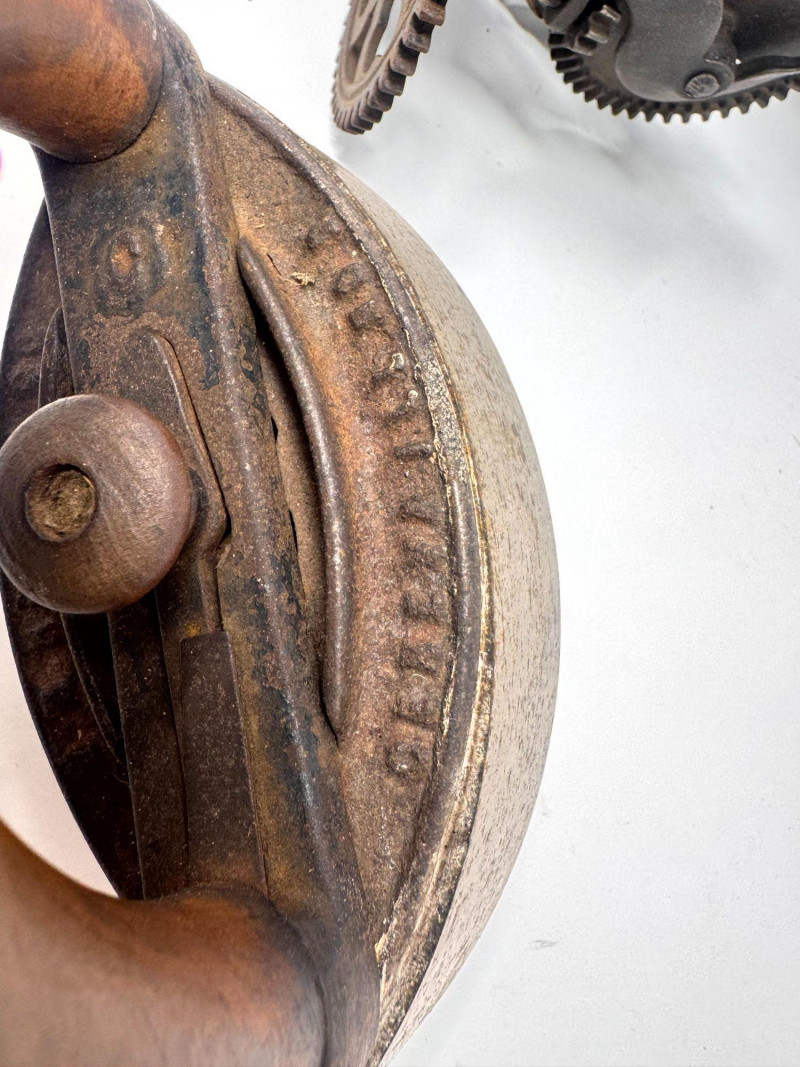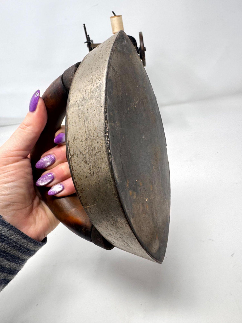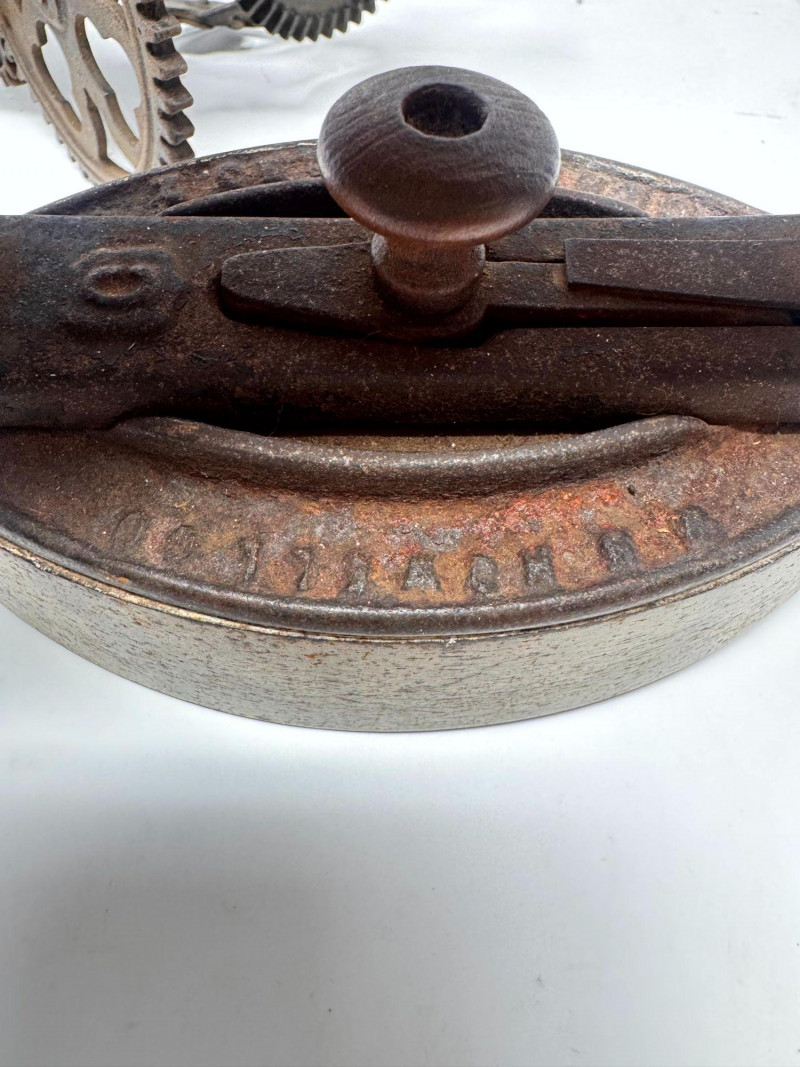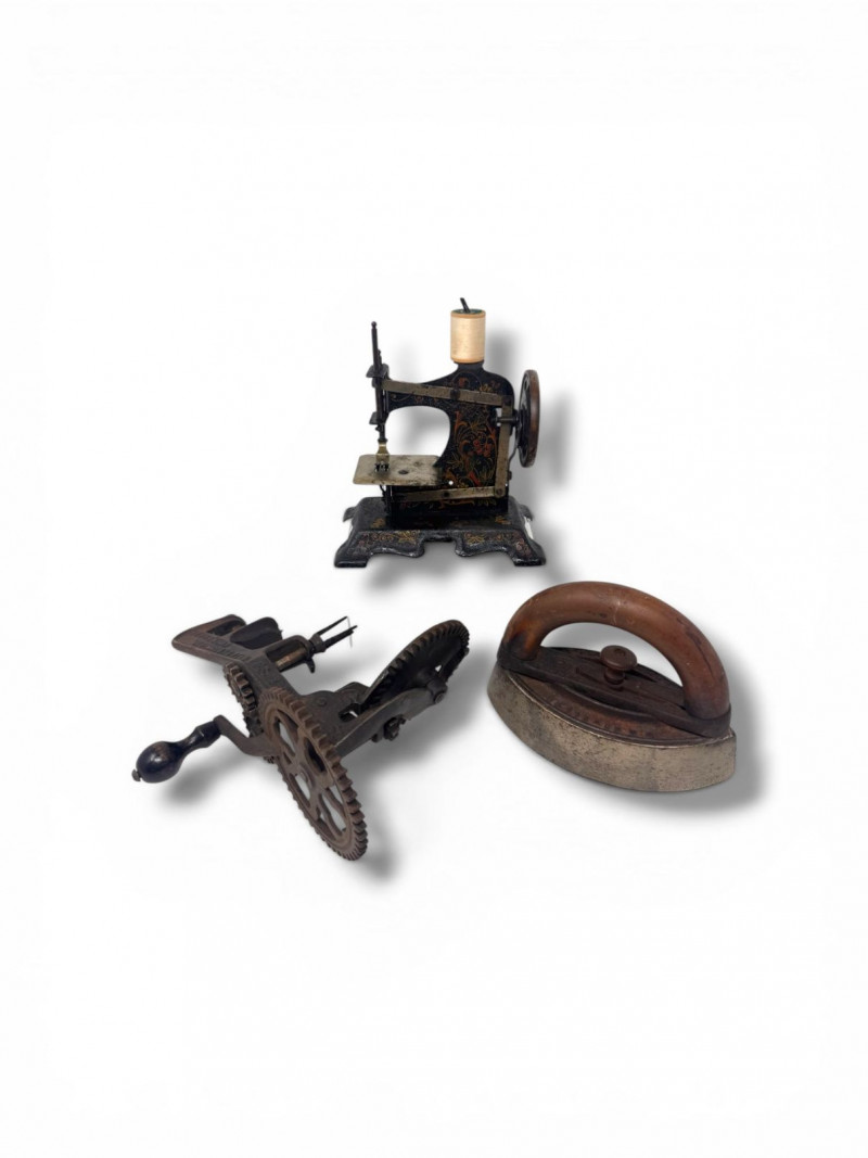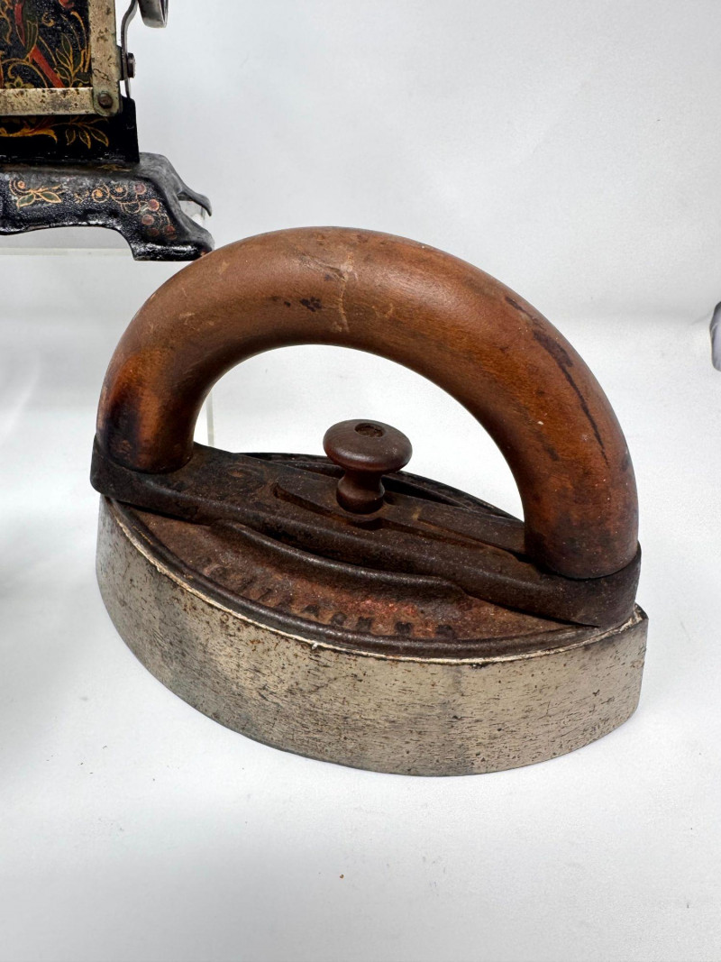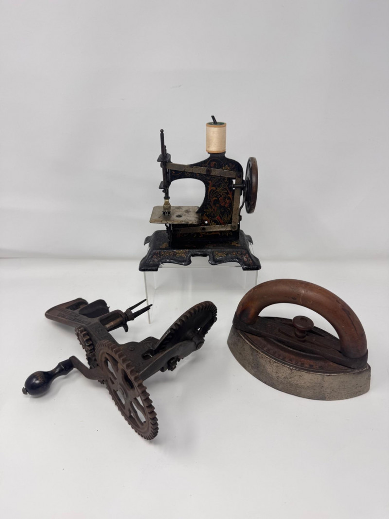 Antique Sewing Machine, Sad Iron & Cast Iron Apple Peeler.