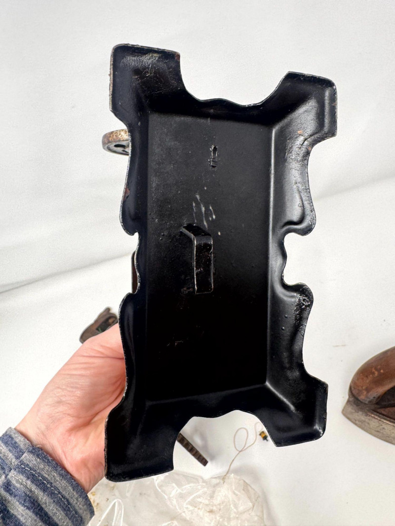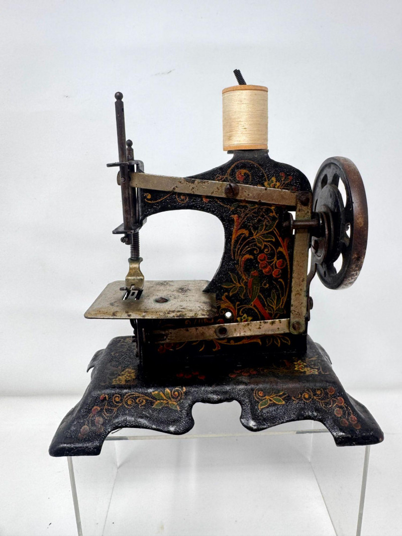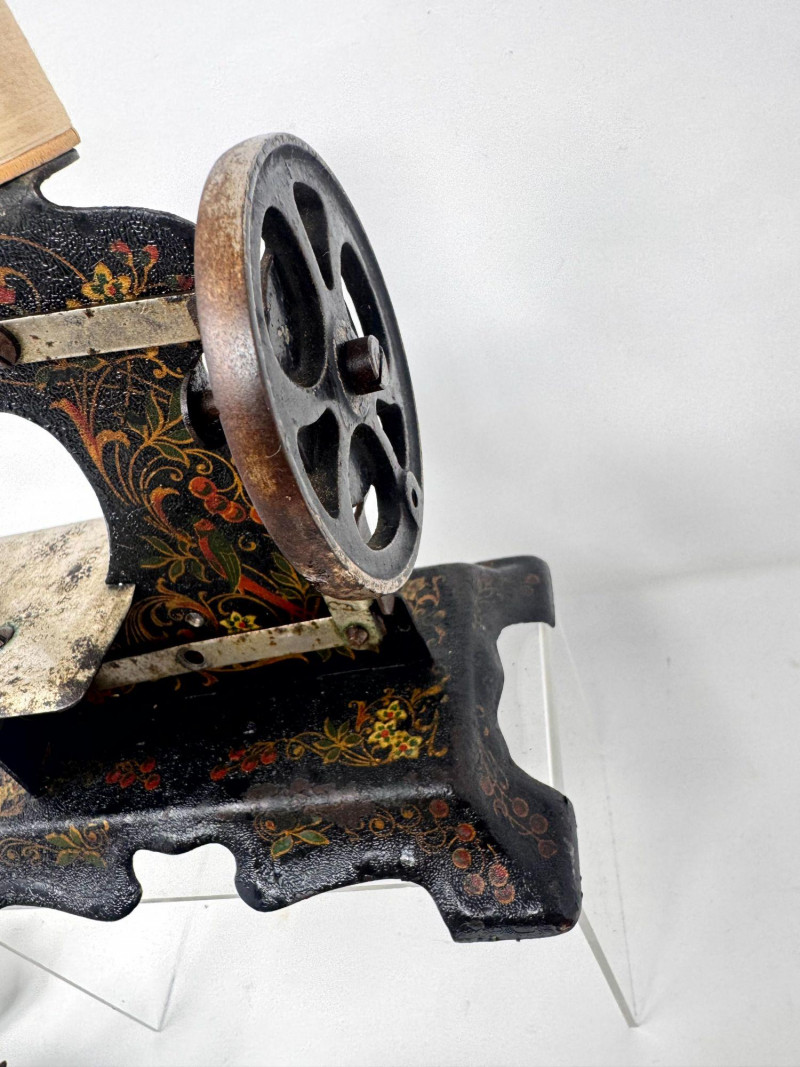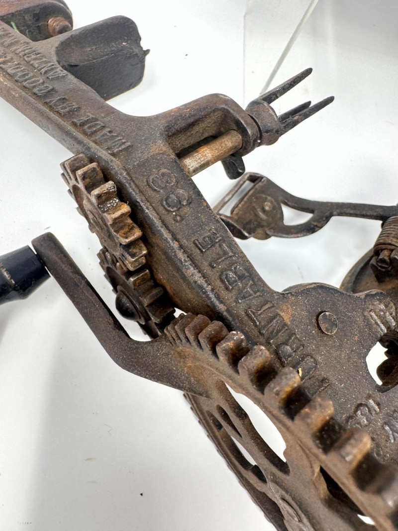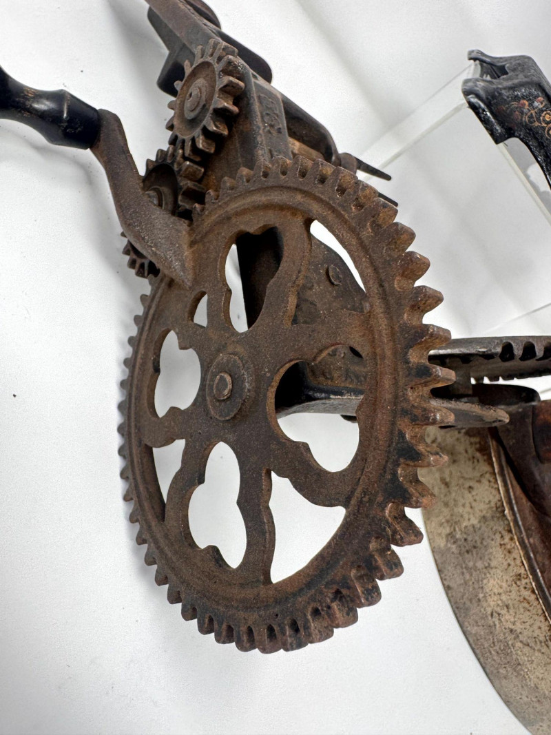 Antique Sewing Machine, Sad Iron & Cast Iron Apple Peeler.