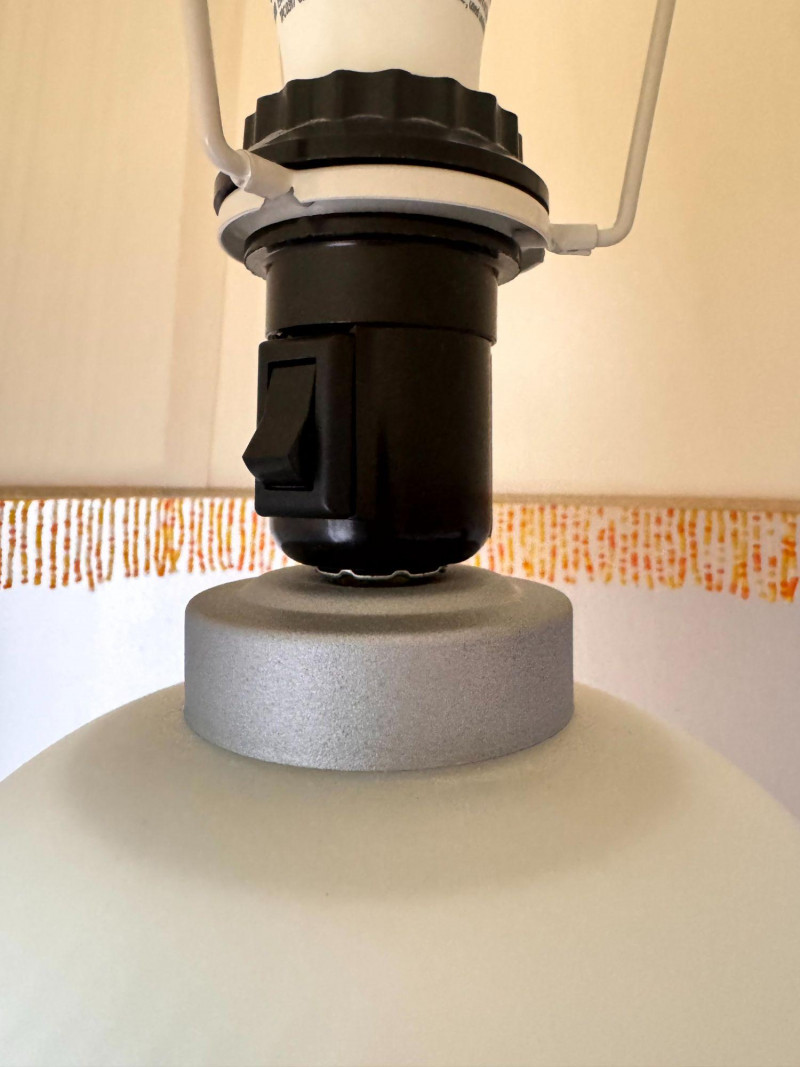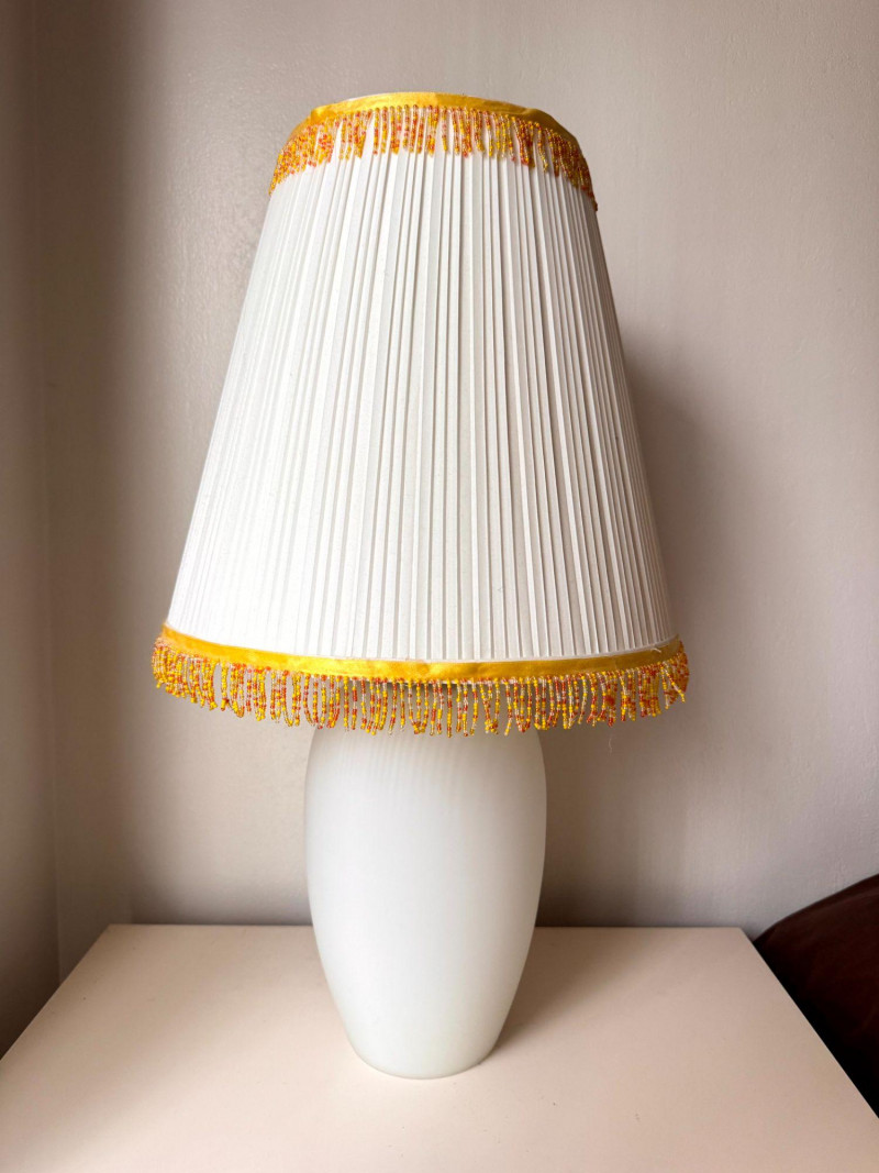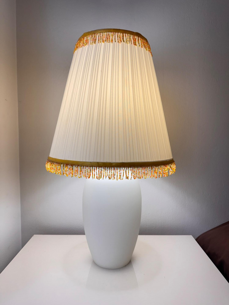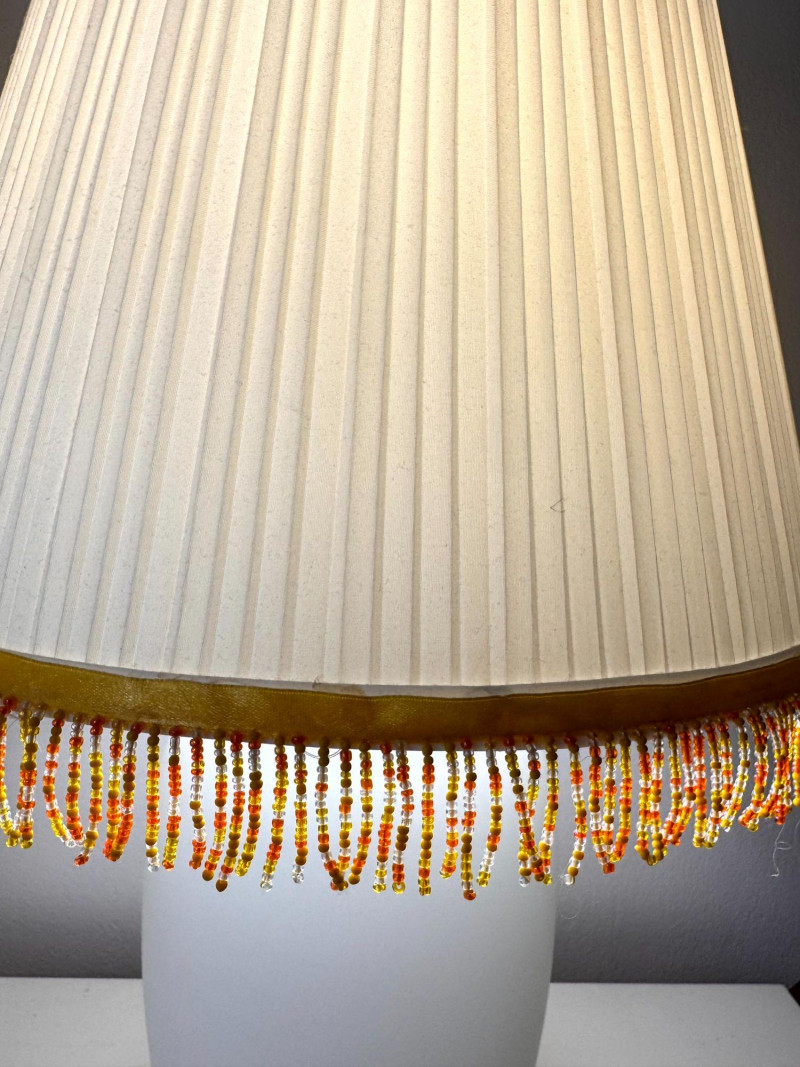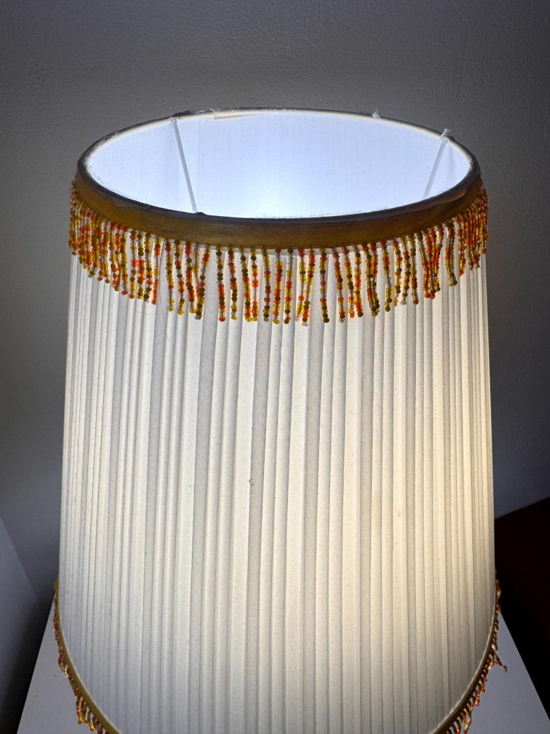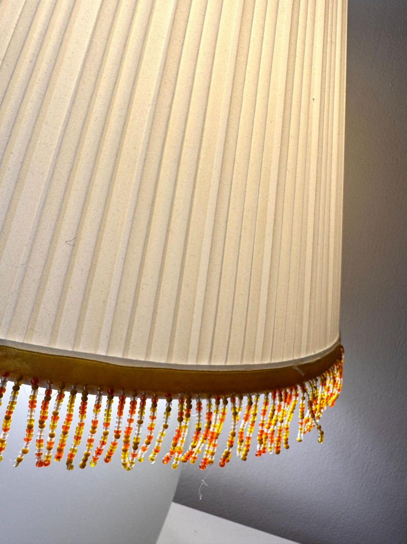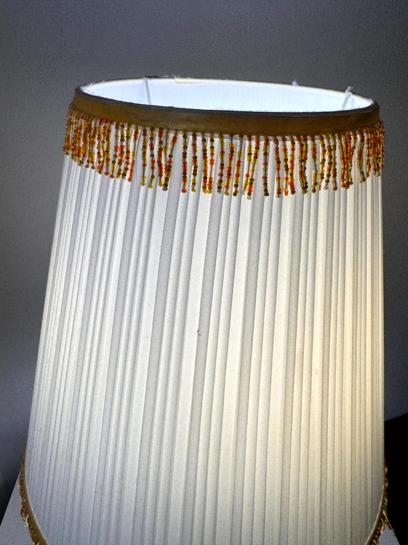 Vintage Glass Base Table Lamp w/ Pleated Shade & Beaded Fringe.