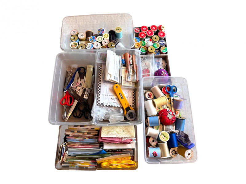 Lot # 71 - Sewing Supplies w/ Thread, Spools, Fabric, Scissors, Tools +