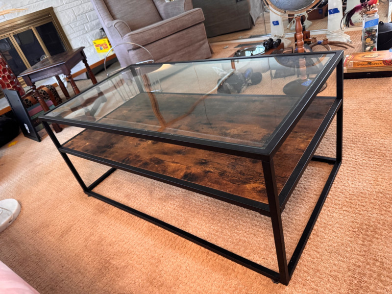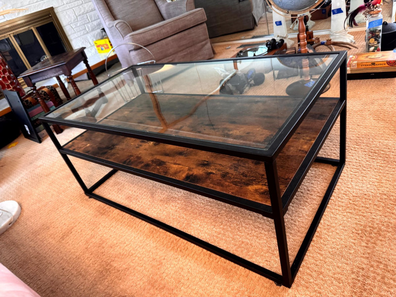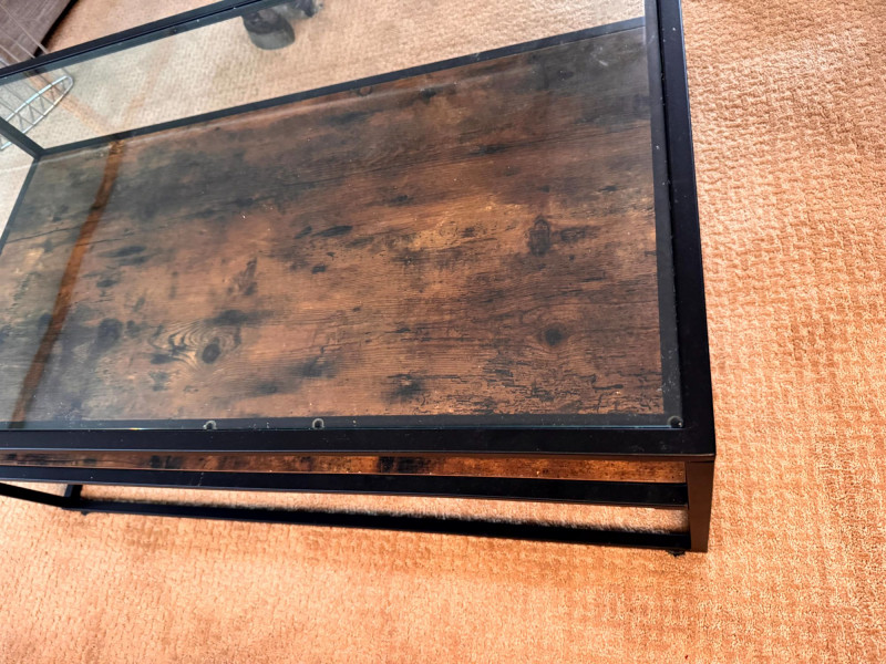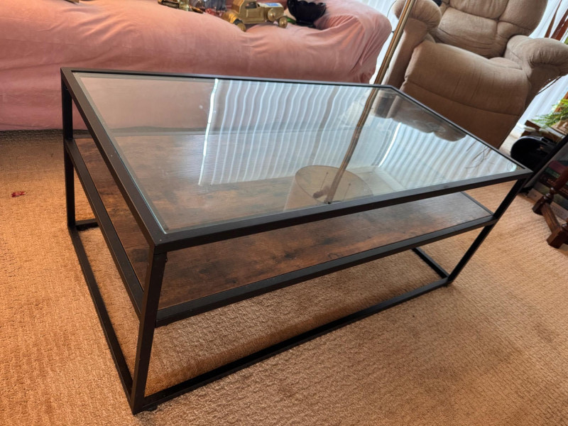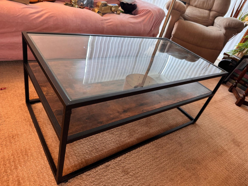 Glass Top Coffee Table w/ Metal Frame & Manufactured Wood Shelf.