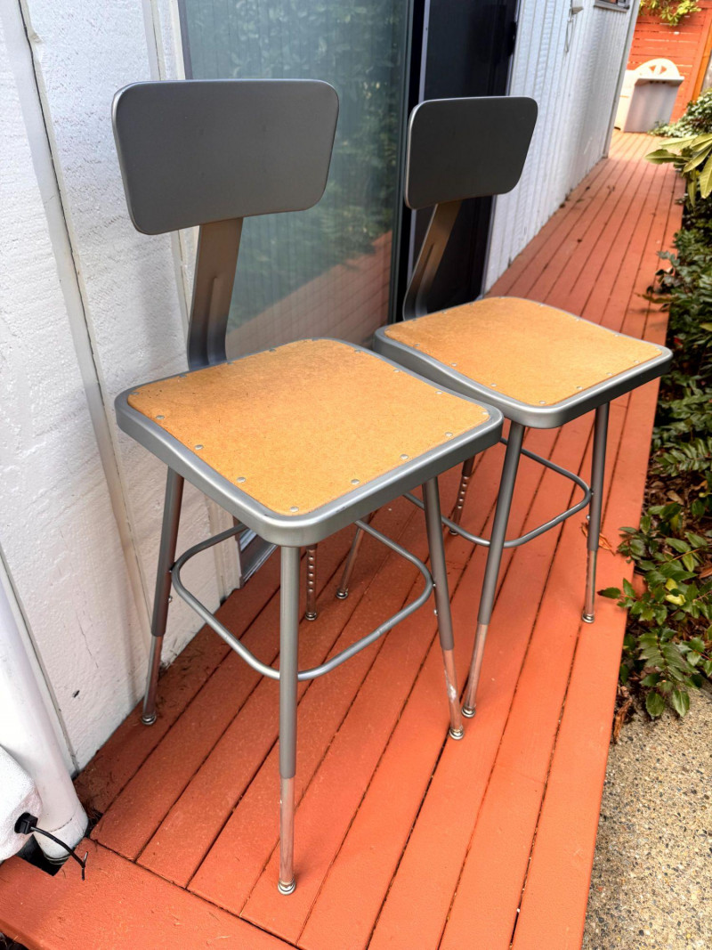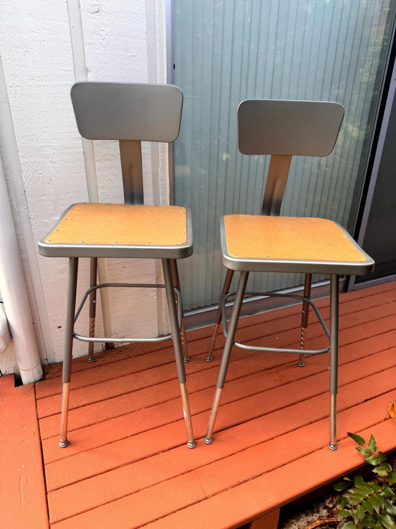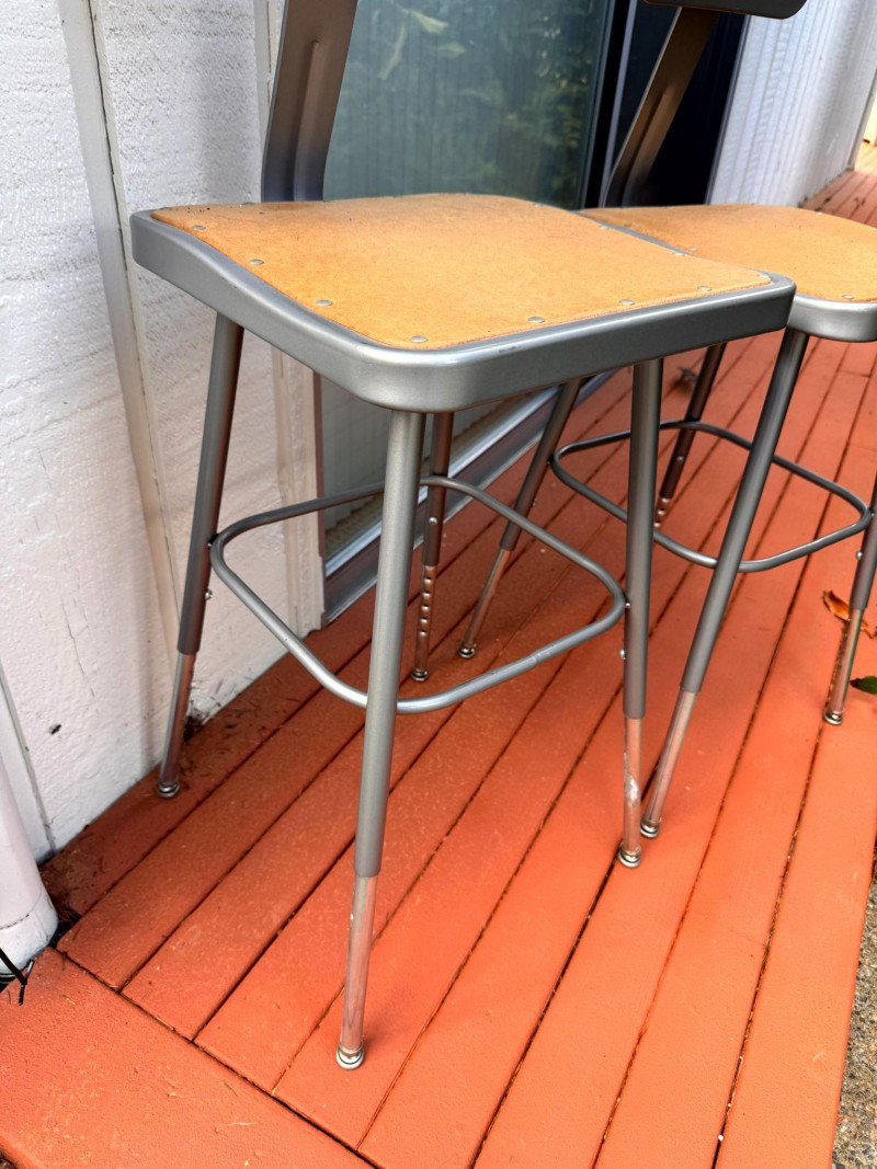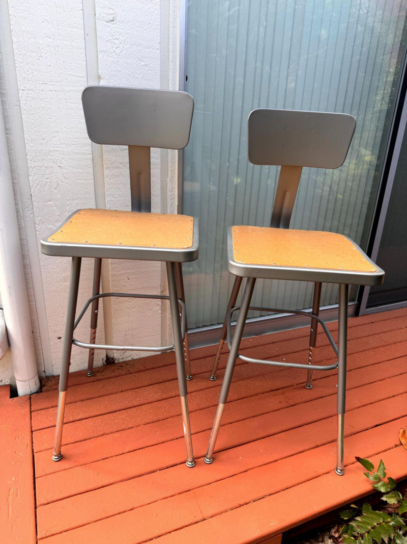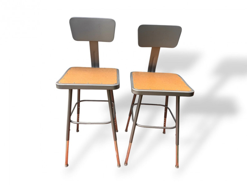 Pair of Industrial Shop Stools – Metal Frame, Square Seat w/ Footrests.