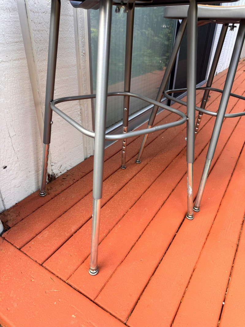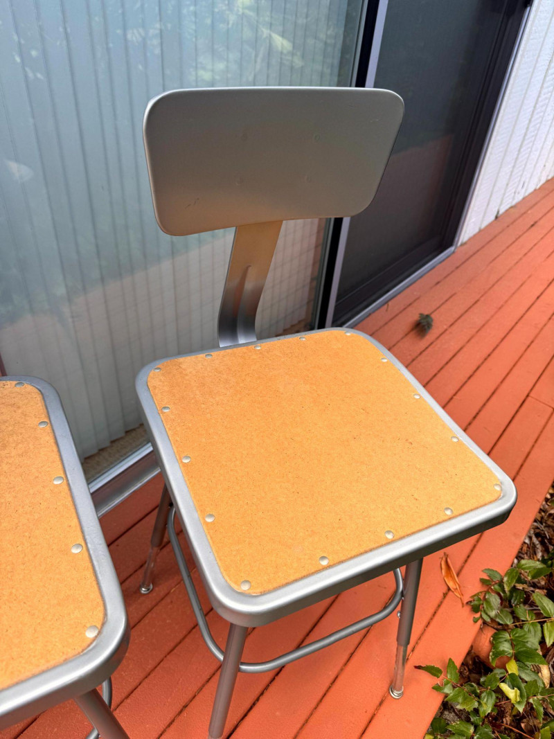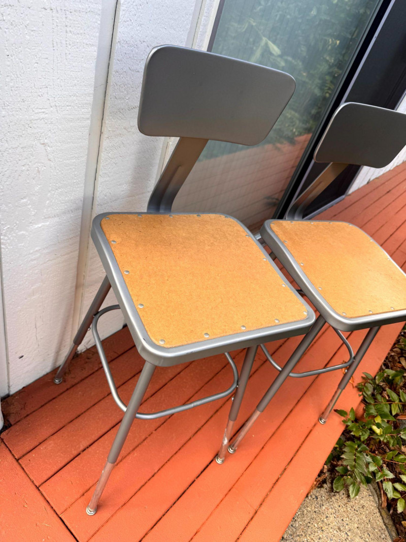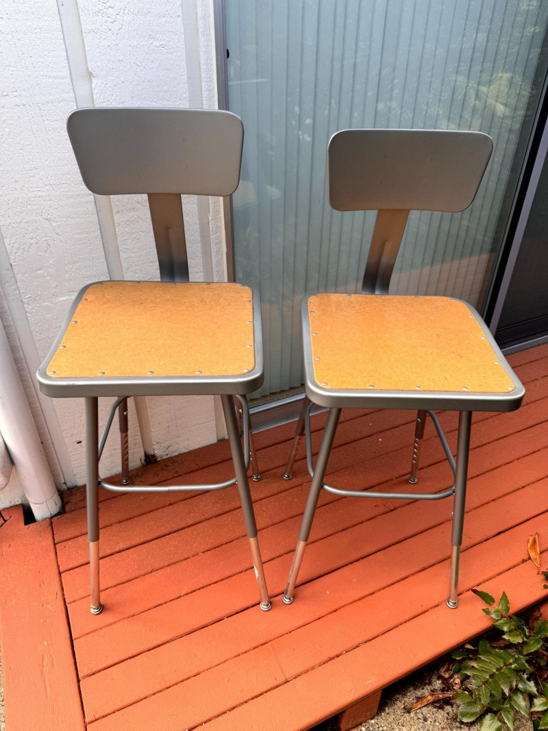 Pair of Industrial Shop Stools – Metal Frame, Square Seat w/ Footrests.
