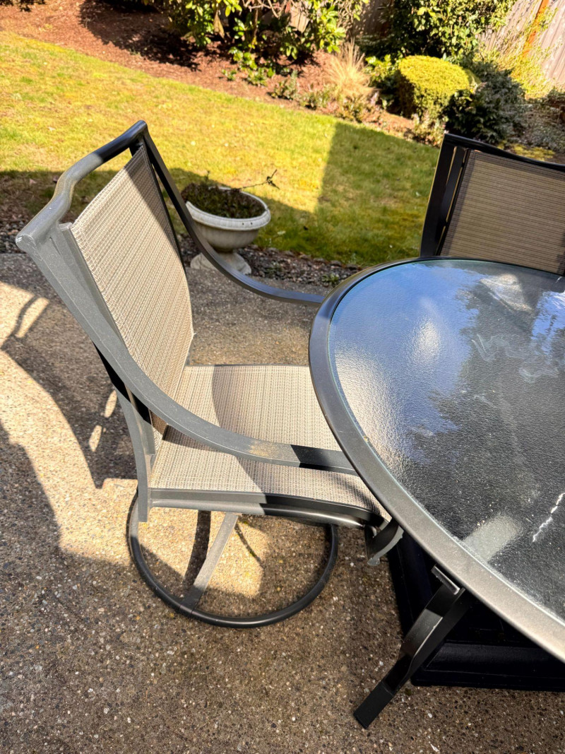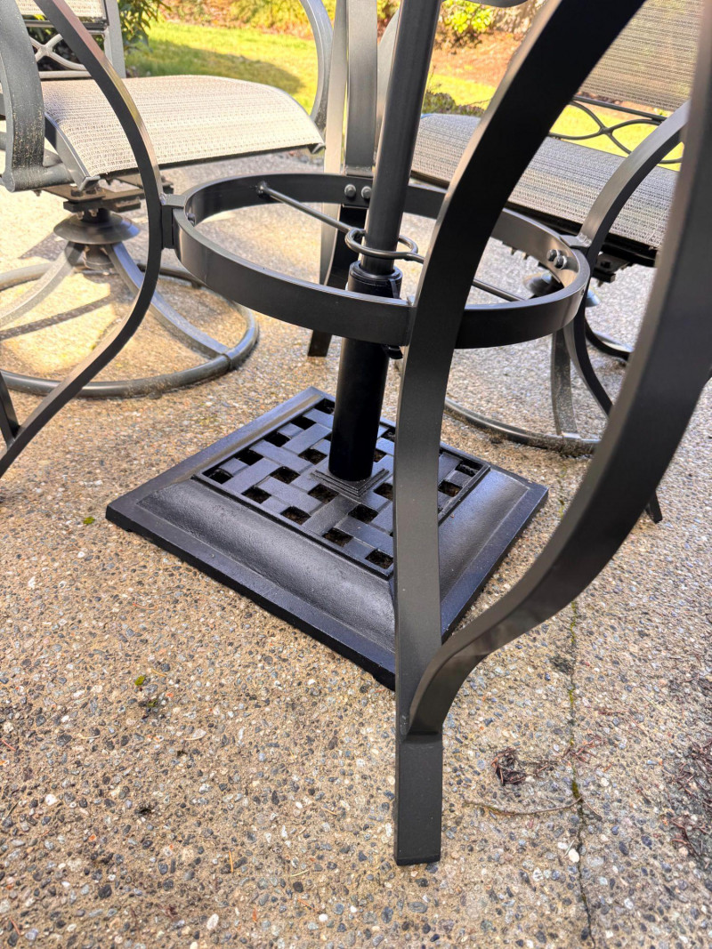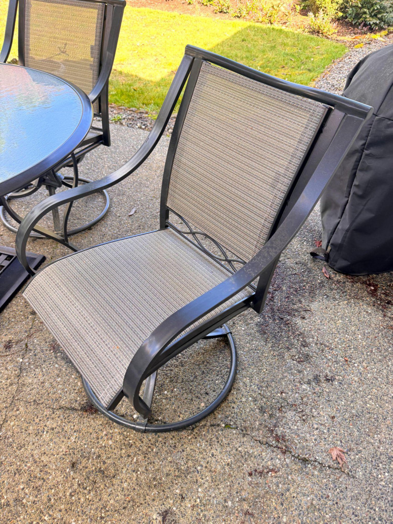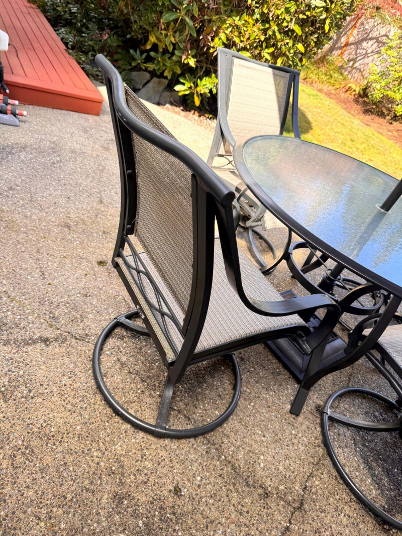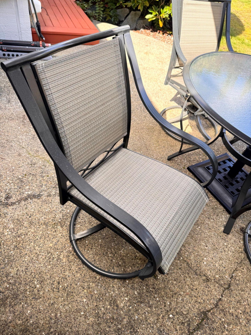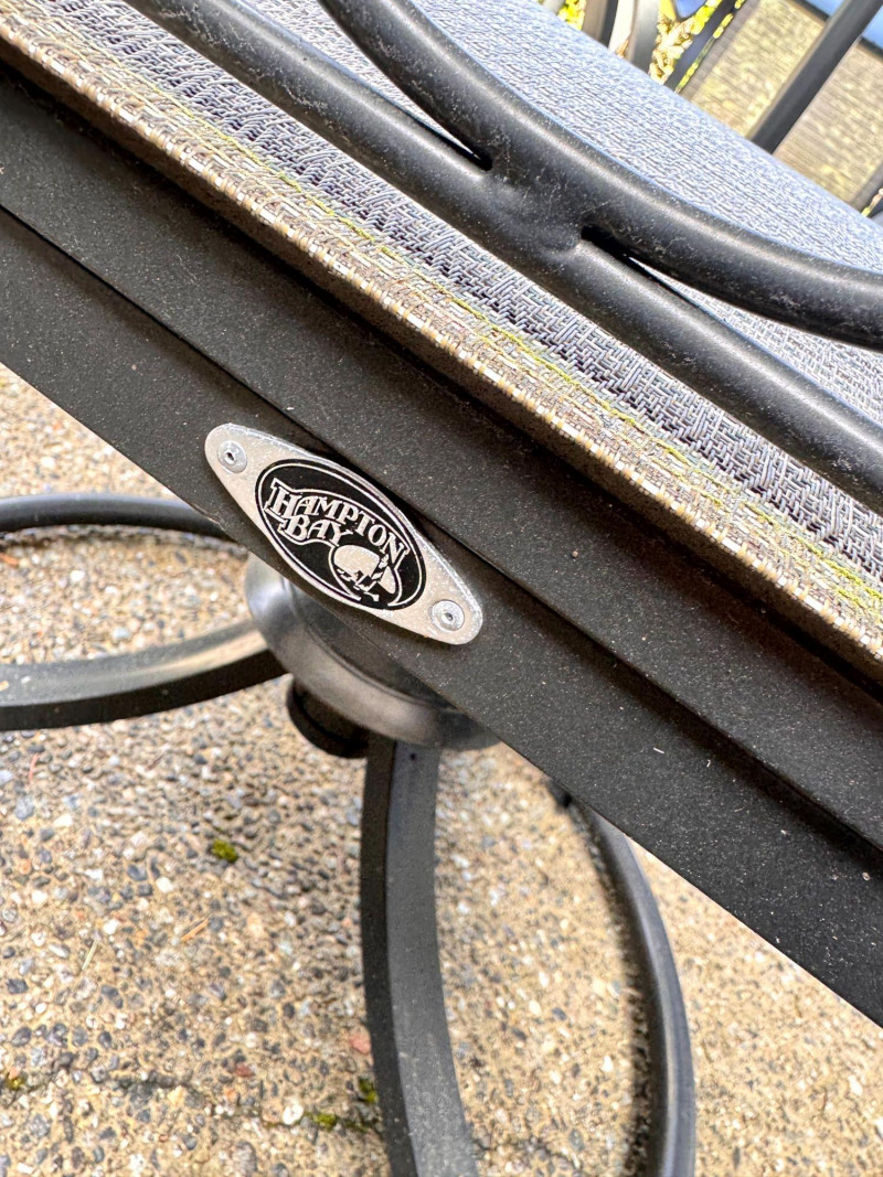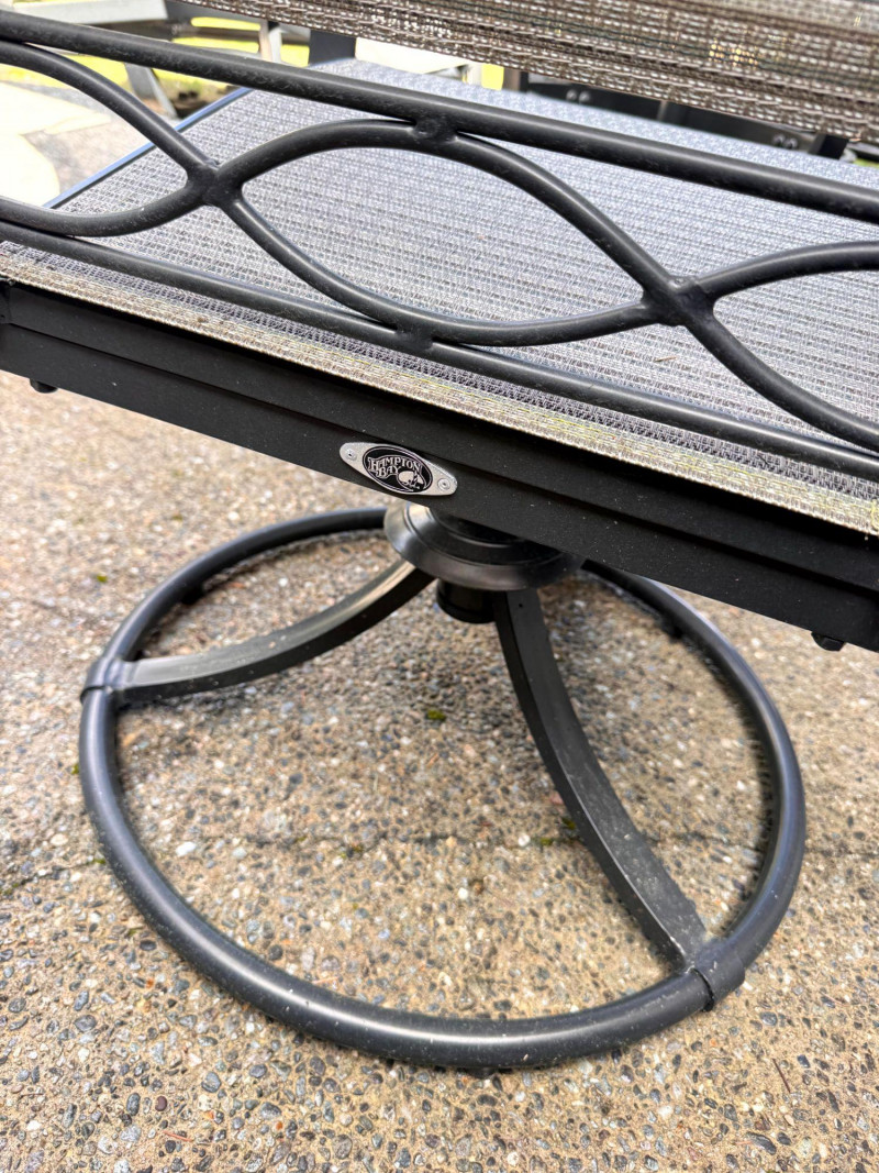 Hampton Bay Outdoor Patio Dining Set w/ Swivel Chairs & Umbrella. Bidding on this lot is an agreement that: (1.) You will have at least 2 capable, able bodied persons to lift and load at a minimum. (2.) You will bring a hand truck and/or any other tools needed to remove this item. If these steps are not followed your item will be forfeit and no refund given.