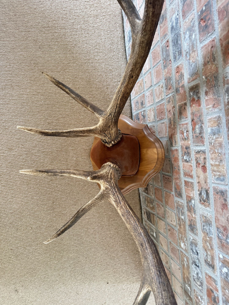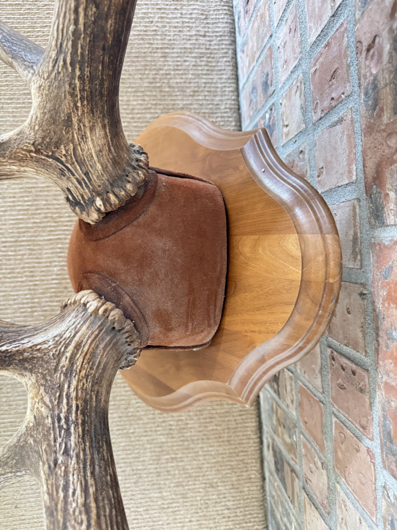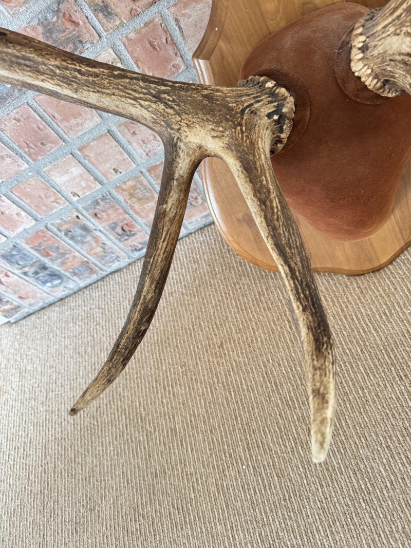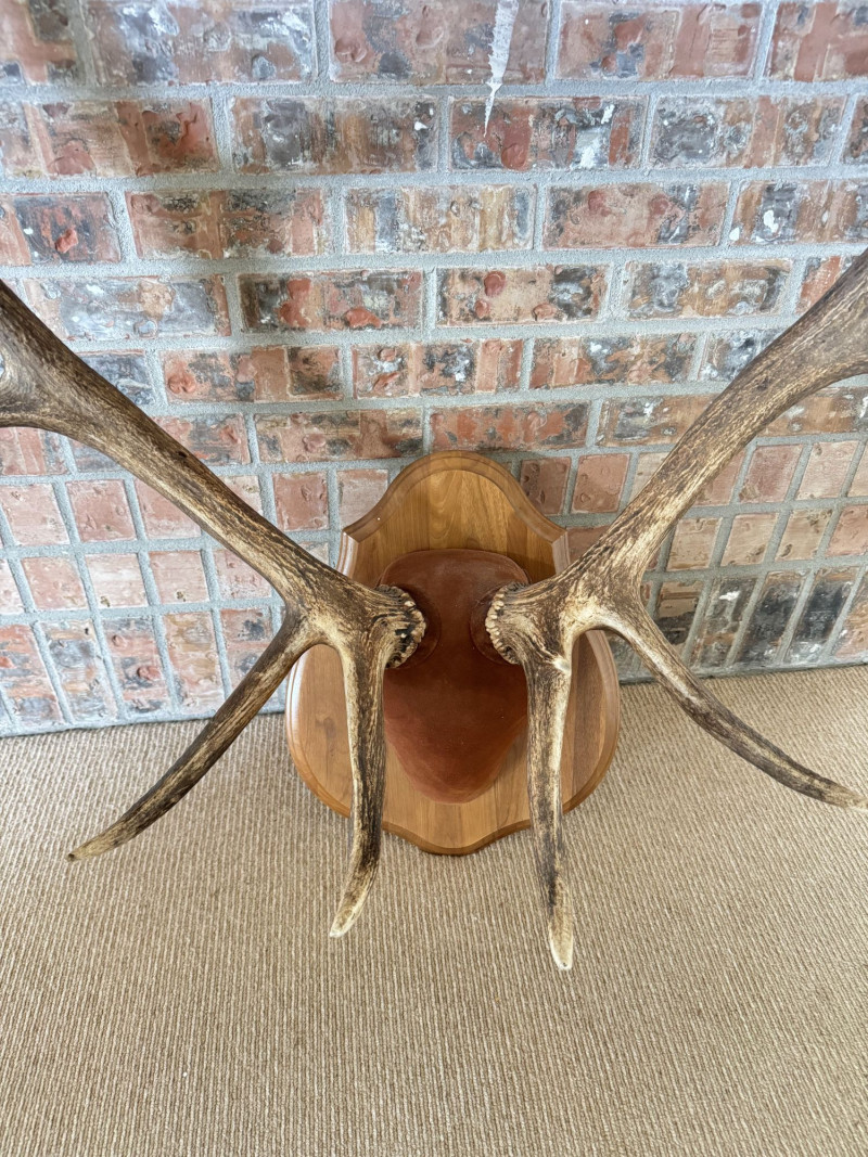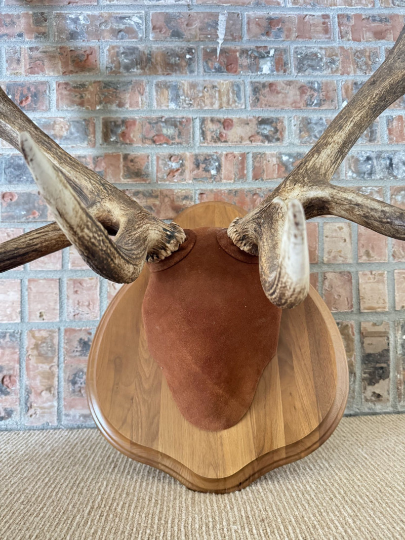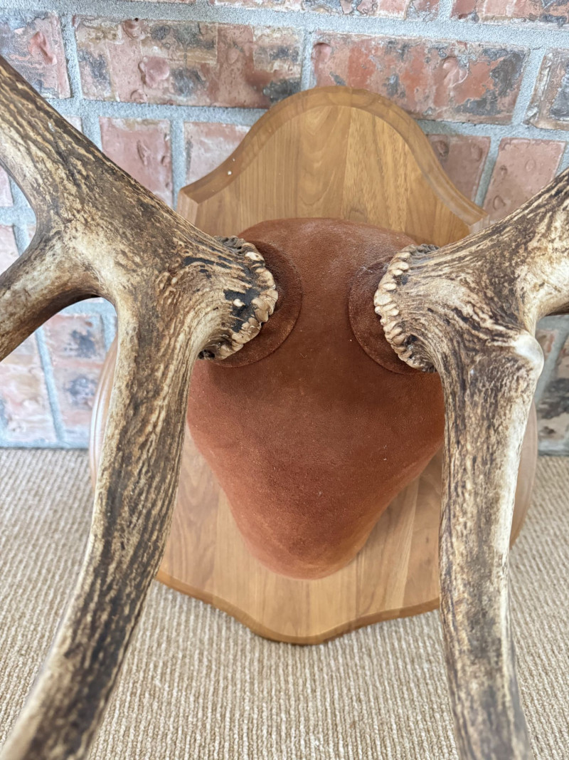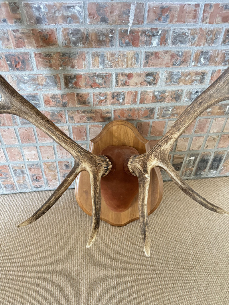 Oversized Mounted Deer Antlers on Wood Plaque.