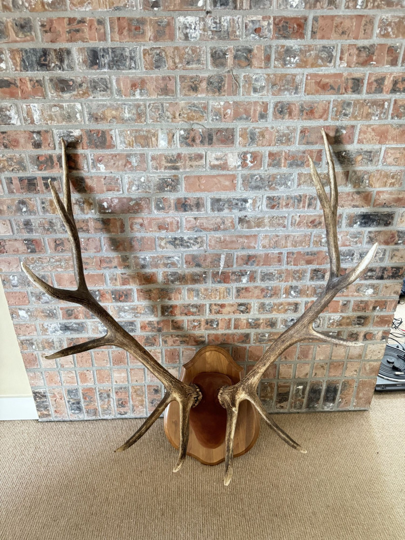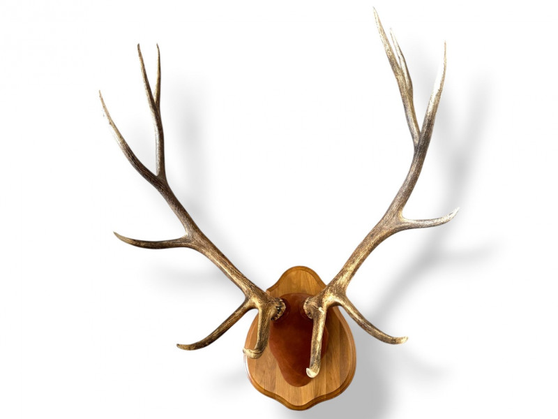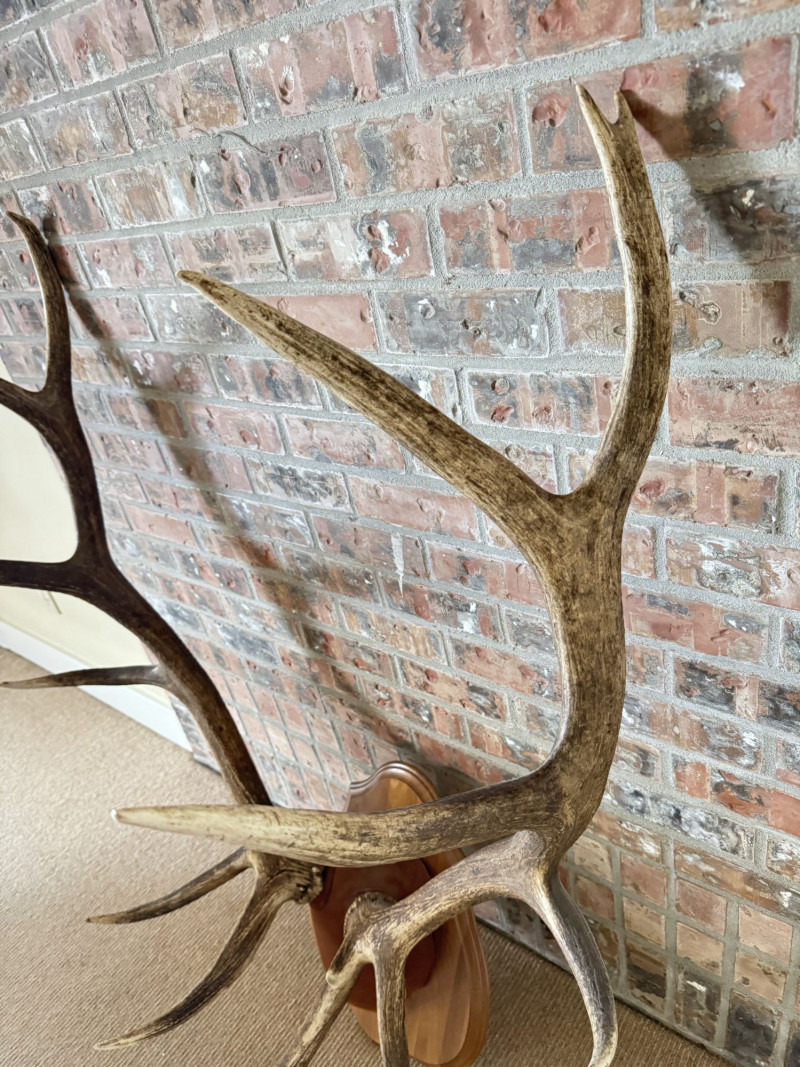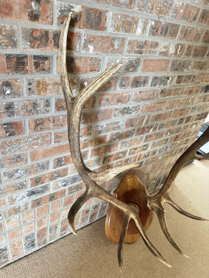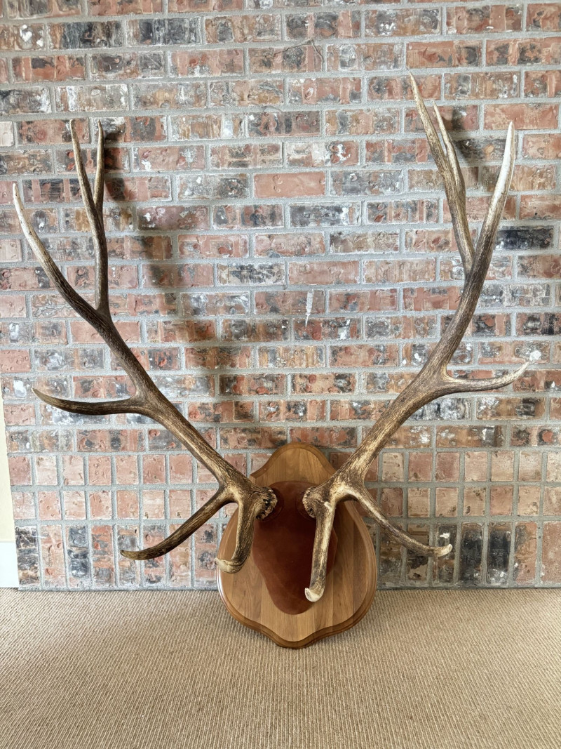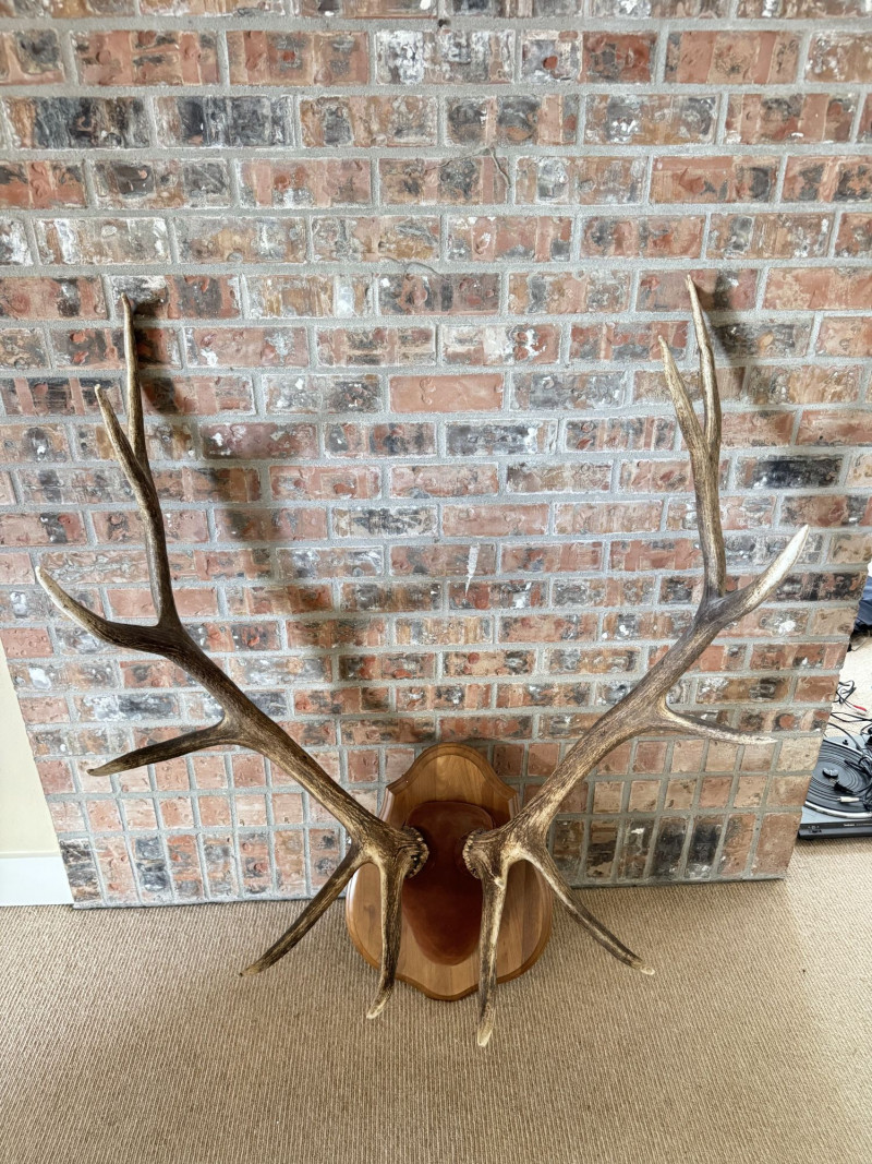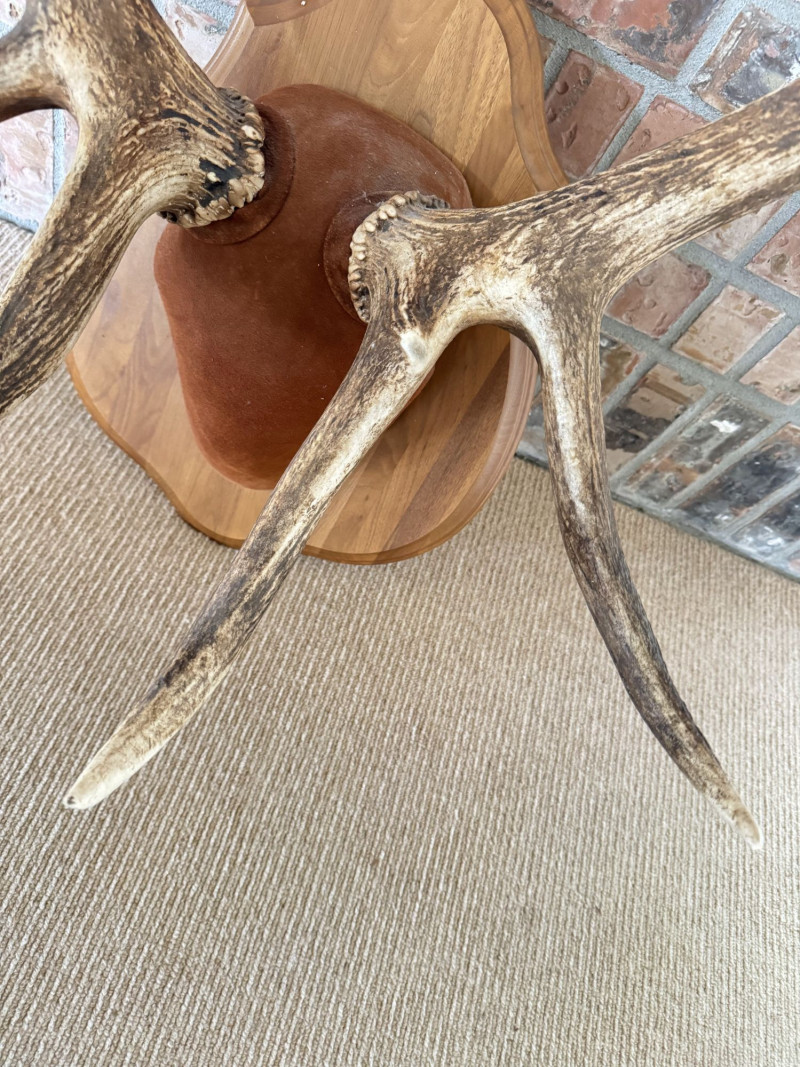 Oversized Mounted Deer Antlers on Wood Plaque.