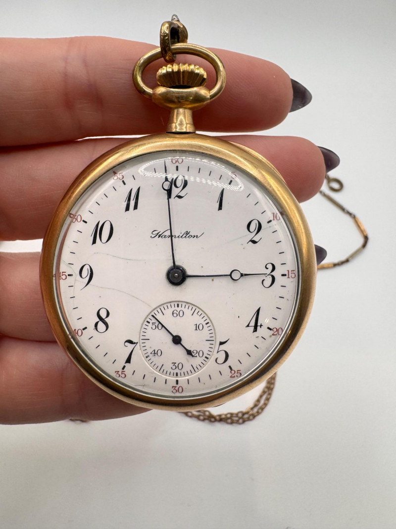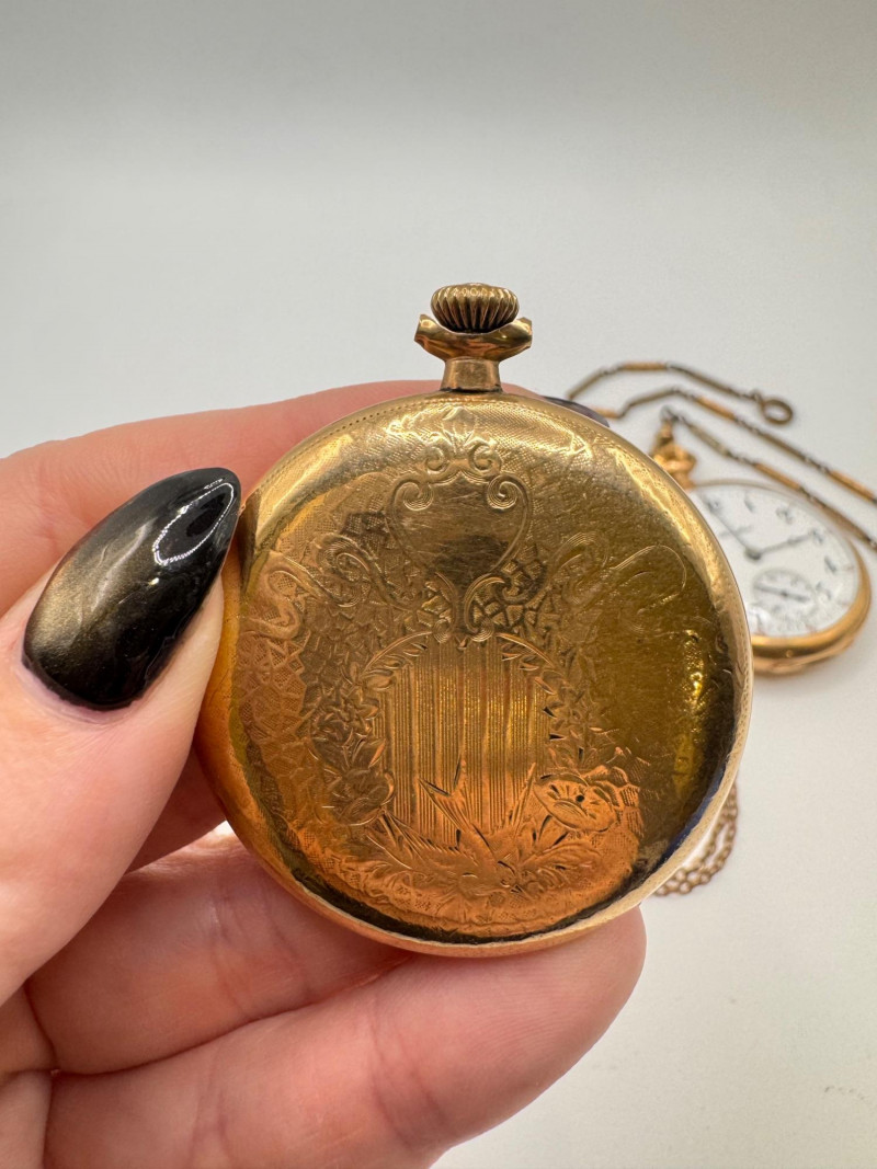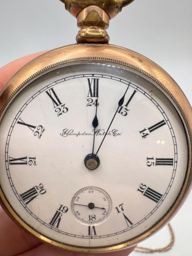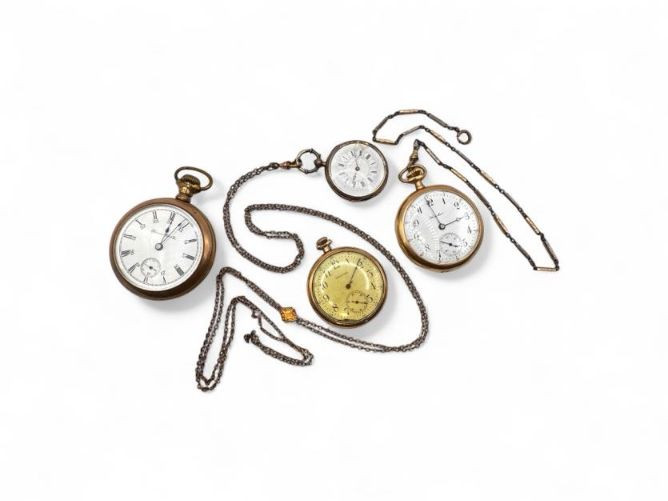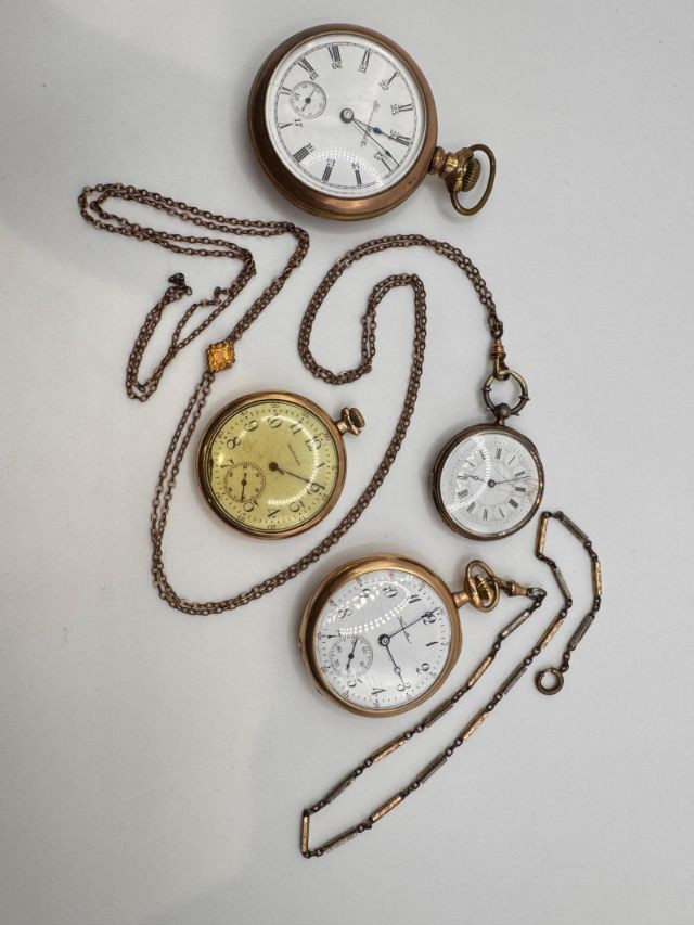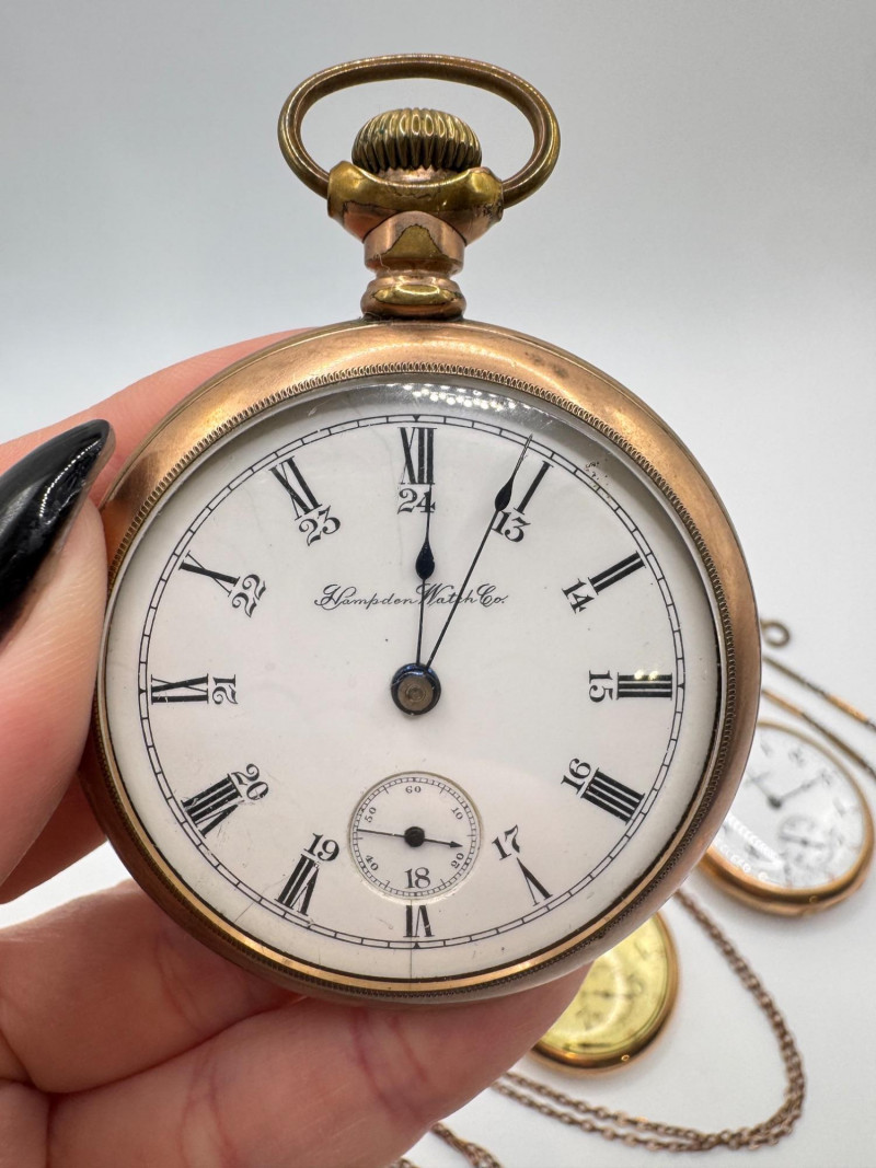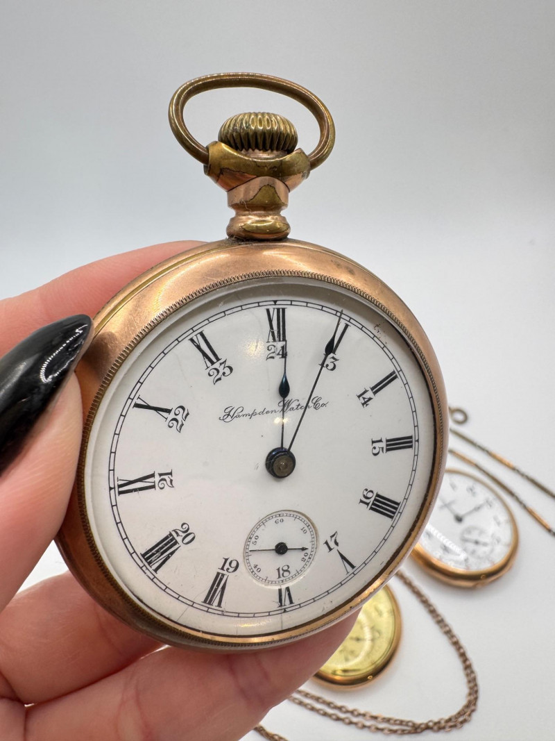 Gold Filled Pocket Watches - Hampden, Waltham, & Hamilton w/ Chains.
