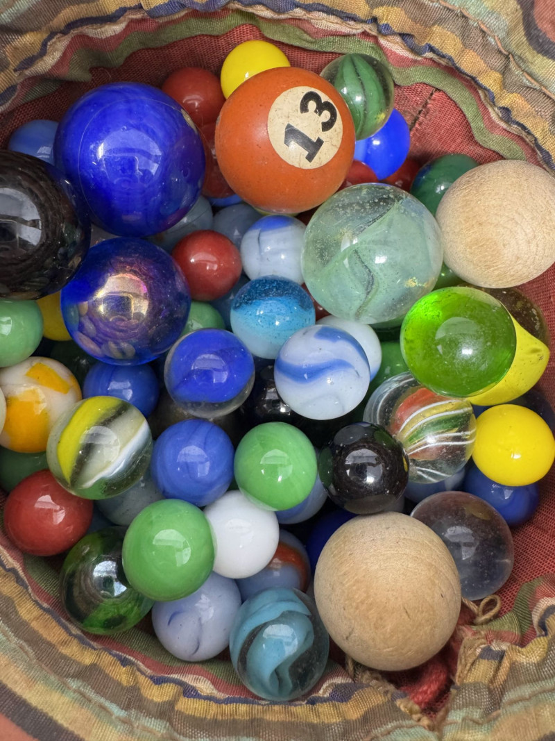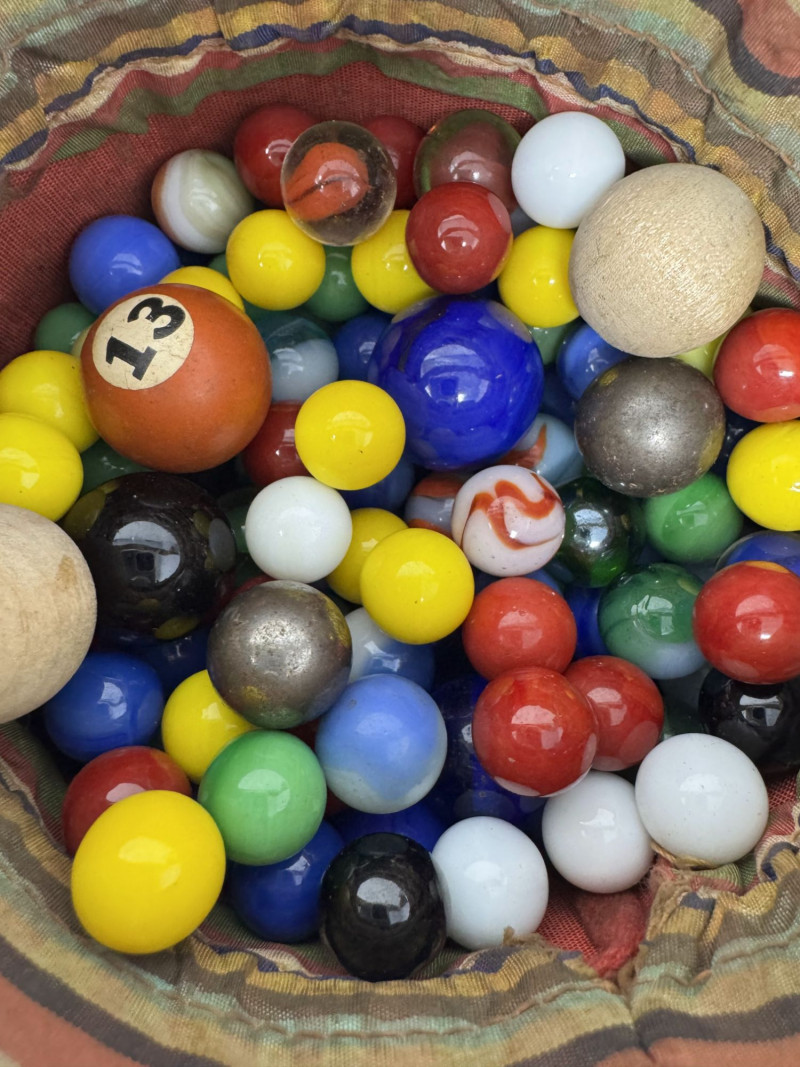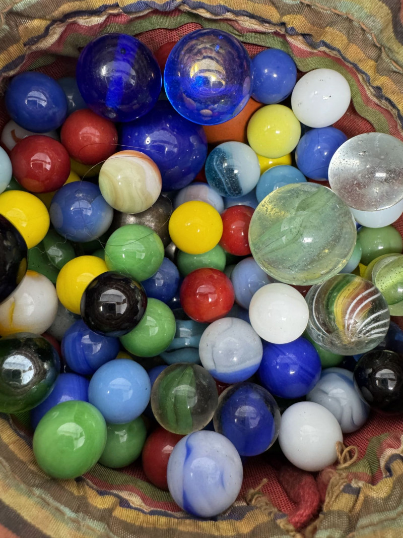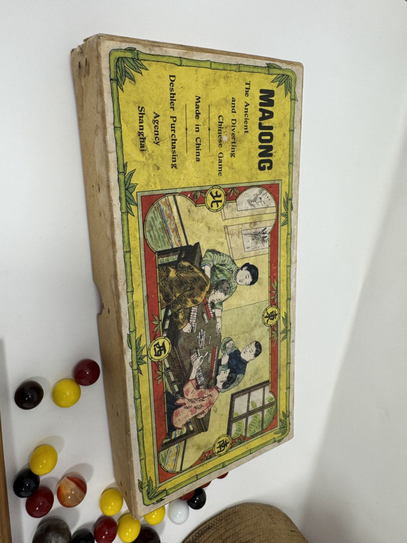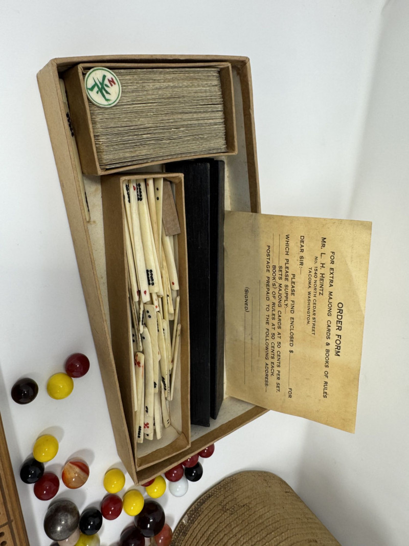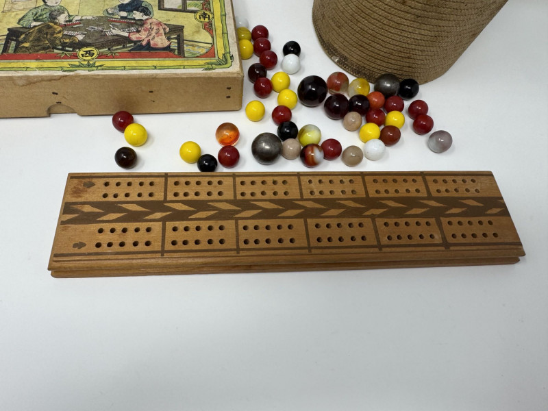 Vintage Mahjong Bone Tile Set, Cribbage Board & Vintage Marbles Basket.
