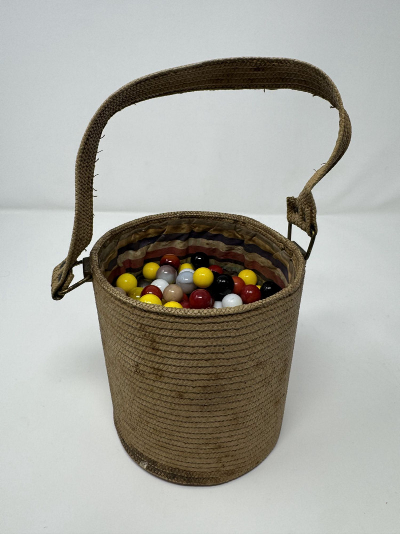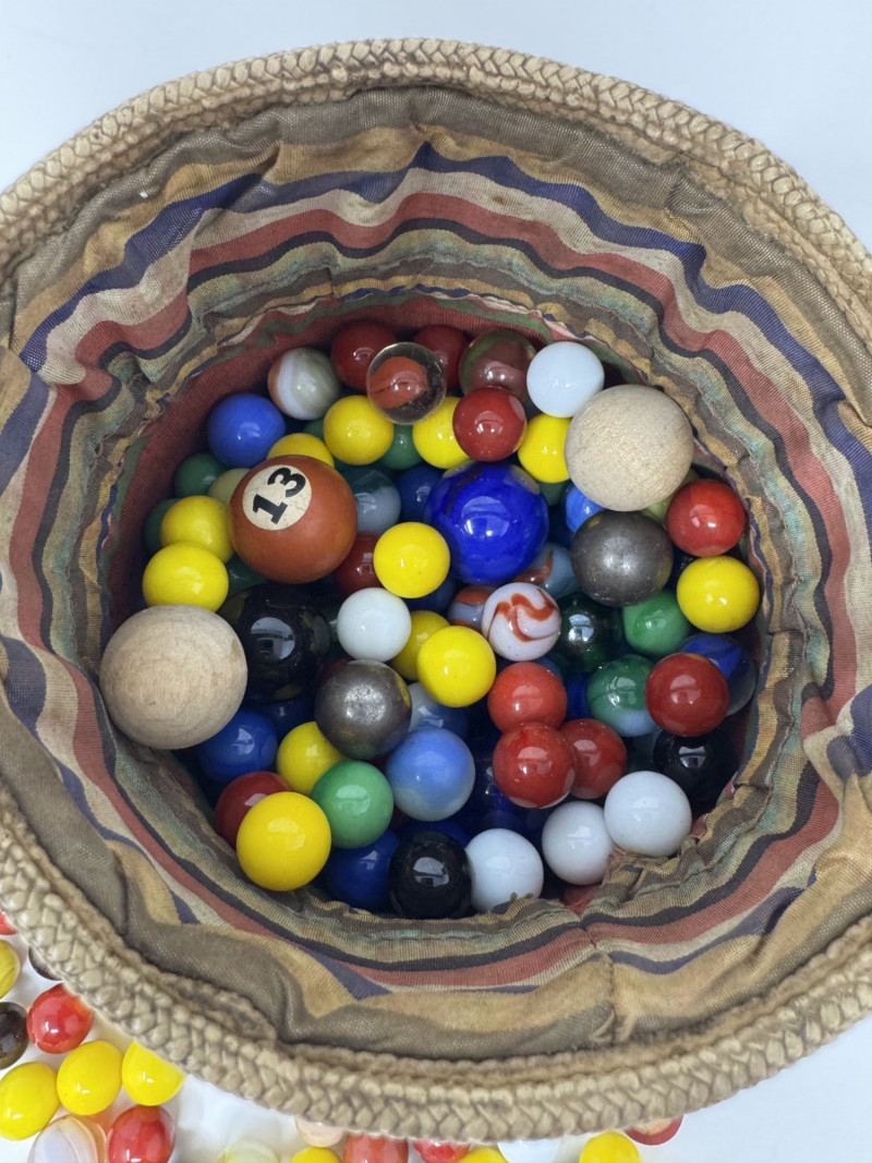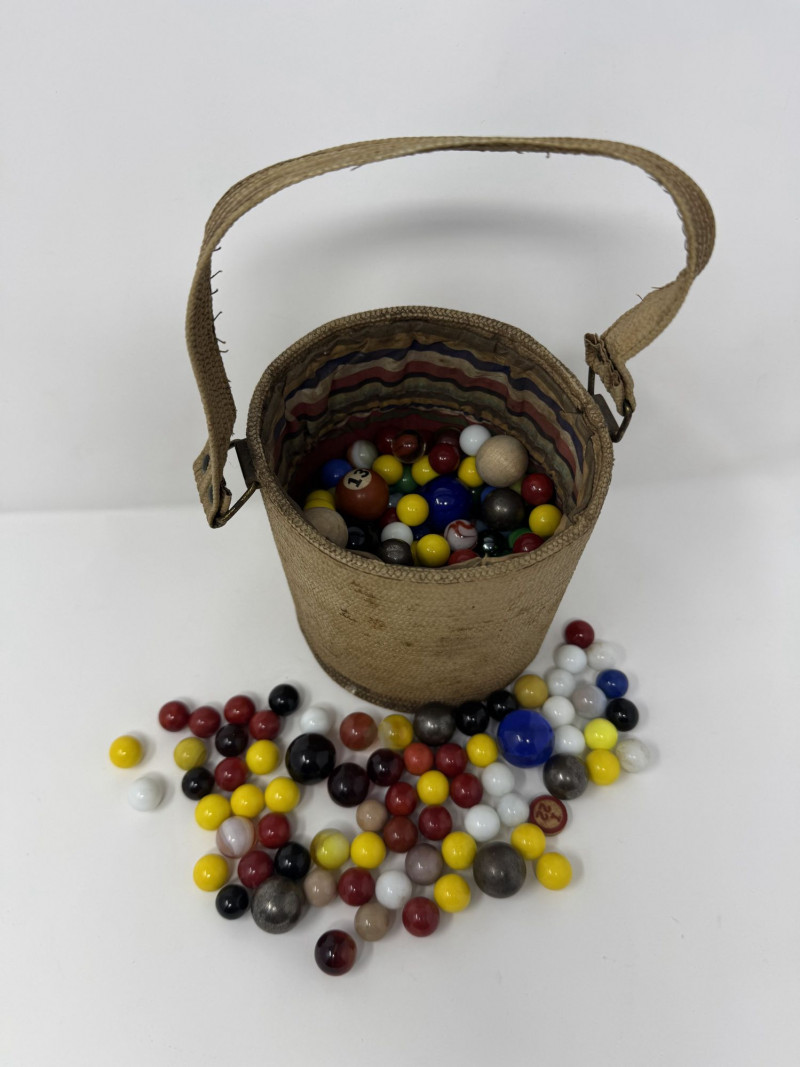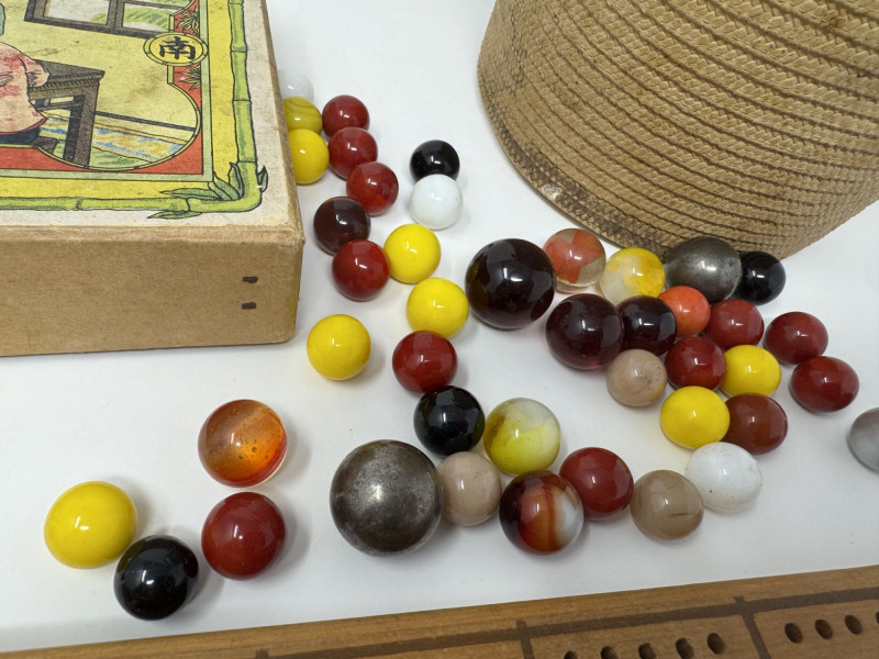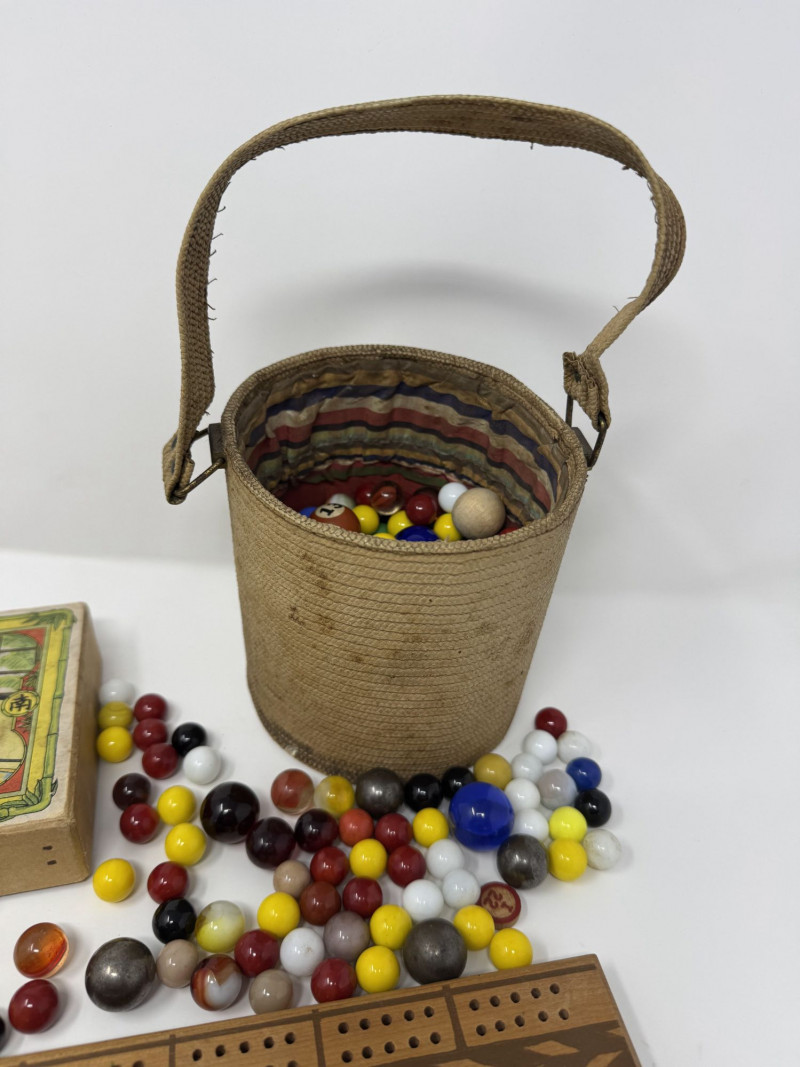 Lot # 30 - Vintage Mahjong Bone Tile Set, Cribbage Board & Vintage Marbles Basket
