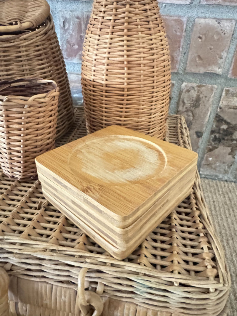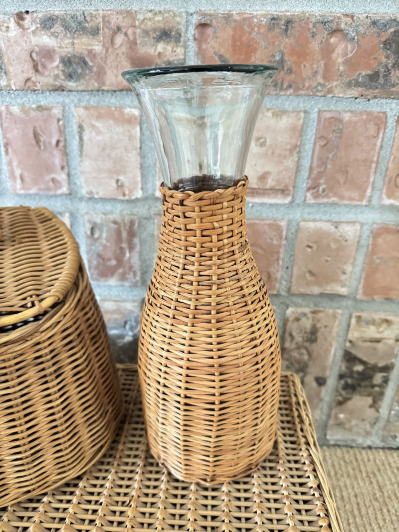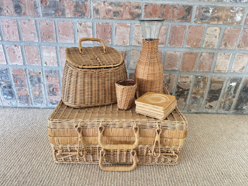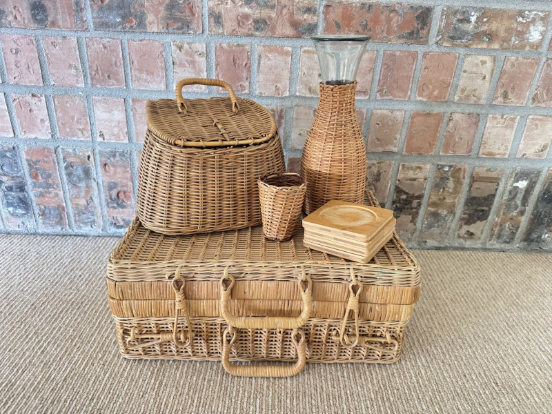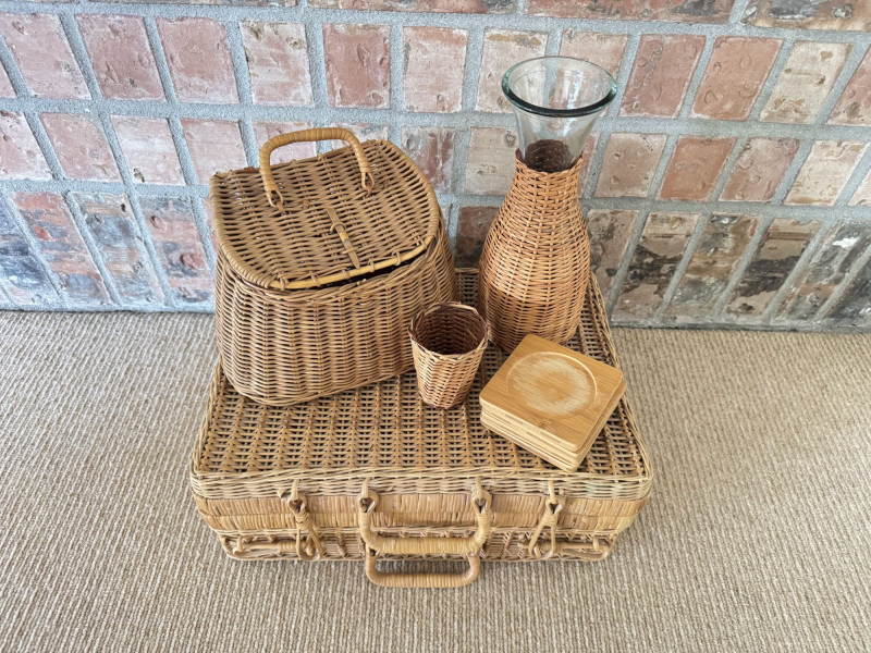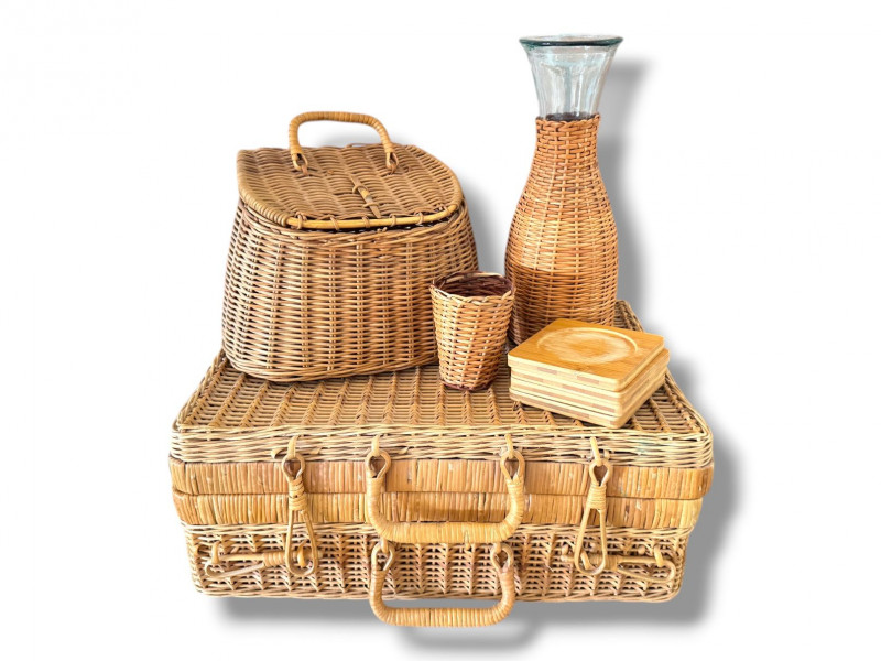 Woven Picnic Basket Set - Large Wicker Case, Carafe & Coasters.