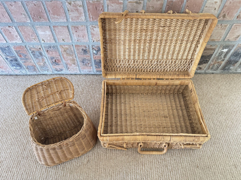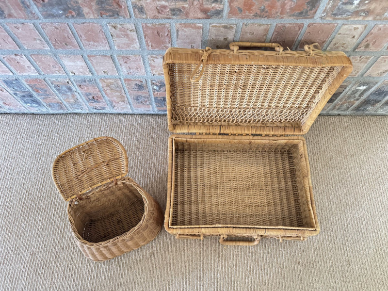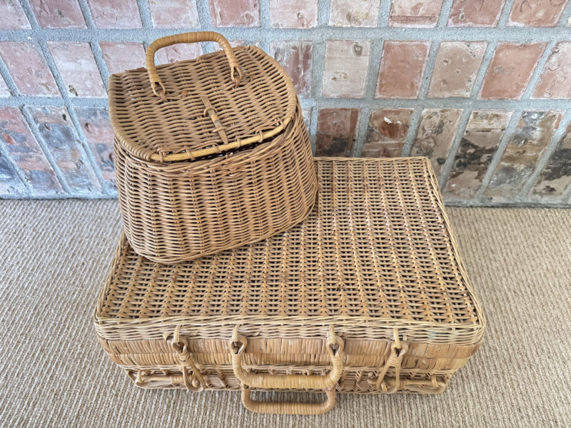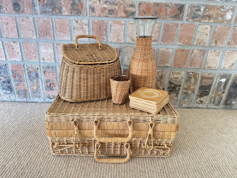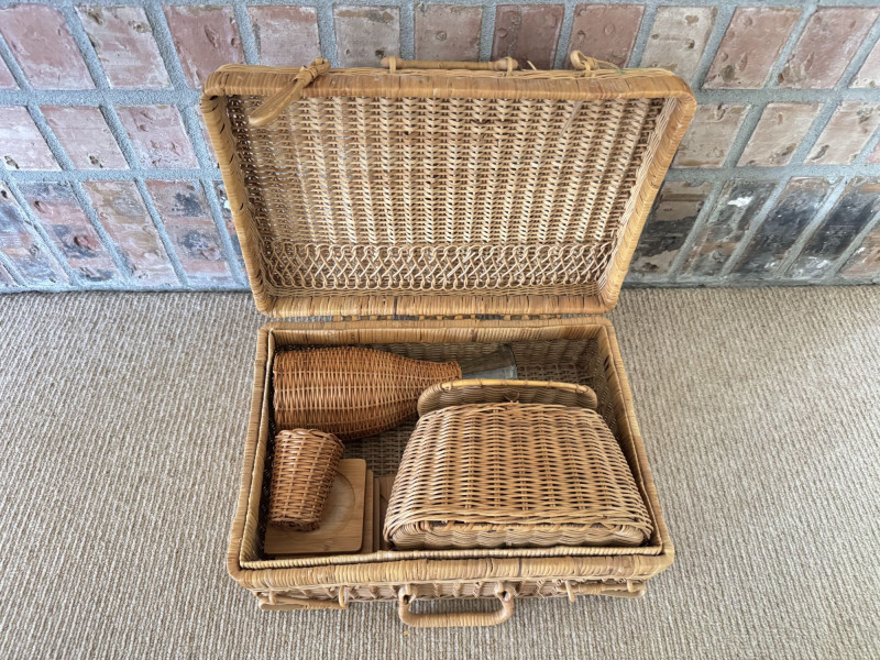 Lot # 49 - Woven Picnic Basket Set - Large Wicker Case, Carafe & Coasters