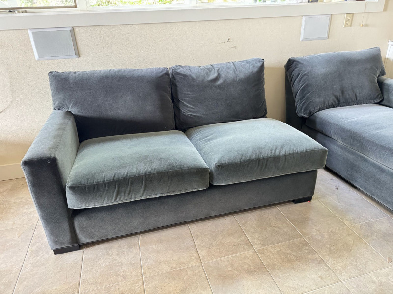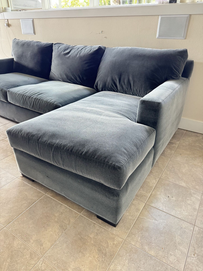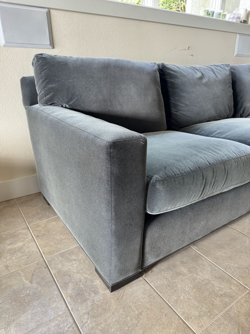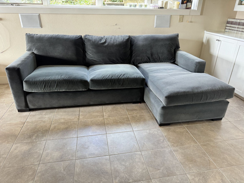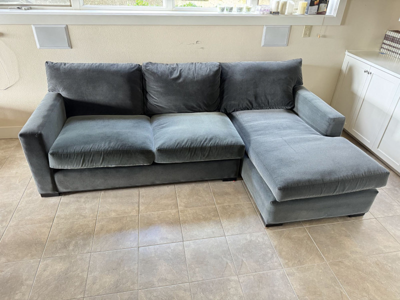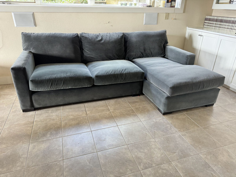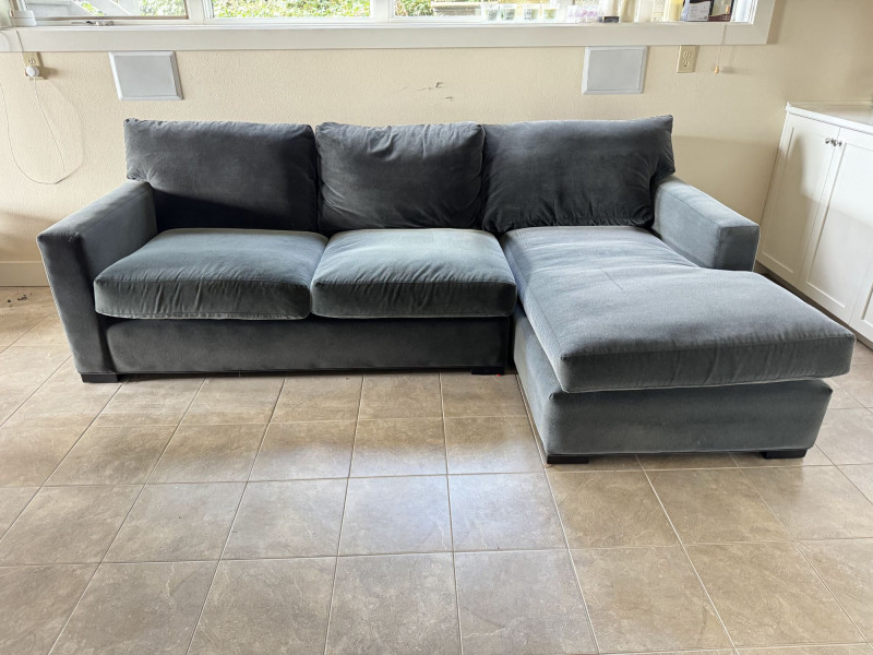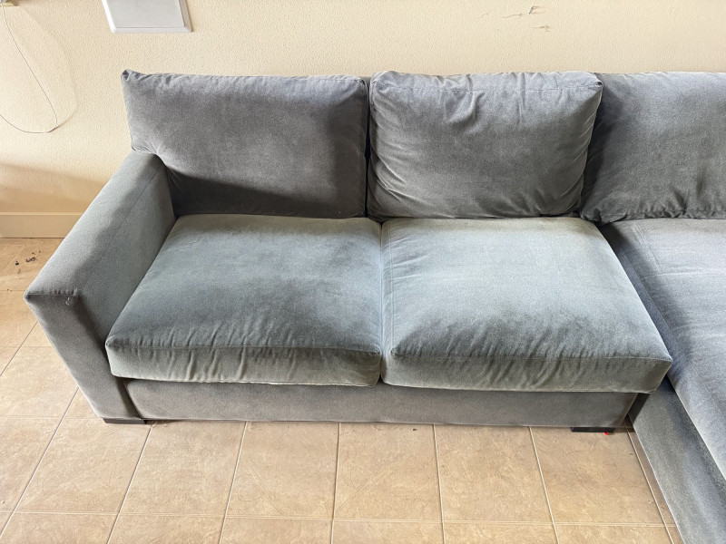 Crate & Barrel Sectional Sofa w/ Chaise. Bidding on this lot is an agreement that: (1.) You will have at least 2 capable, able bodied persons to lift and load at a minimum. (2.) You will bring a hand truck and/or any other tools needed to remove this item. If these steps are not followed your item will be forfeit and no refund given.
