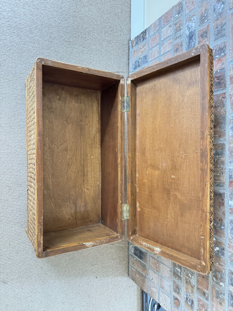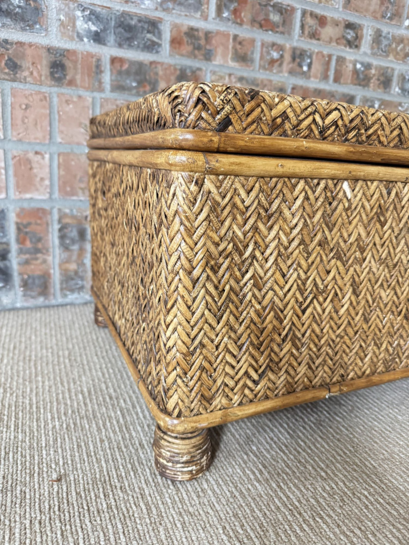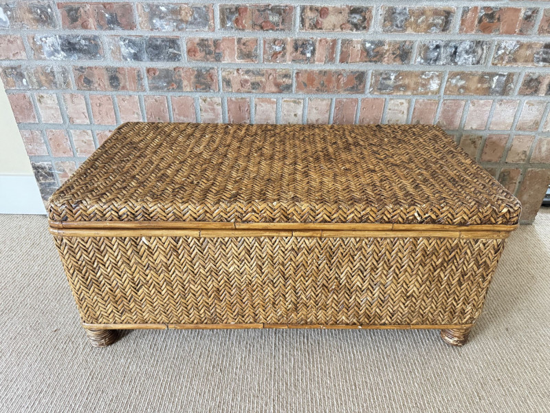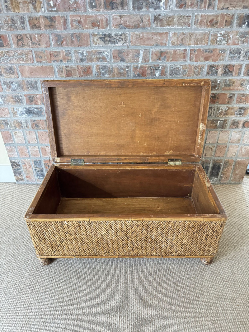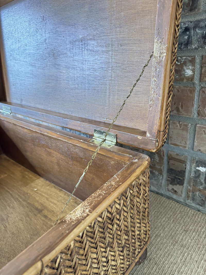 Woven Rattan Storage Trunk Chest – Wood Frame, Hinged Lid.