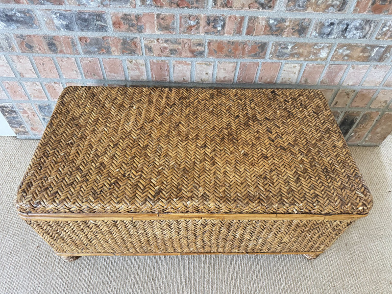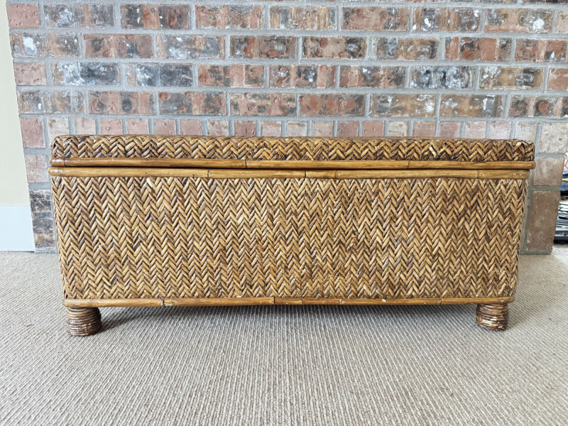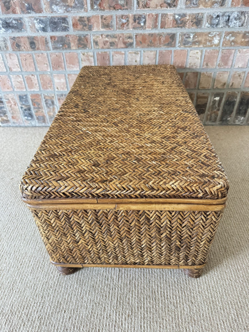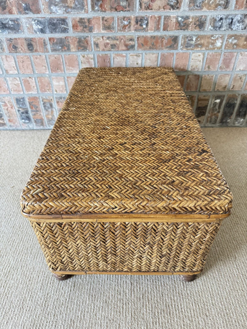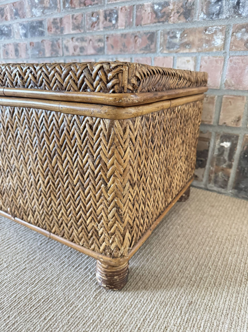 Woven Rattan Storage Trunk Chest – Wood Frame, Hinged Lid.