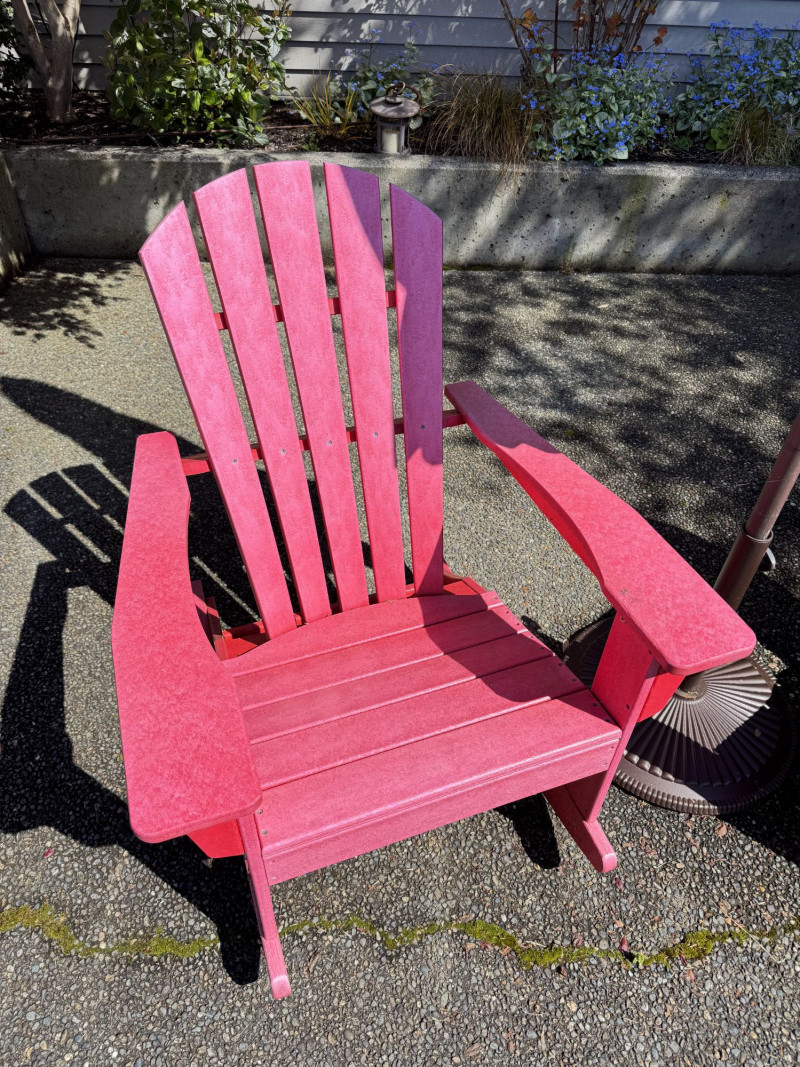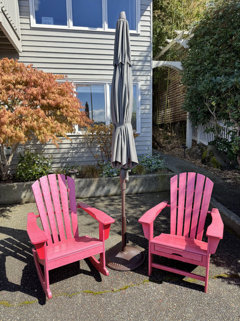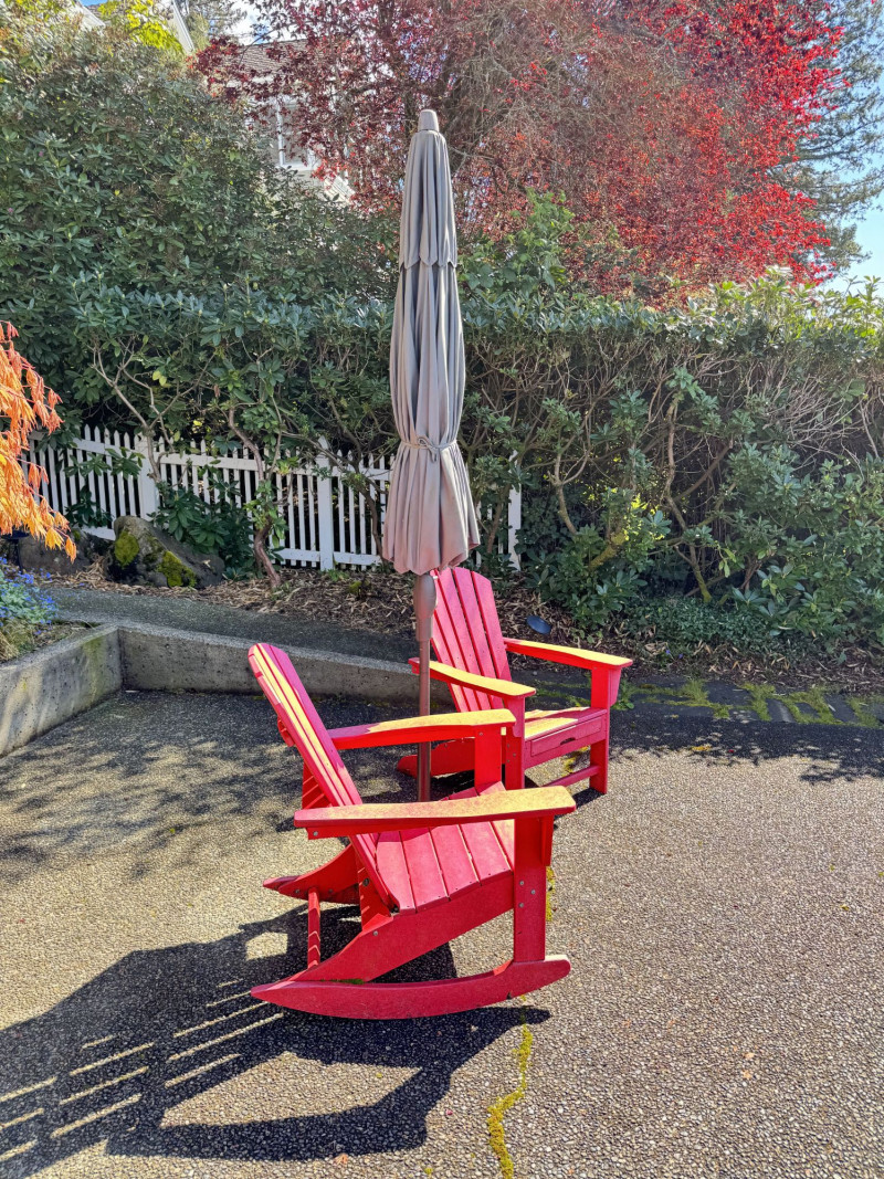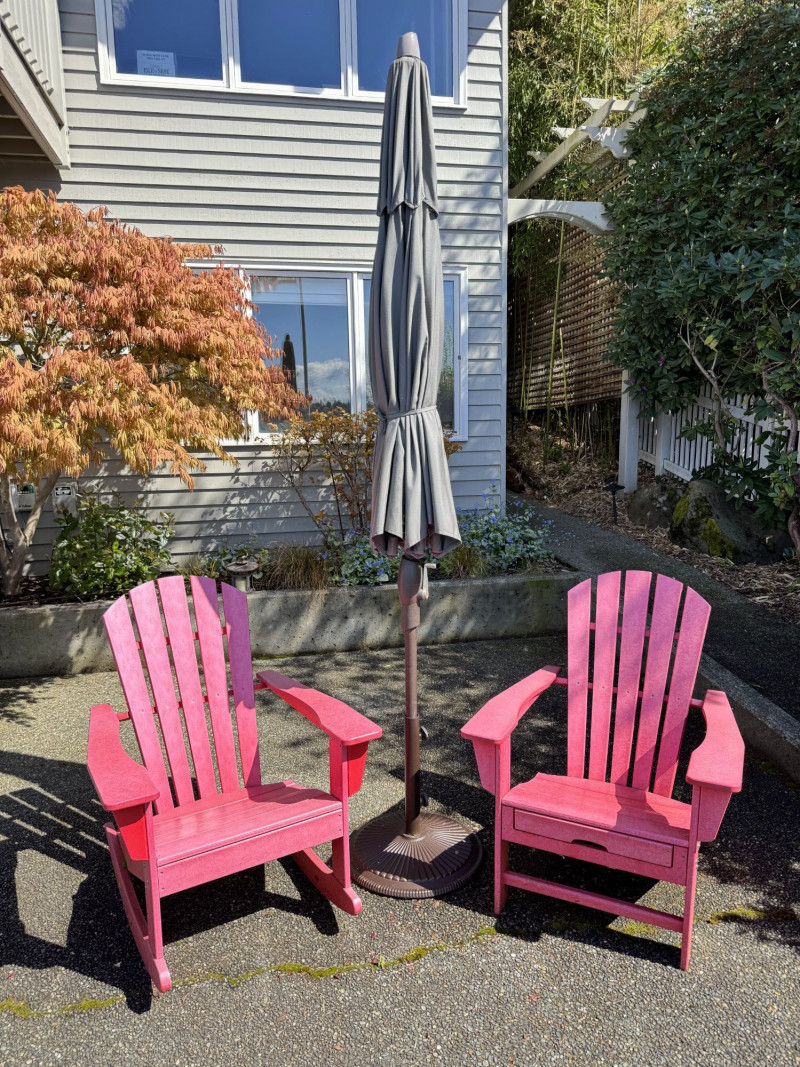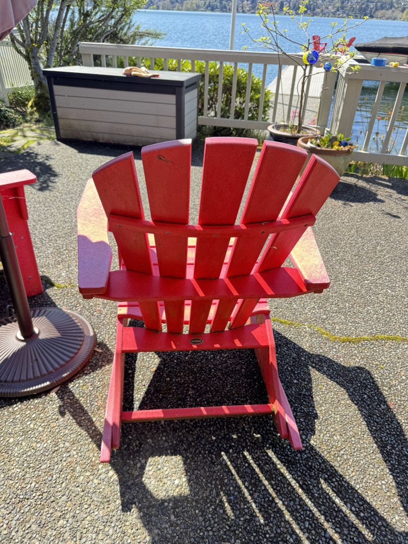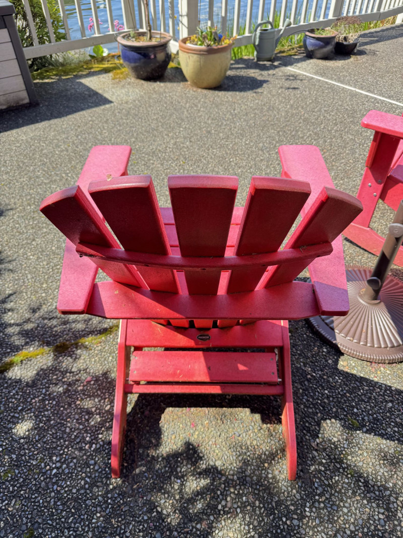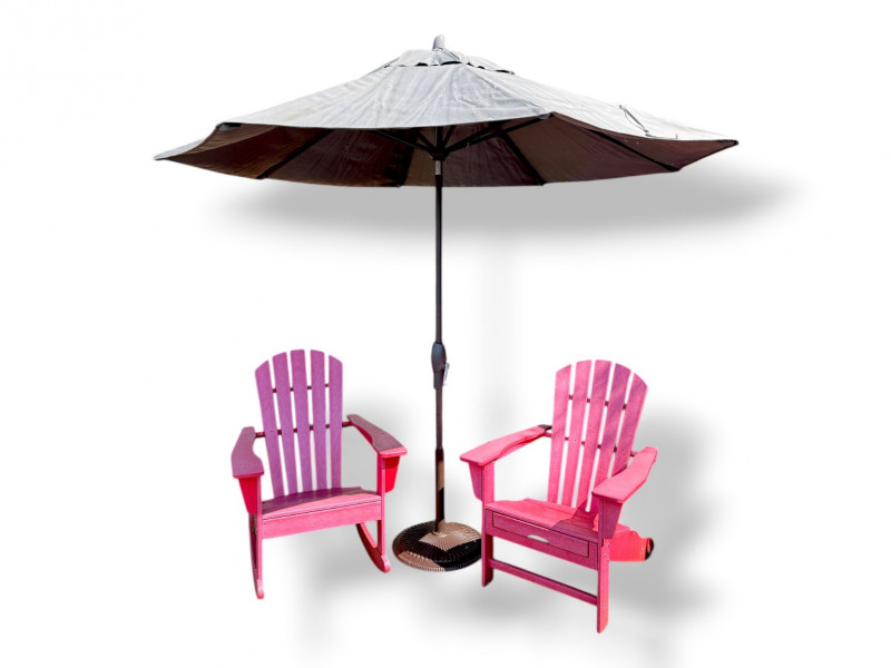 Red Adirondack Patio Chairs w/ Umbrella & Base.