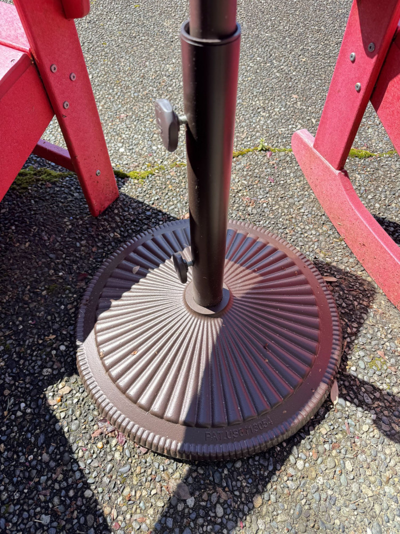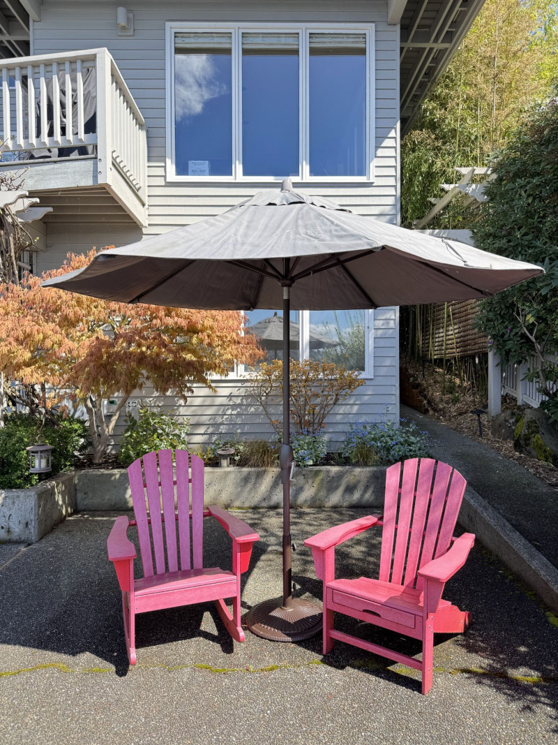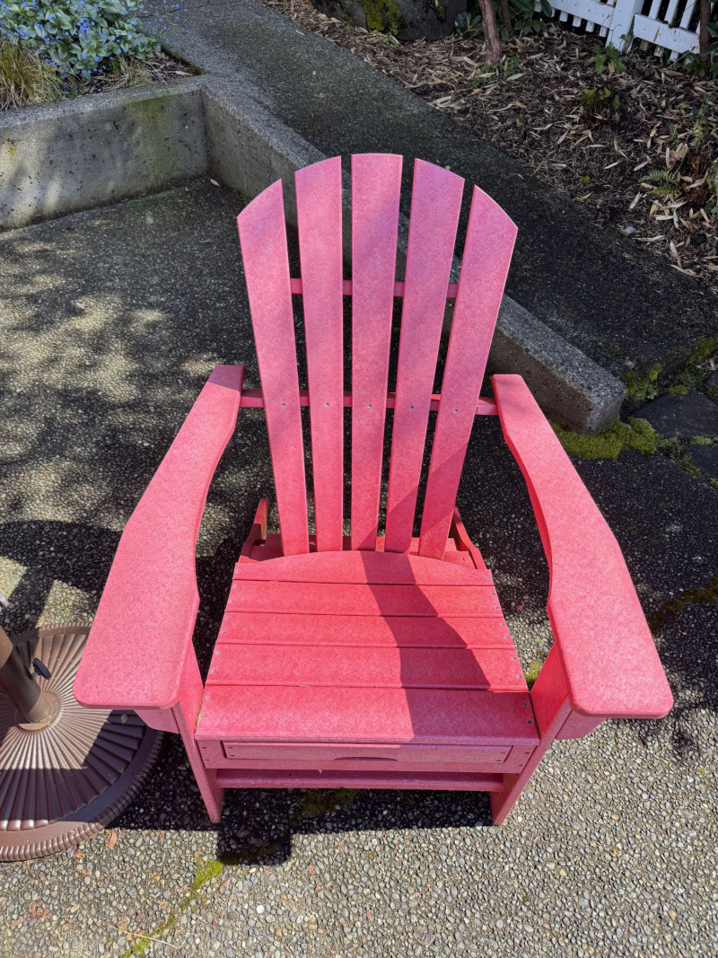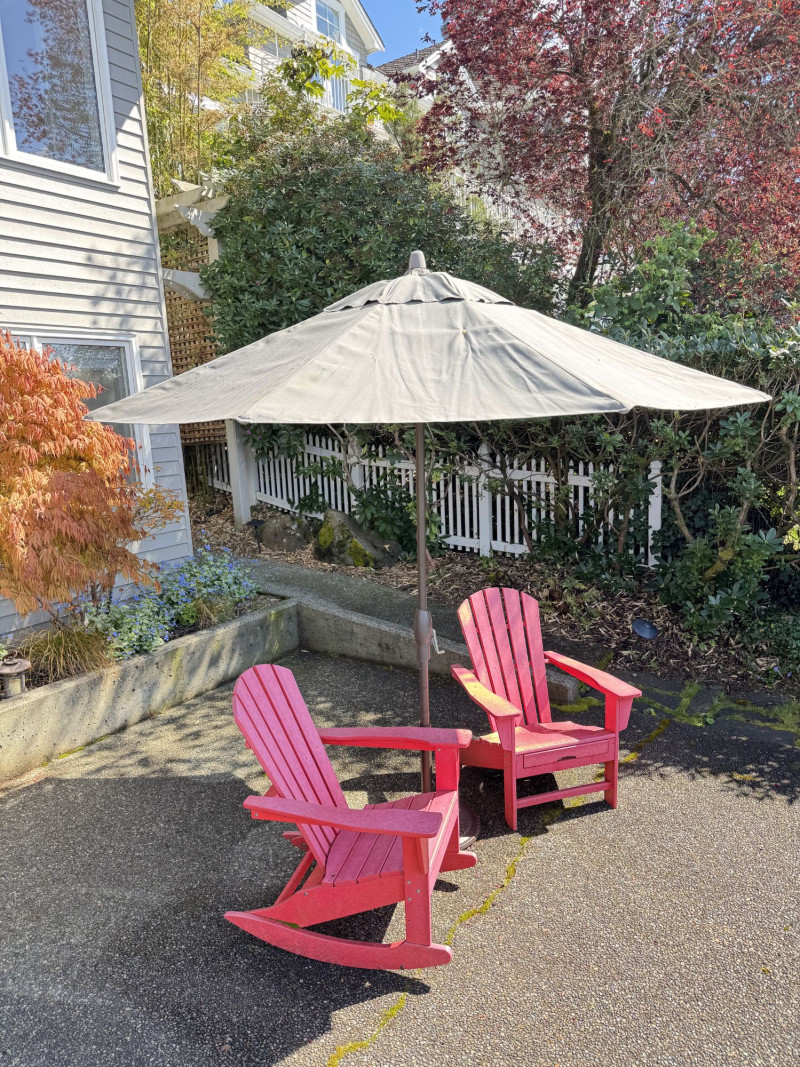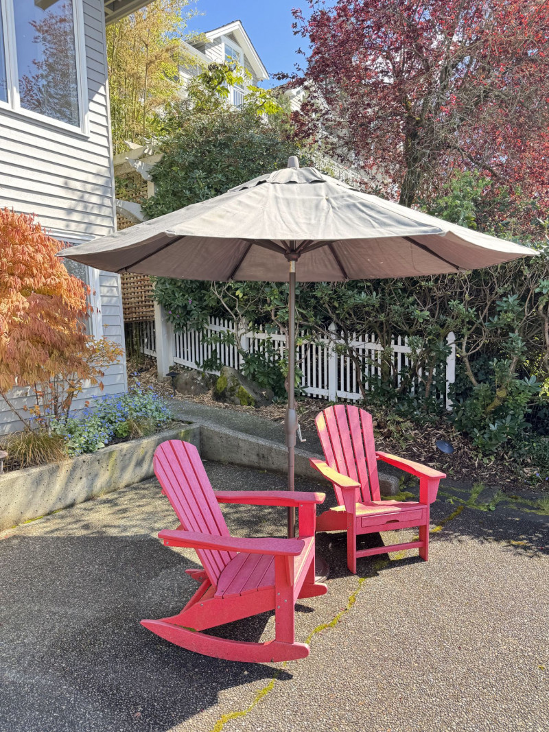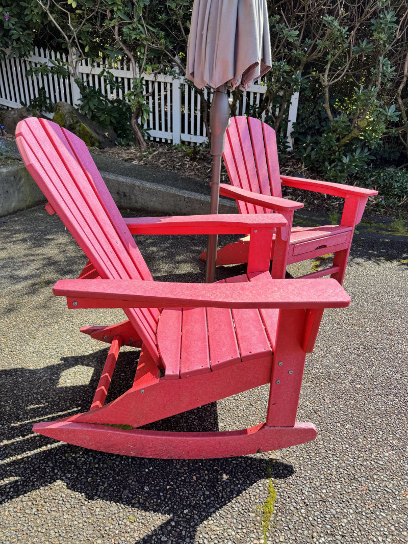 Red Adirondack Patio Chairs w/ Umbrella & Base.