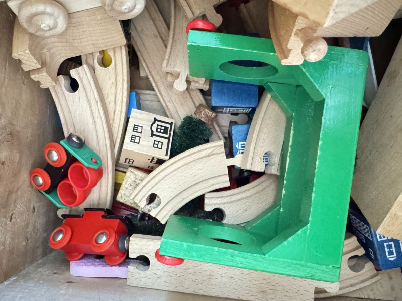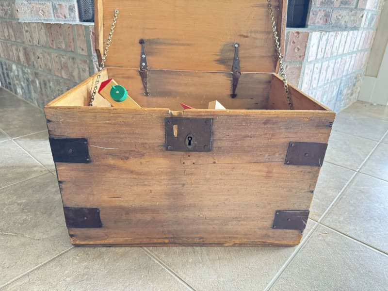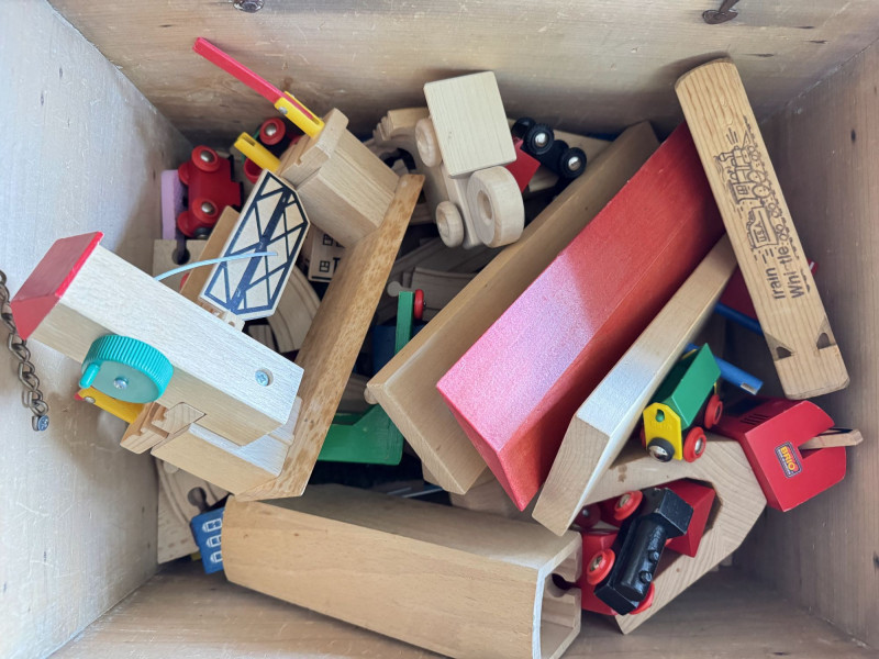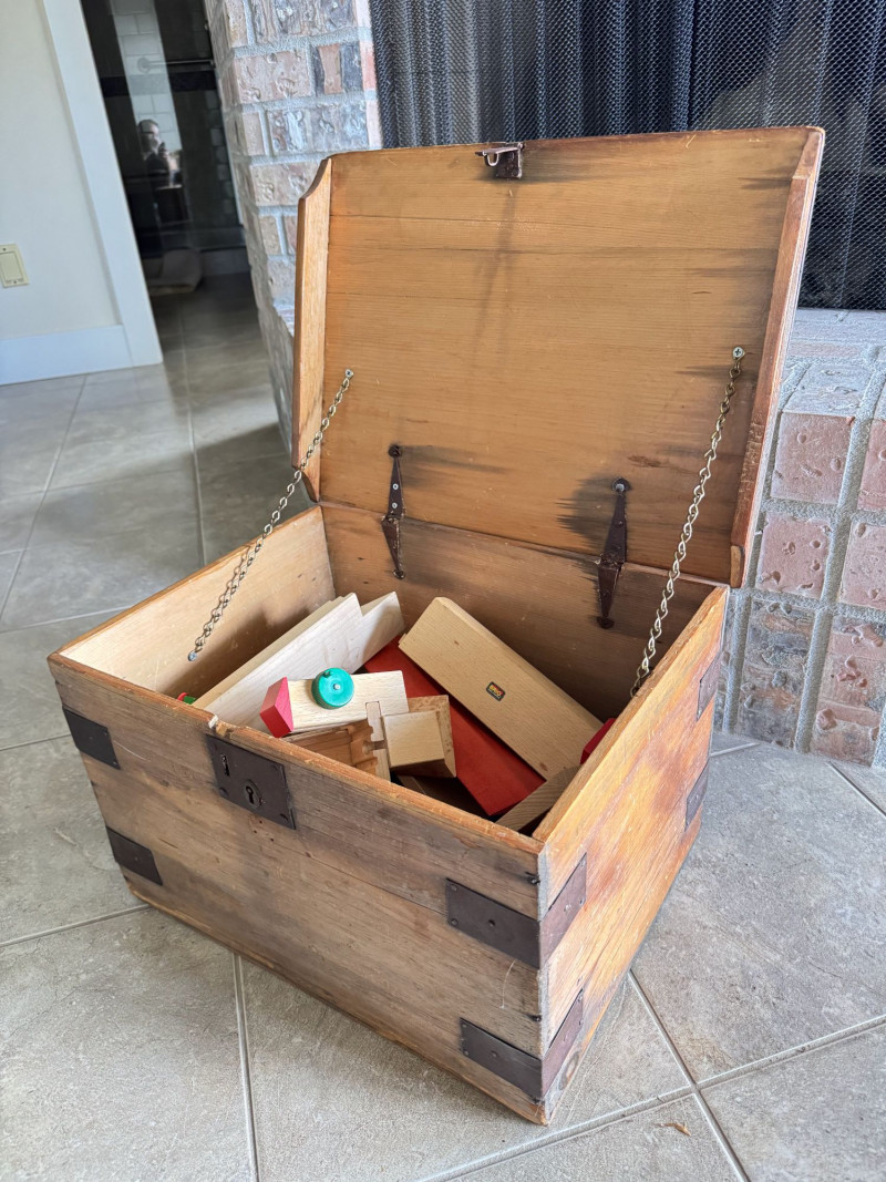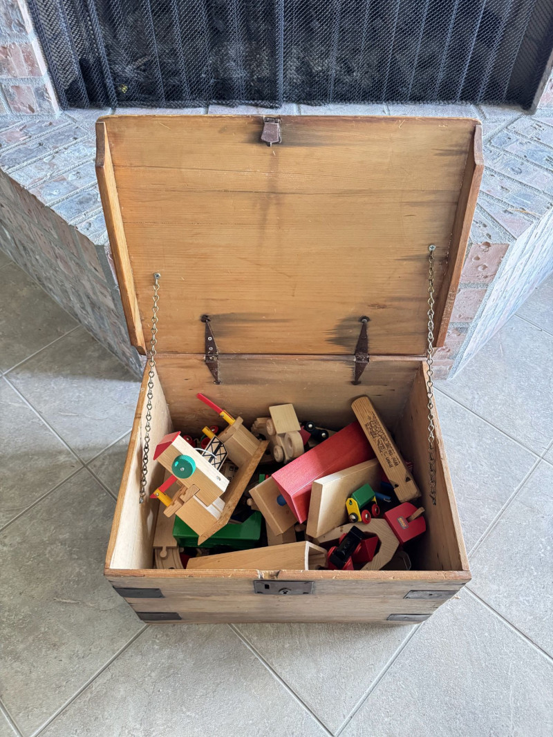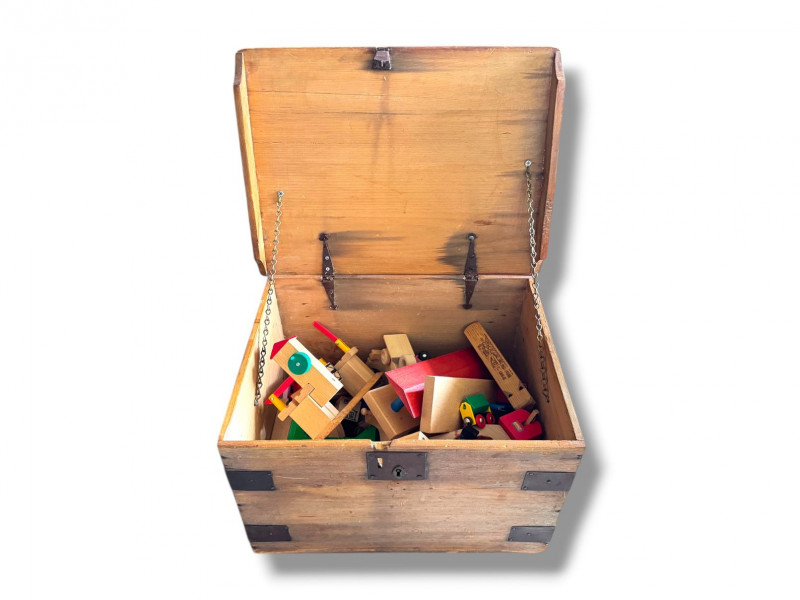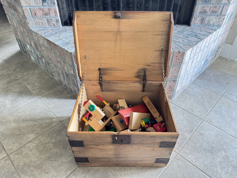 Wood Storage Chest w/ Vintage Wooden Toys & Train Pieces.