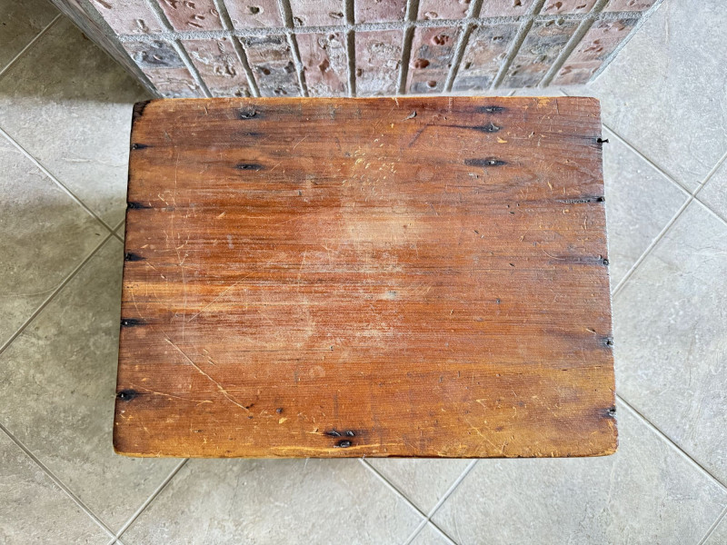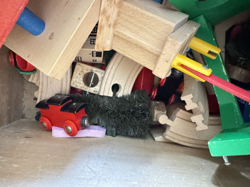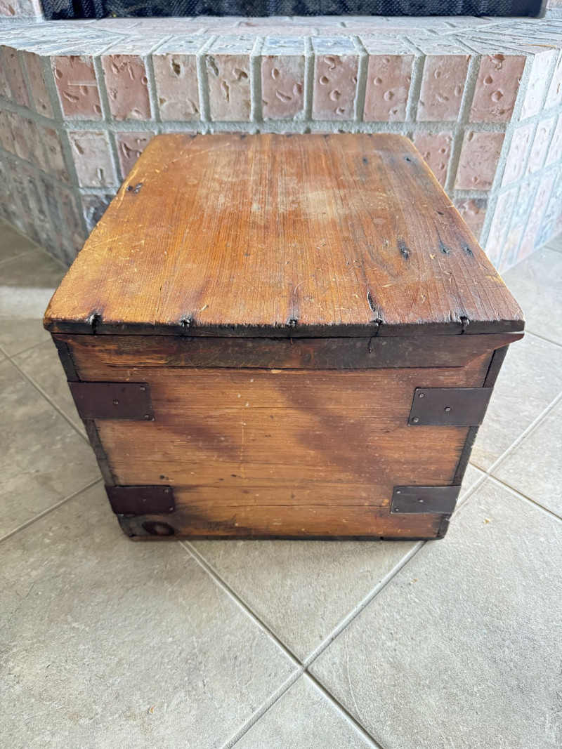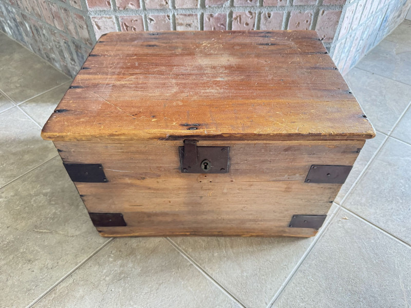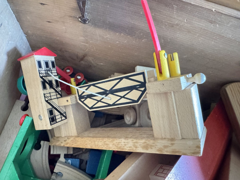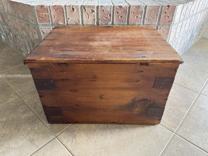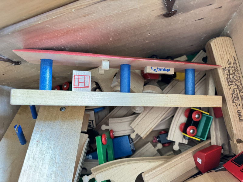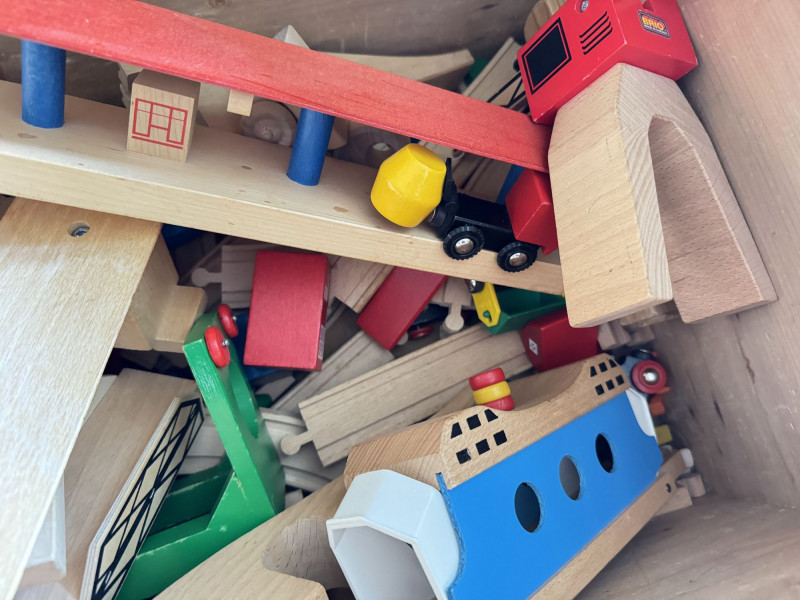 Wood Storage Chest w/ Vintage Wooden Toys & Train Pieces.
