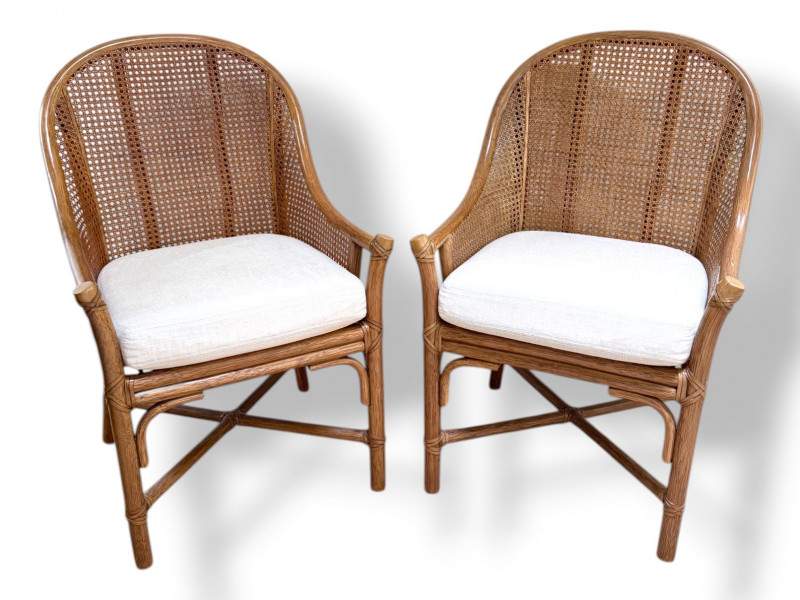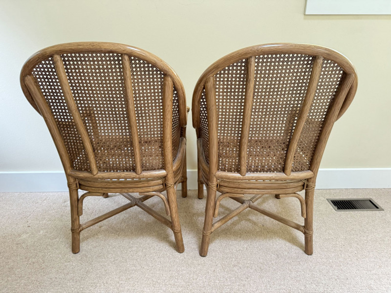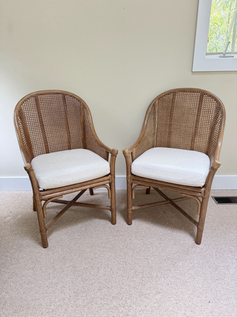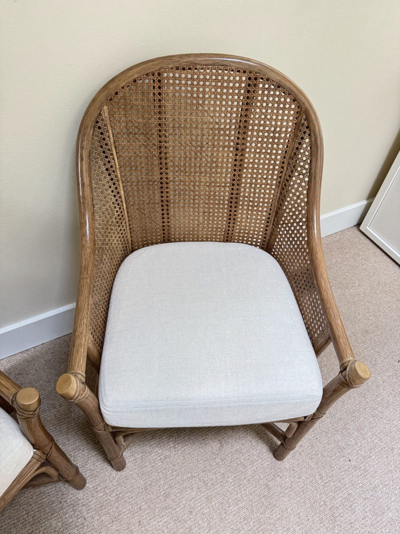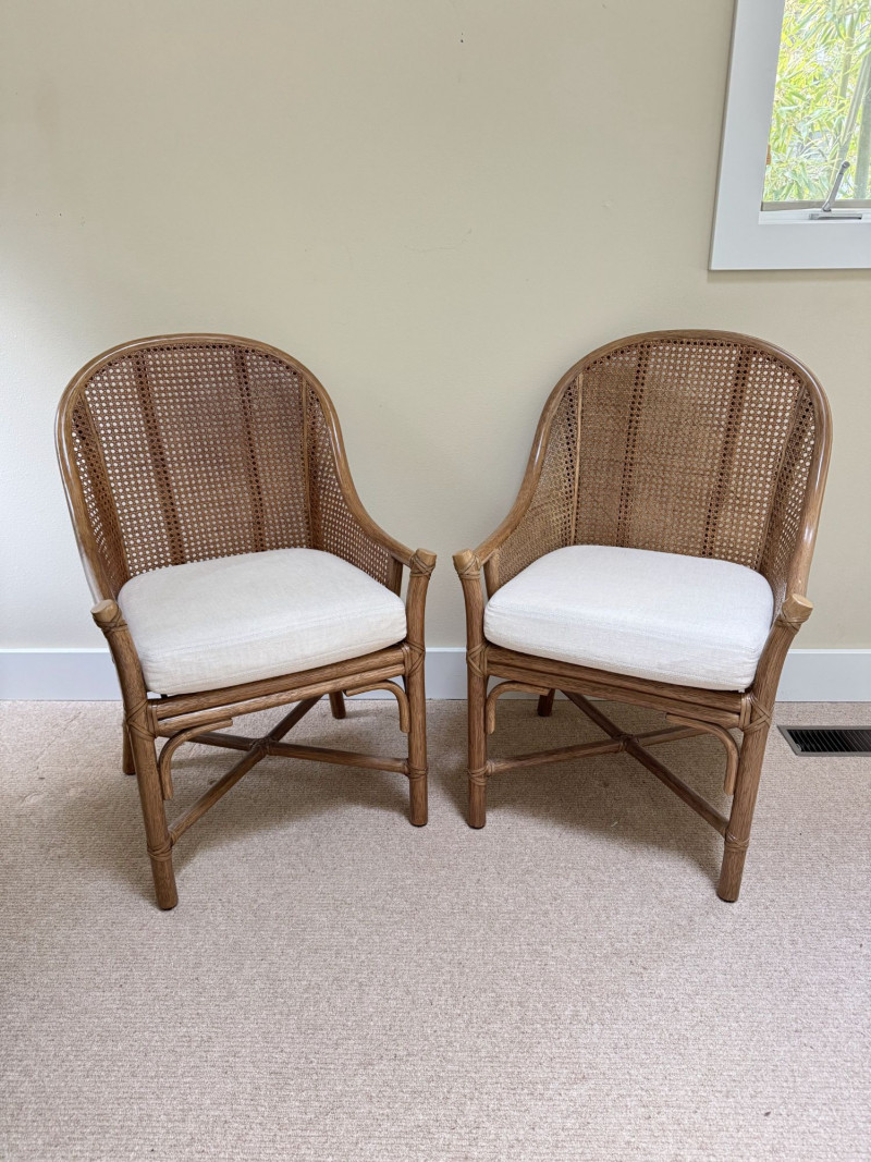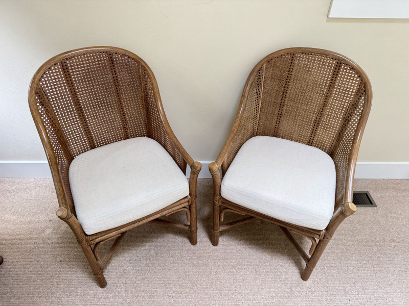 Pair Woven Cane Back Wood Accent Chairs w/ Cushions.