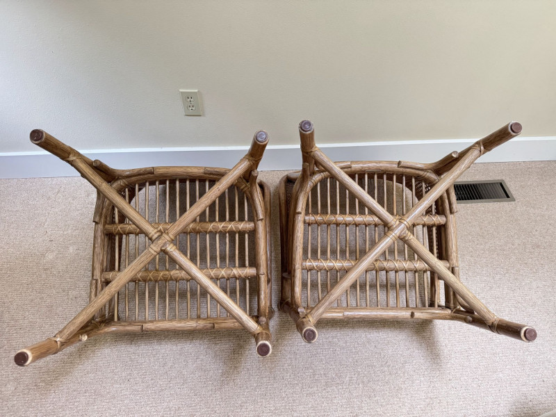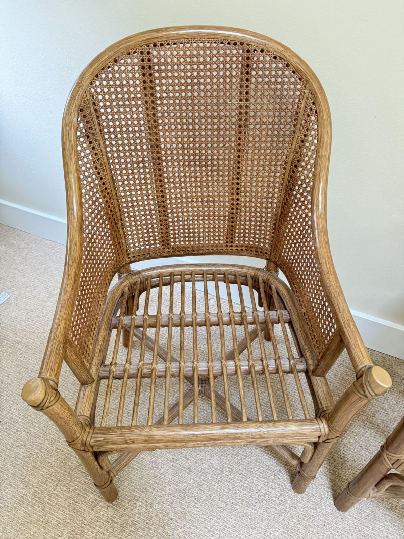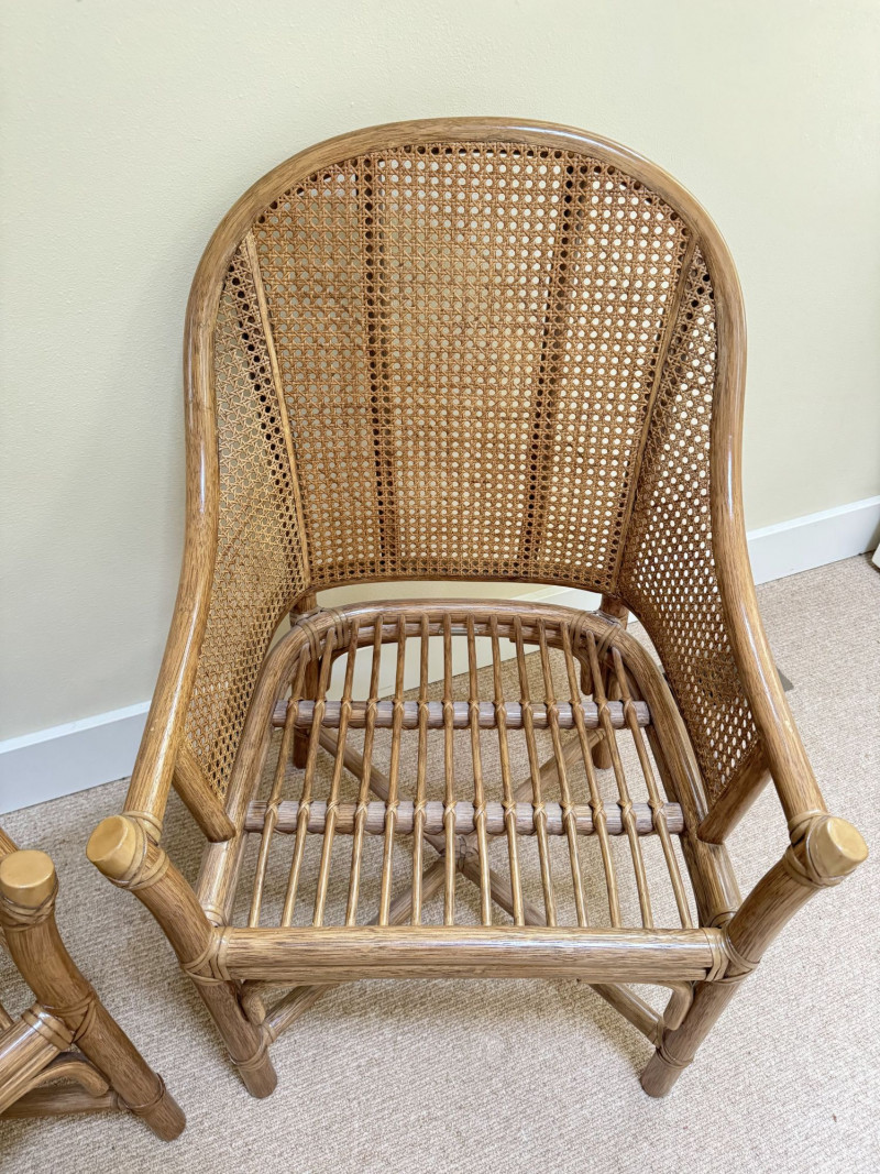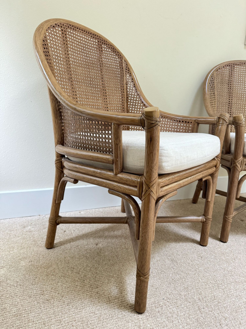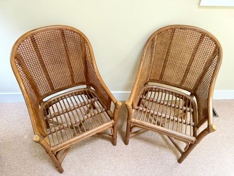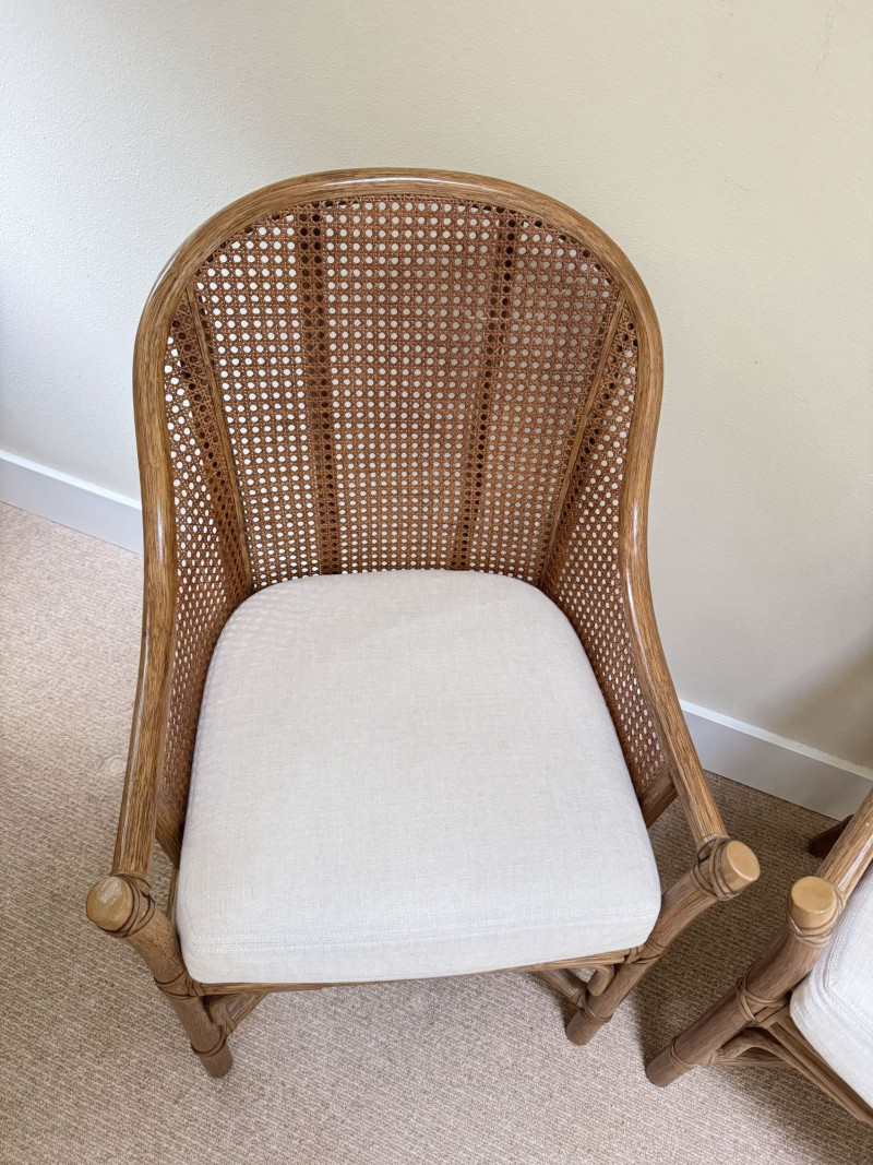 Pair Woven Cane Back Wood Accent Chairs w/ Cushions.