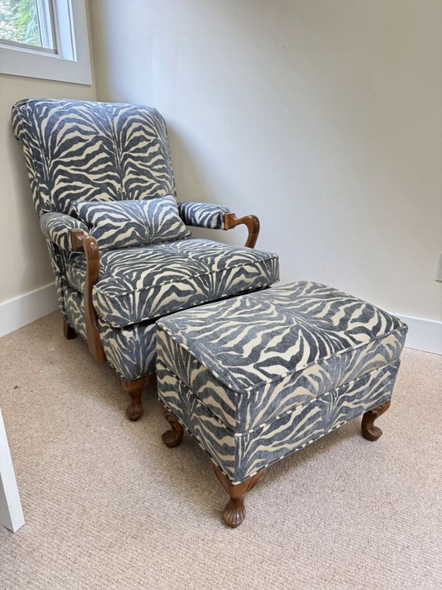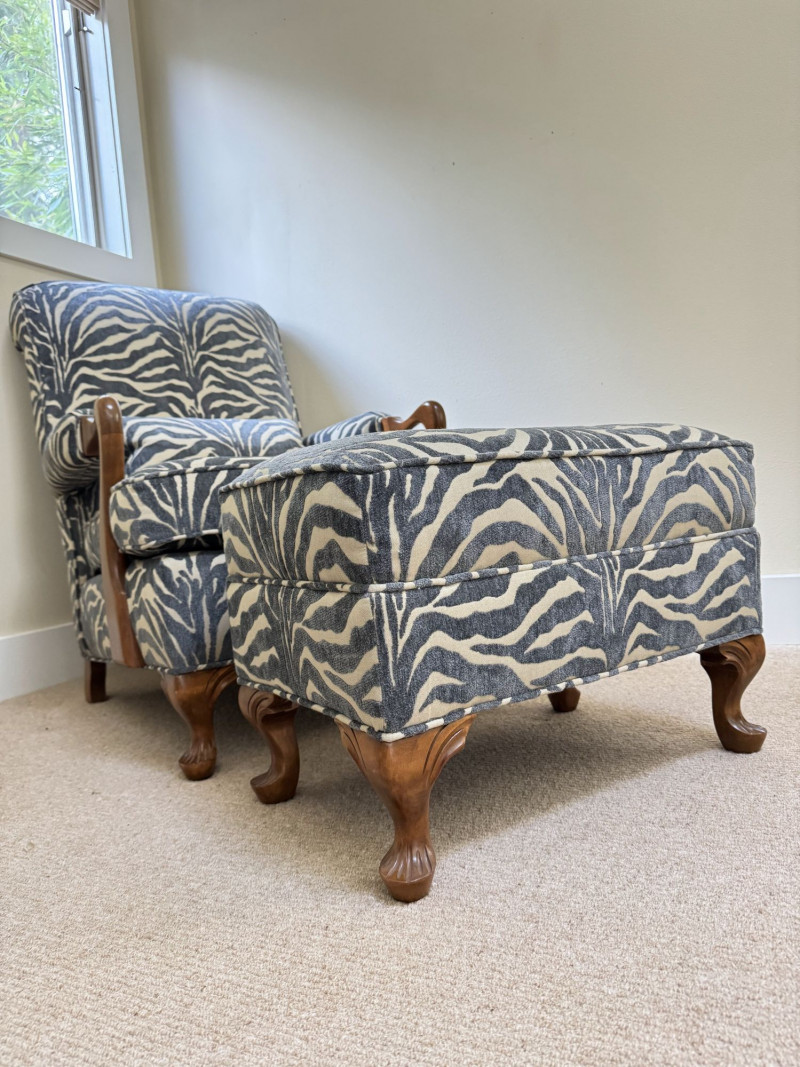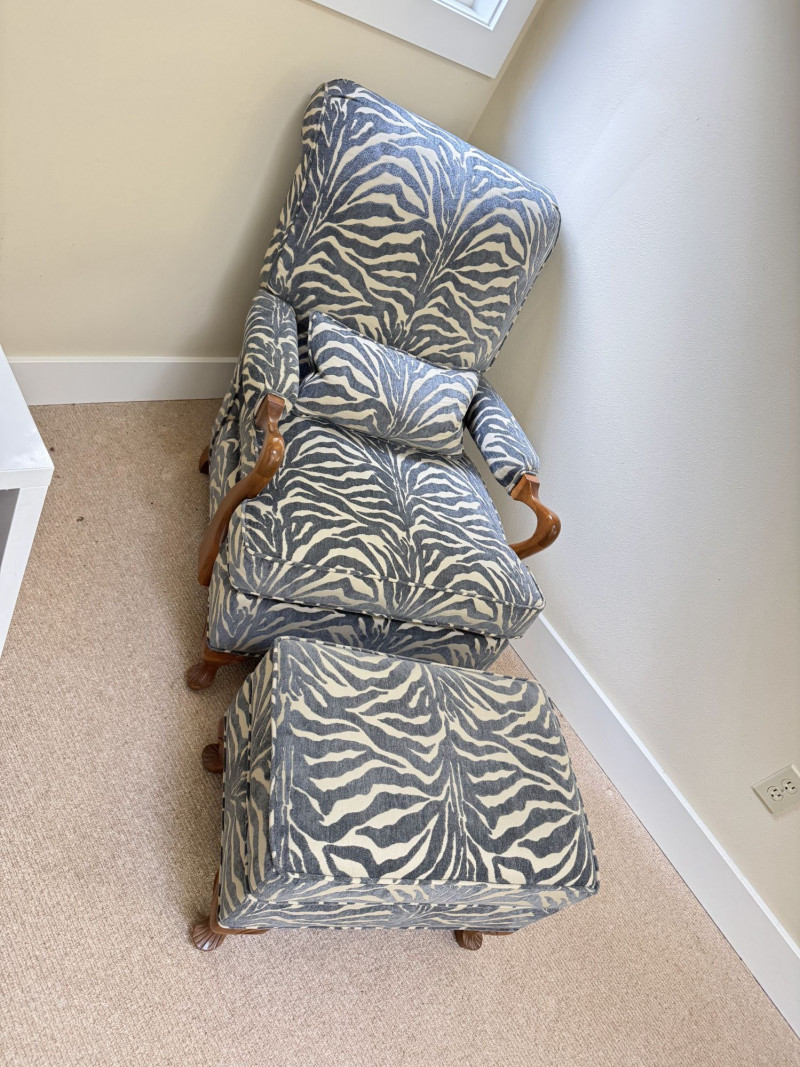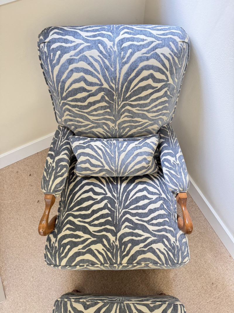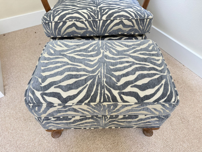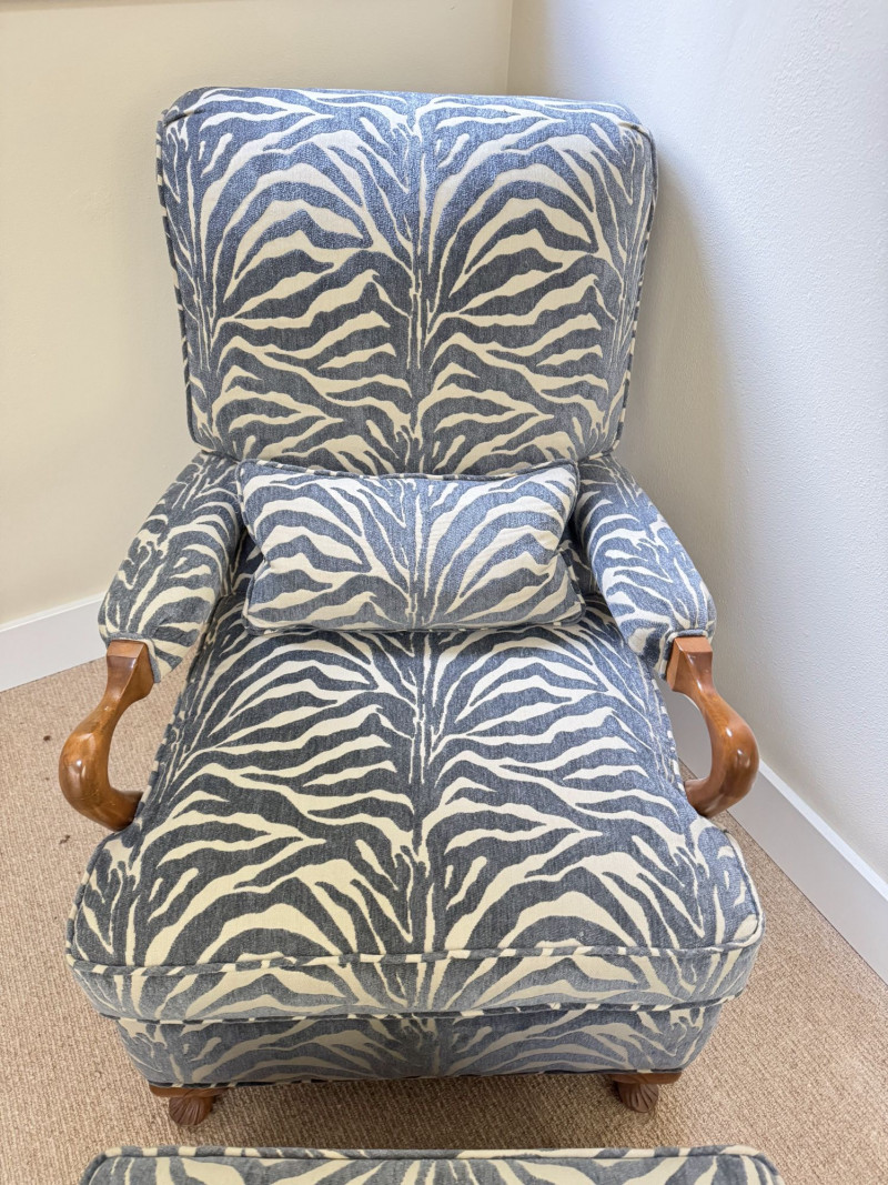 Upholstered Accent Chair & Ottoman Set – Zebra Print. Accent chair with matching ottoman featuring zebra-pattern upholstery and wood arms/legs. Bidding on this lot is an agreement that: (1.) You will have at least 2 capable, able bodied persons to lift and load at a minimum. (2.) You will bring a hand truck and/or any other tools needed to remove this item. If these steps are not followed your item will be forfeit and no refund given.