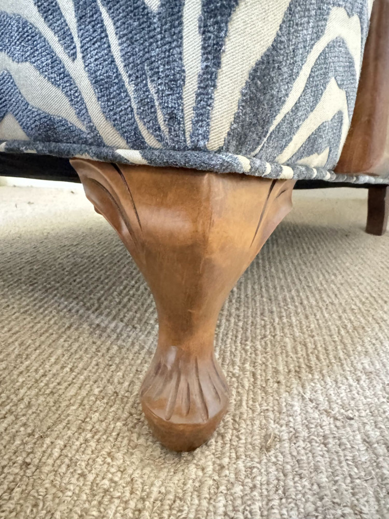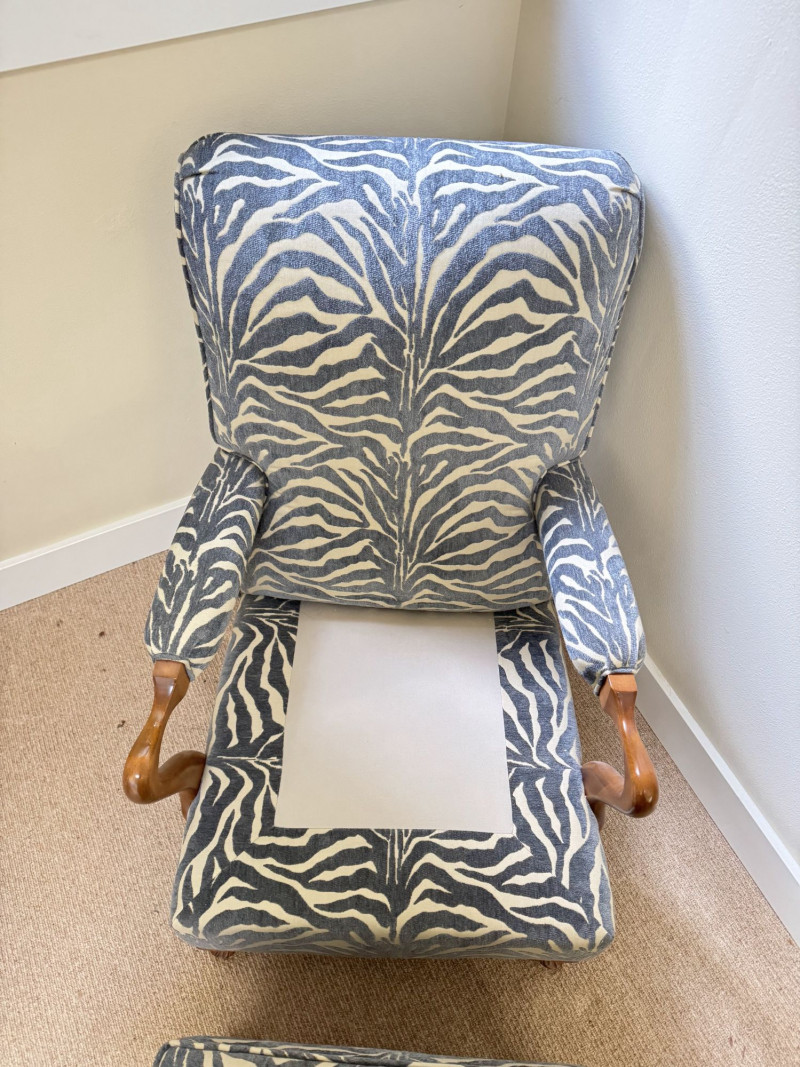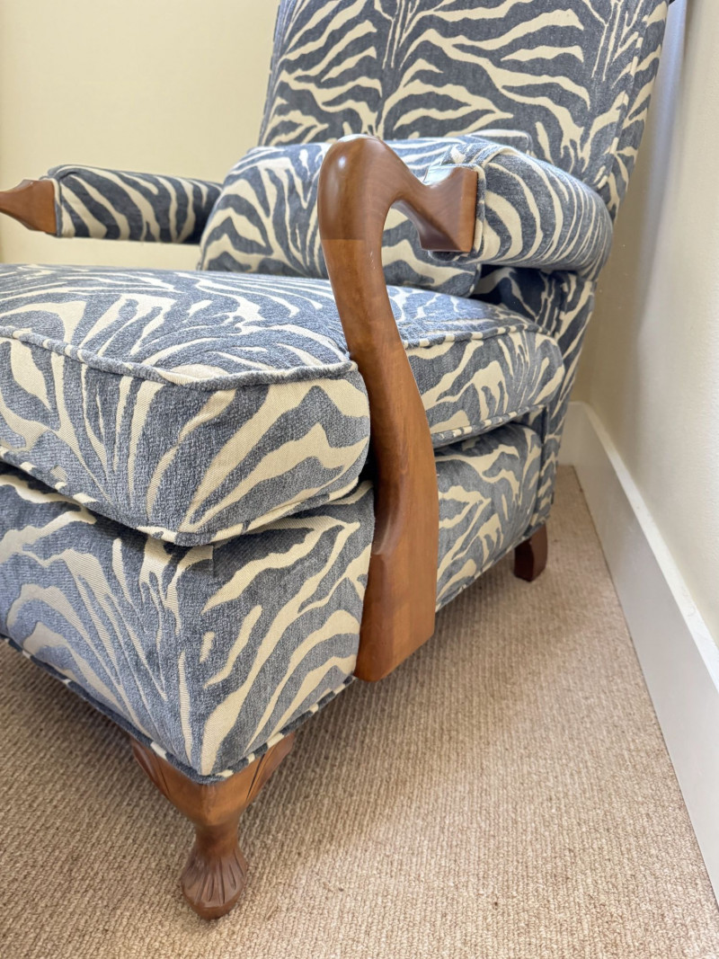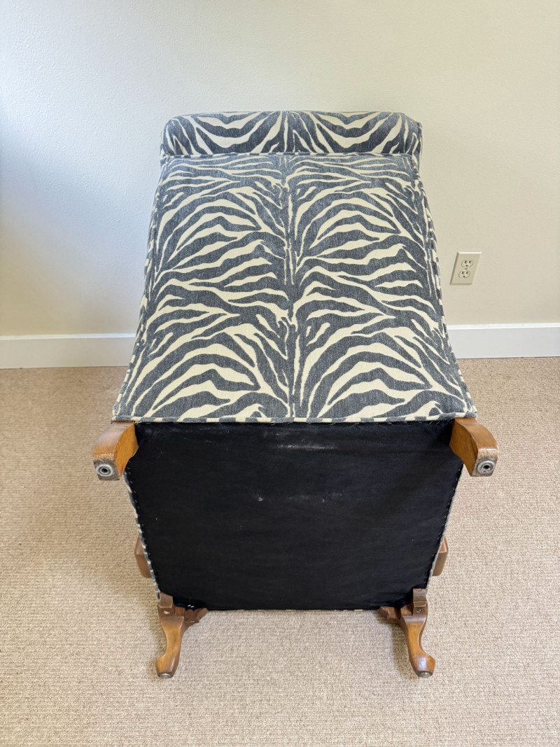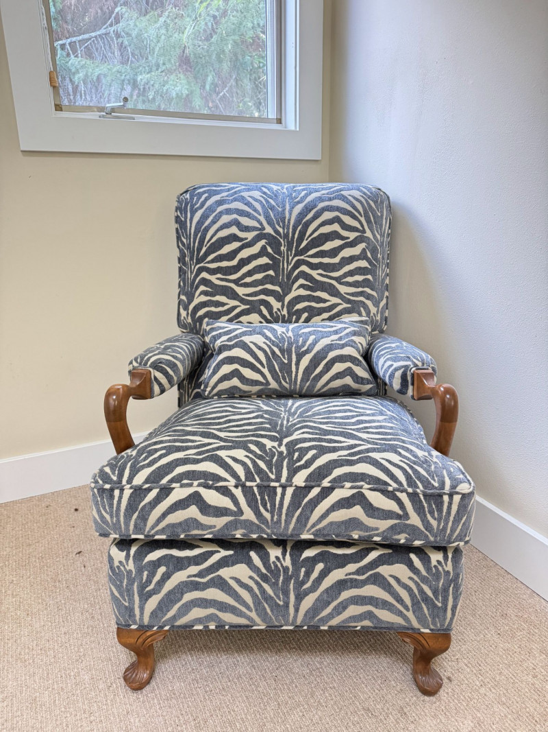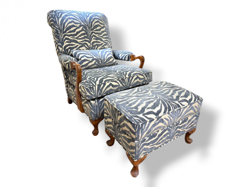 Upholstered Accent Chair & Ottoman Set – Zebra Print. Accent chair with matching ottoman featuring zebra-pattern upholstery and wood arms/legs. Bidding on this lot is an agreement that: (1.) You will have at least 2 capable, able bodied persons to lift and load at a minimum. (2.) You will bring a hand truck and/or any other tools needed to remove this item. If these steps are not followed your item will be forfeit and no refund given.