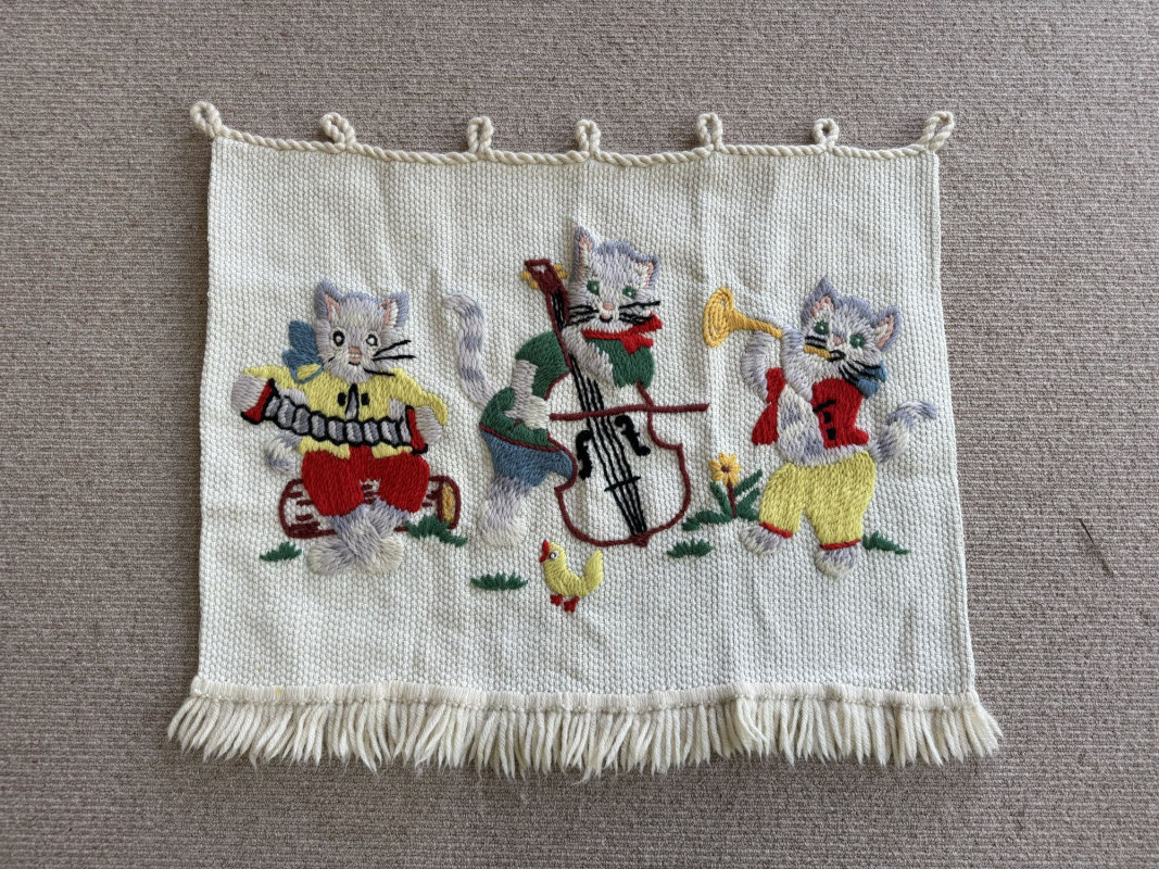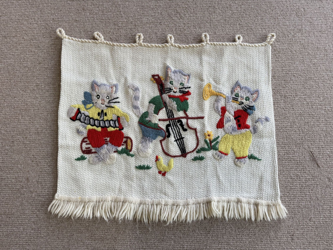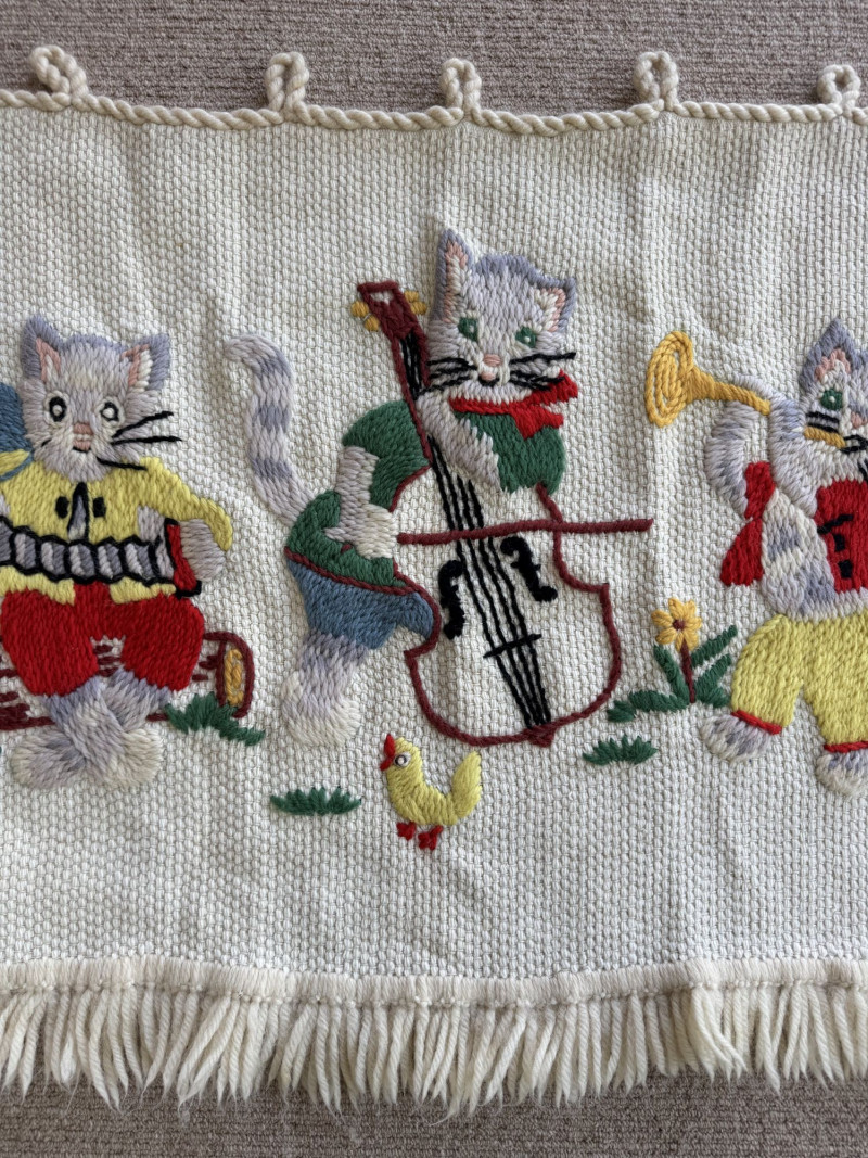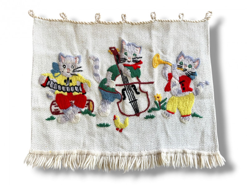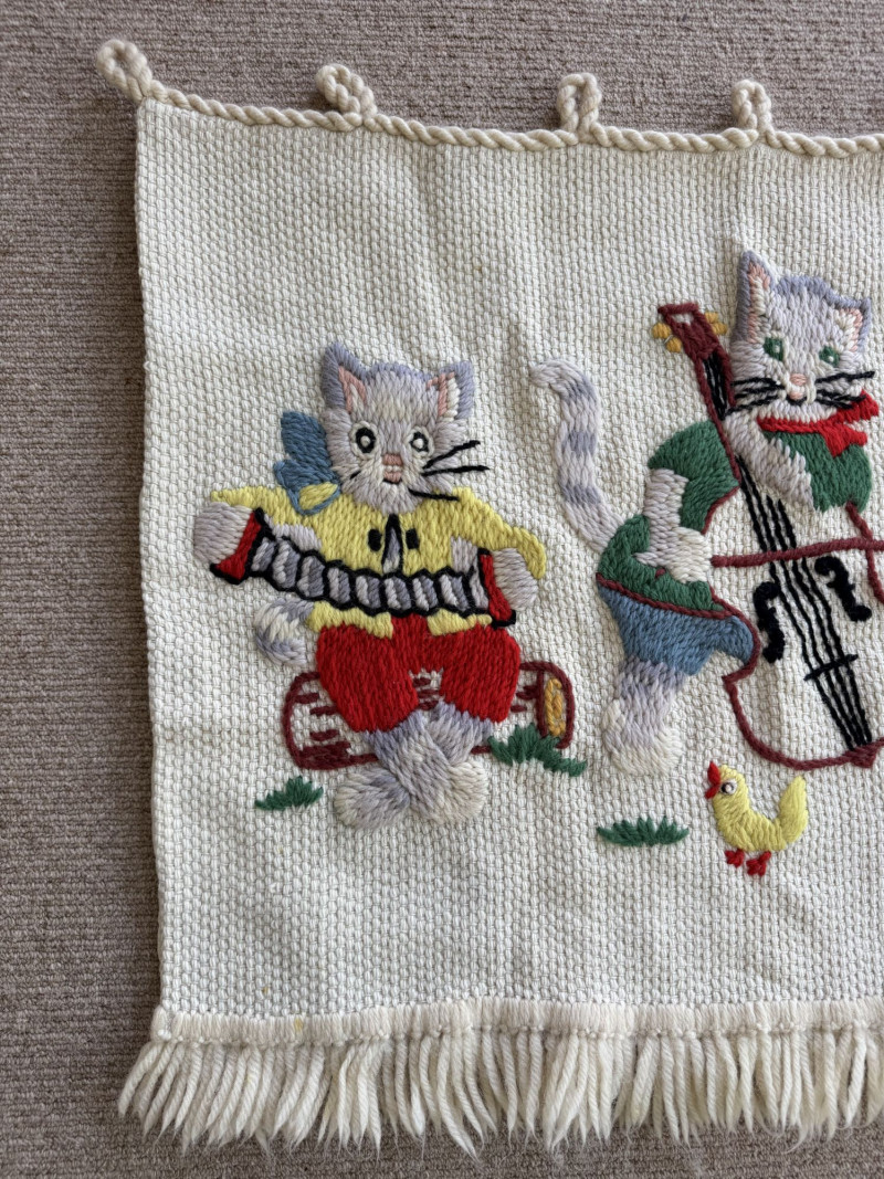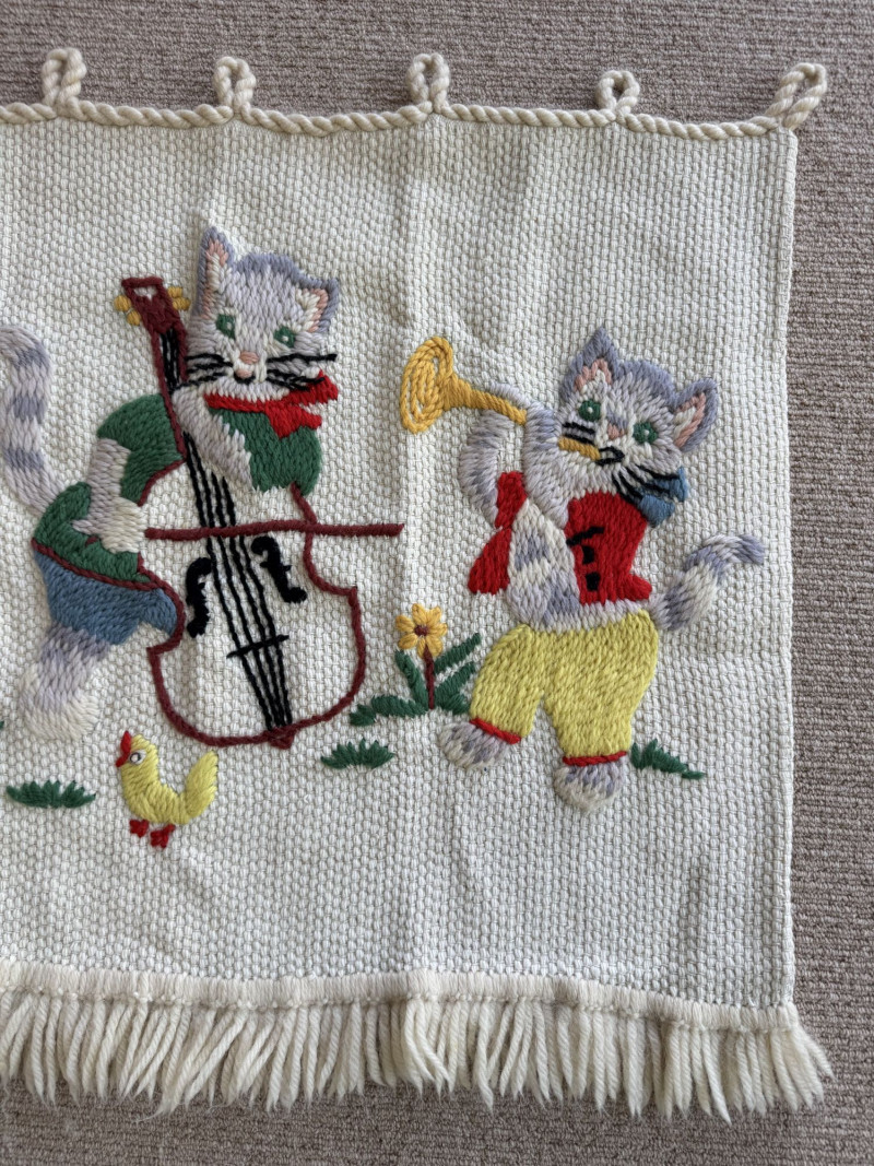 Lot # 107 - Hand-Knitted Tapestry w/ Braided Loops - Cats Playing Instruments