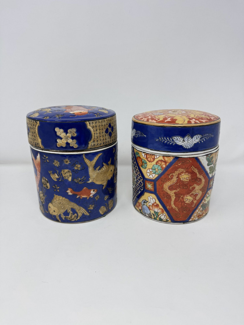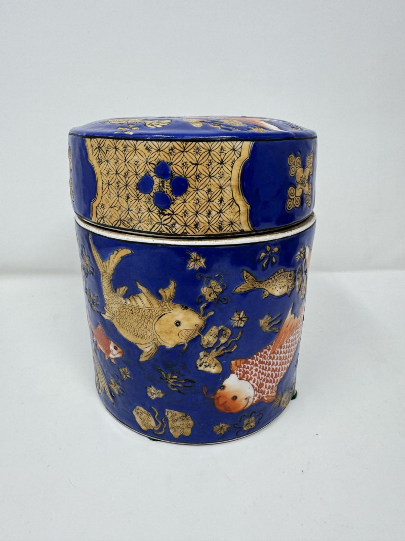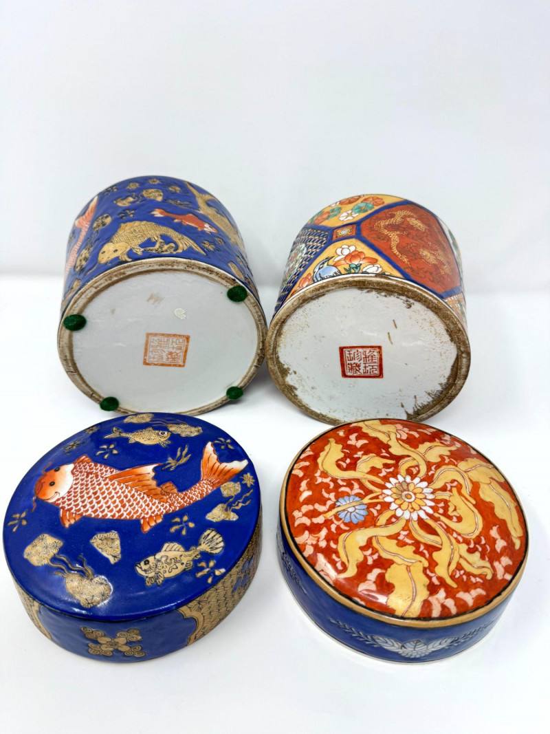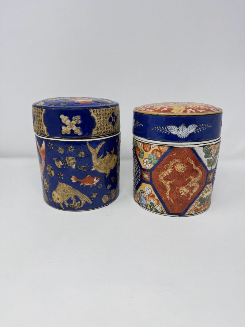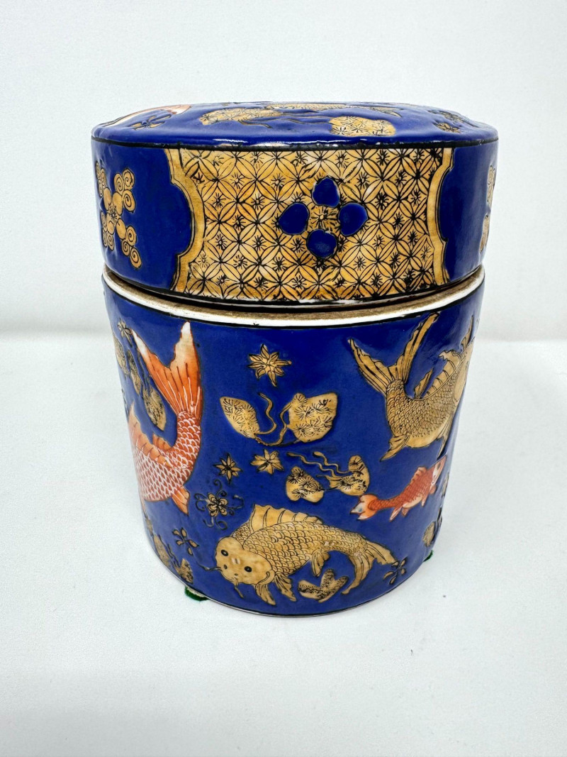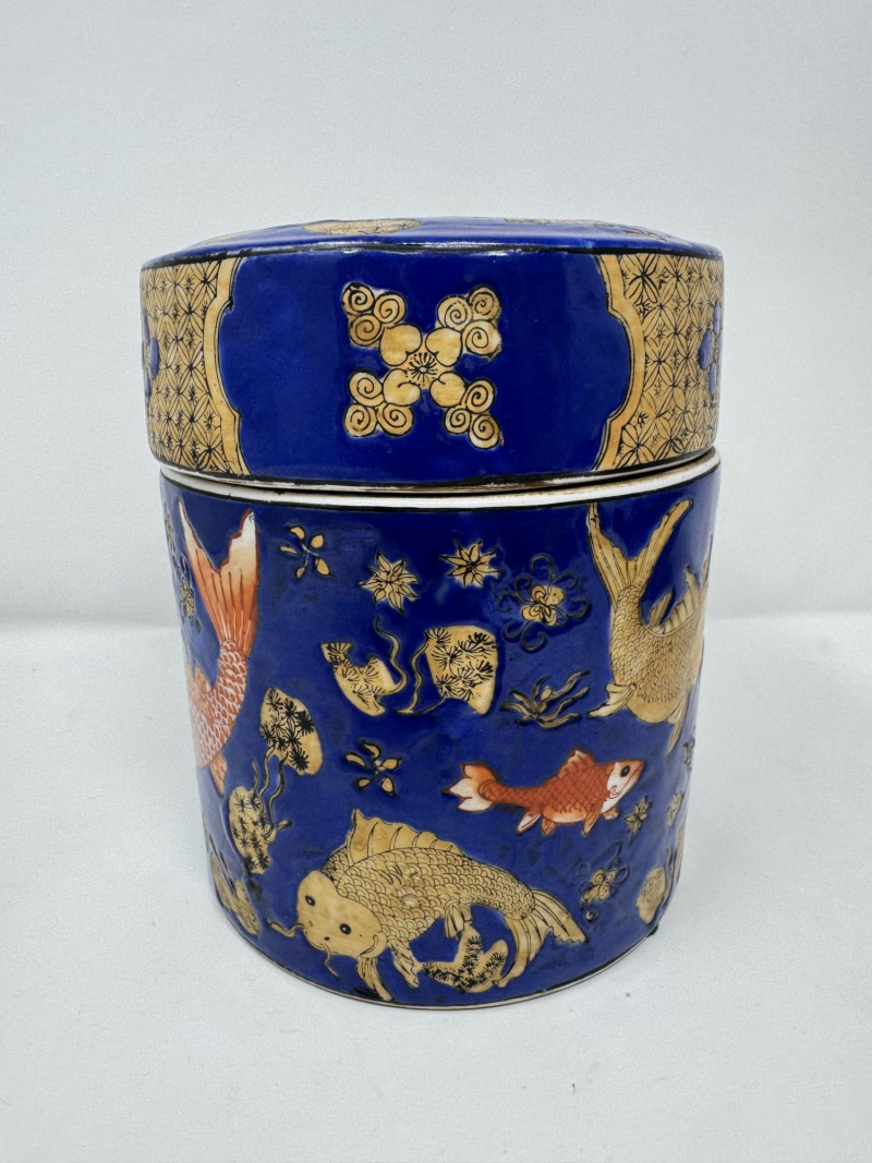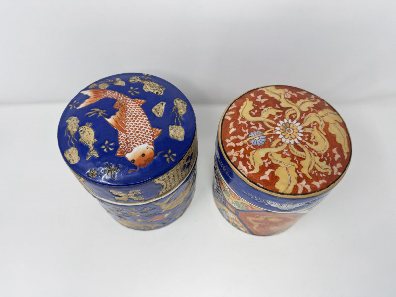 Lot # 110 - Ceramic Asian Lidded Jars w/ Fish, Floral, & Geometric Motifs