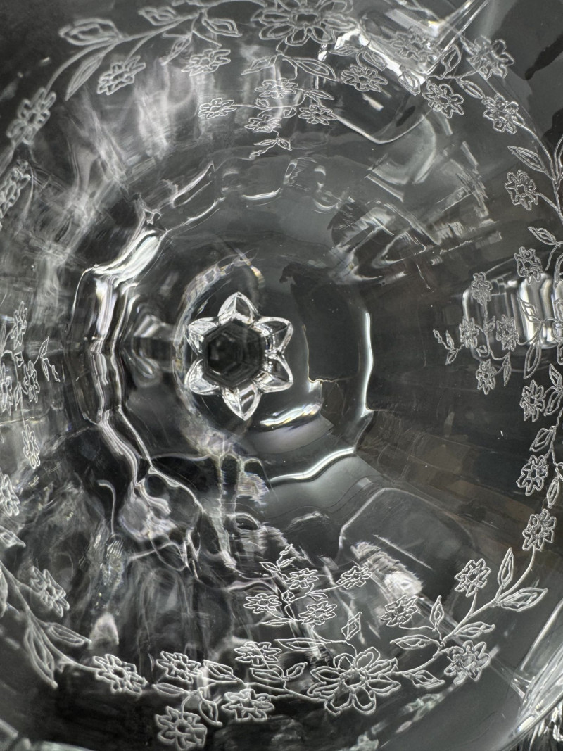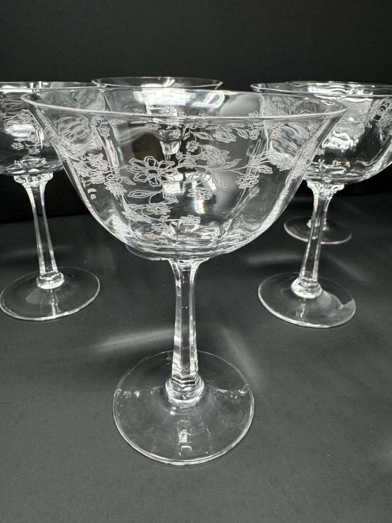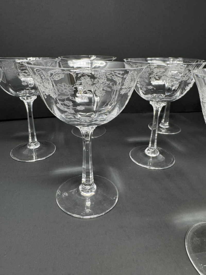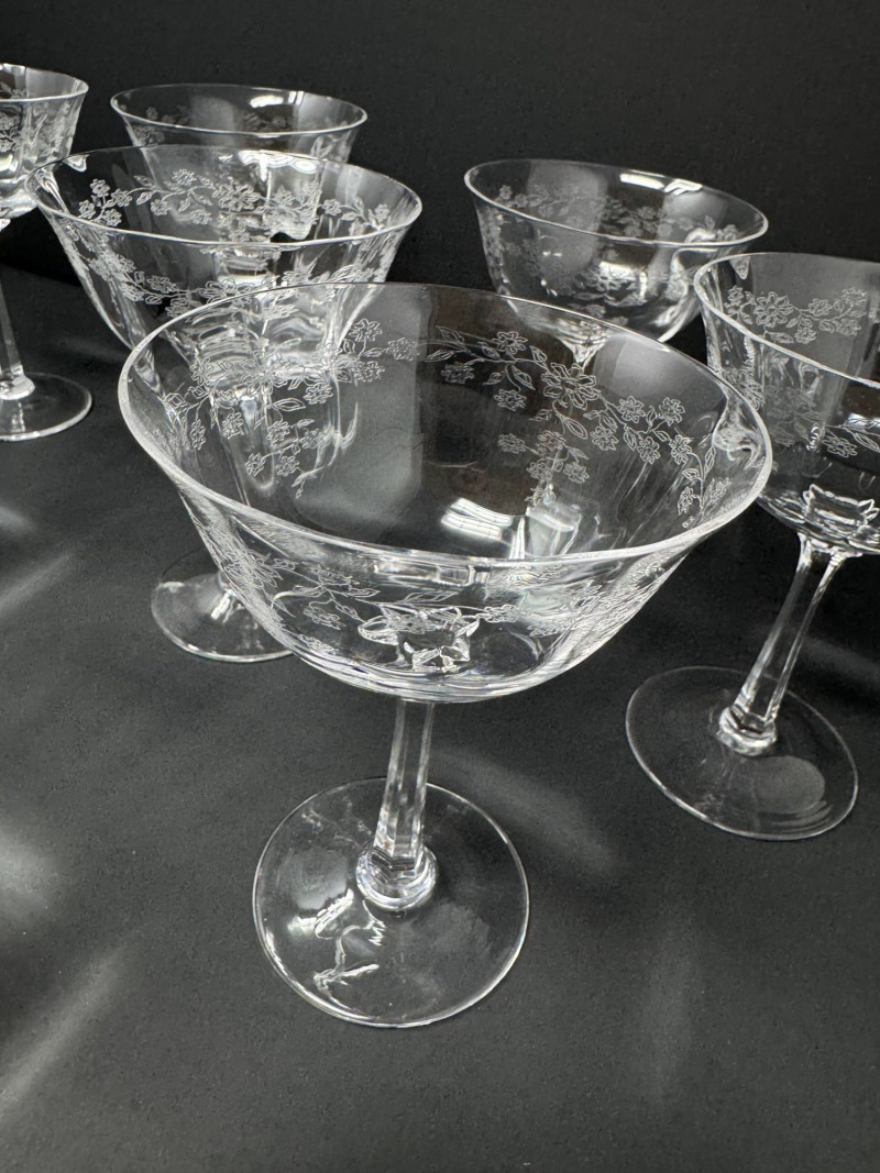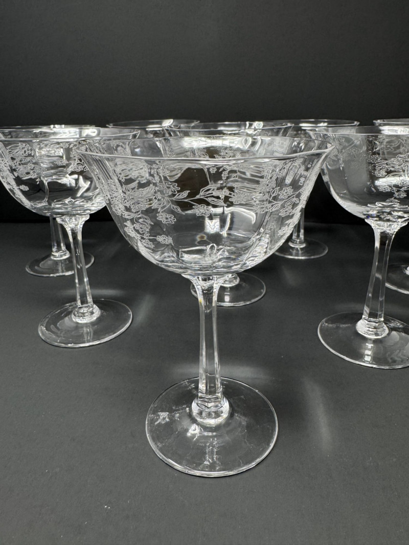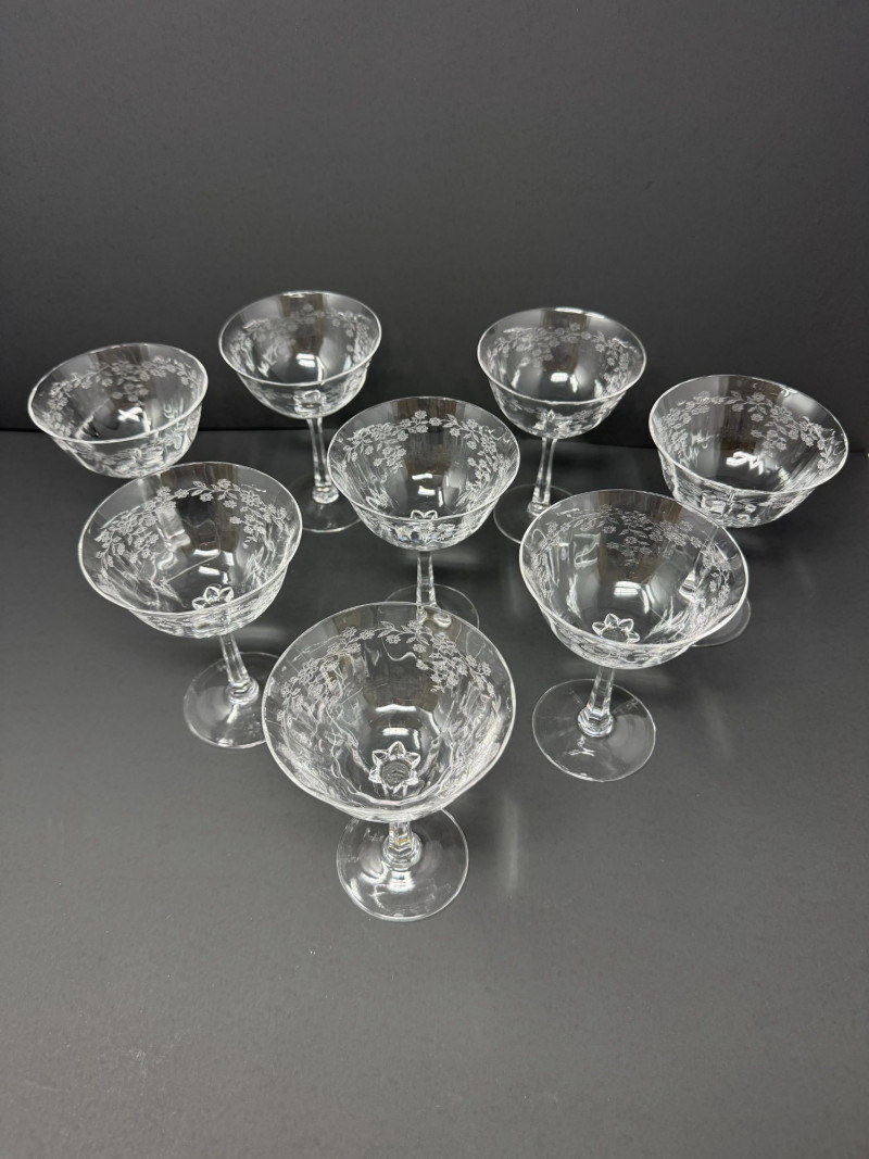 8 Lenox Castle Garden Etched Crystal Champagne Coupe Glasses.