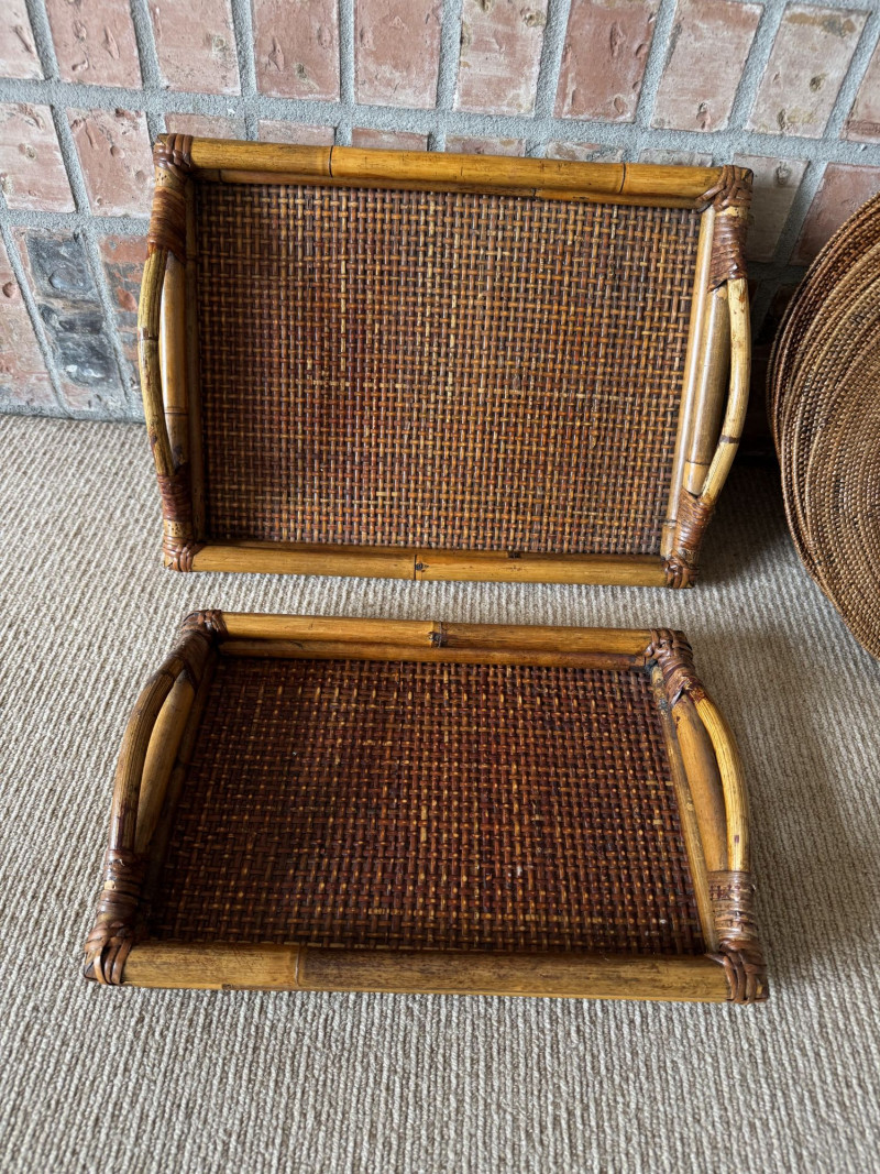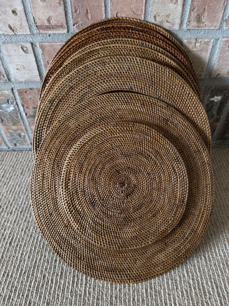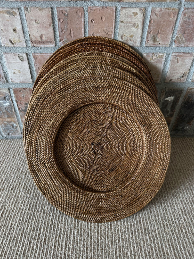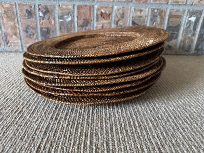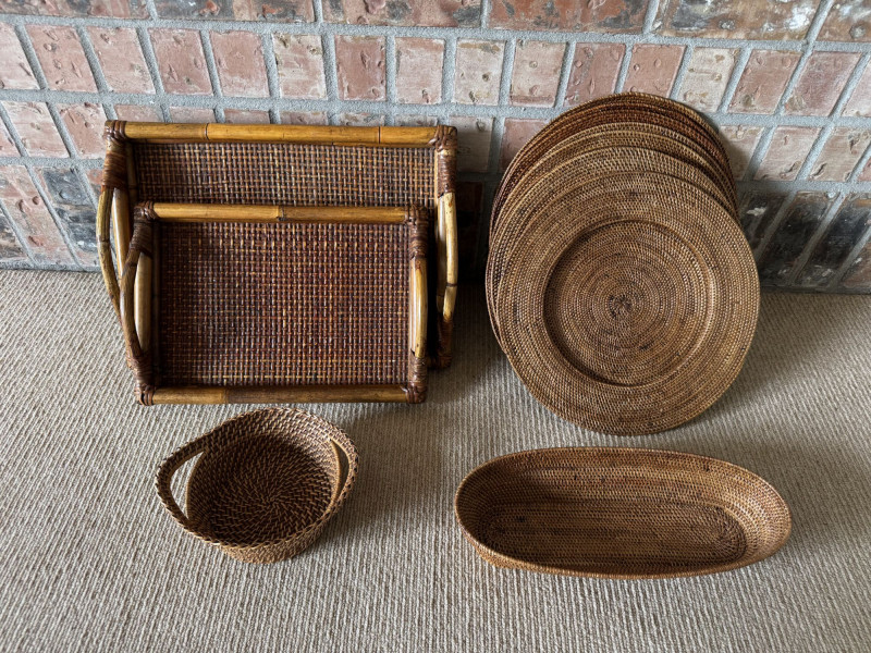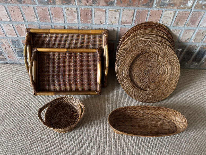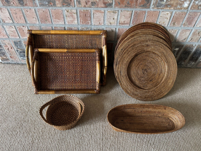 Lot # 122 - Assorted Woven Wicker Serving Set – Plates, Trays, Basket & Platter