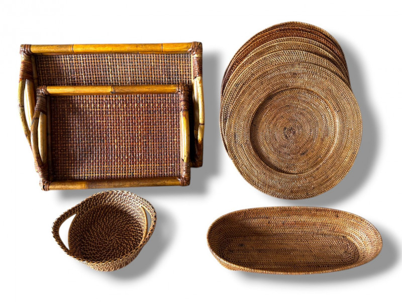 Assorted Woven Wicker Serving Set – Plates, Trays, Basket & Platter.