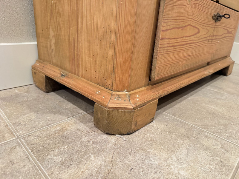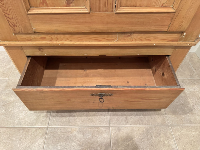 Antique Wood Wardrobe Cabinet w/ Drawer & Interior Pegs. Bidding on this lot is an agreement that: (1.) You will have at least 2 capable, able bodied persons to lift and load at a minimum. (2.) You will bring a hand truck and/or any other tools needed to remove this item. If these steps are not followed your item will be forfeit and no refund given.