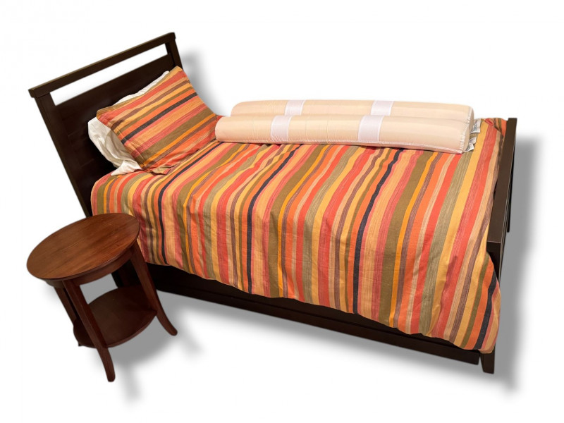 Lot # 131 - Cafe Kid Twin Panel Bed w/ Trundle, Bedding, & Matching Side Table