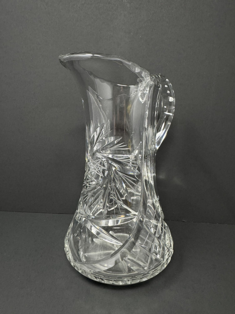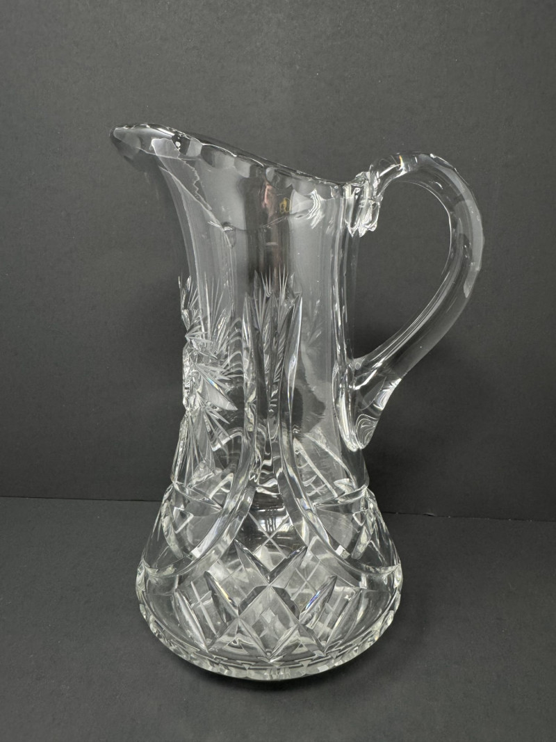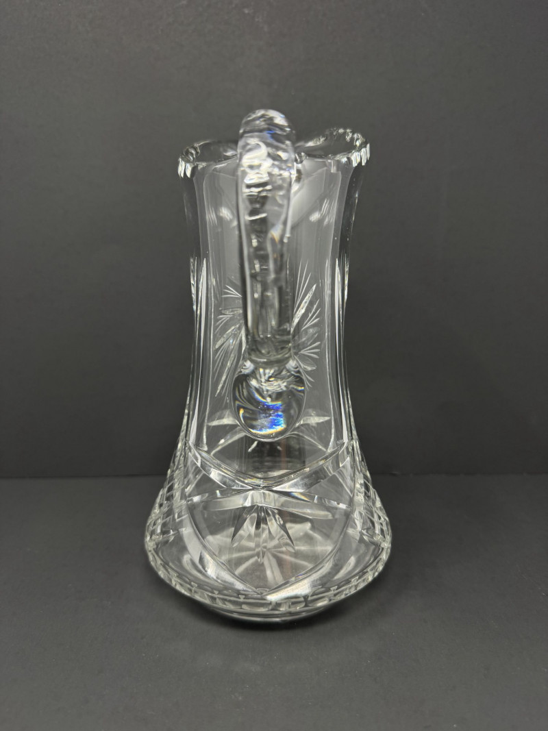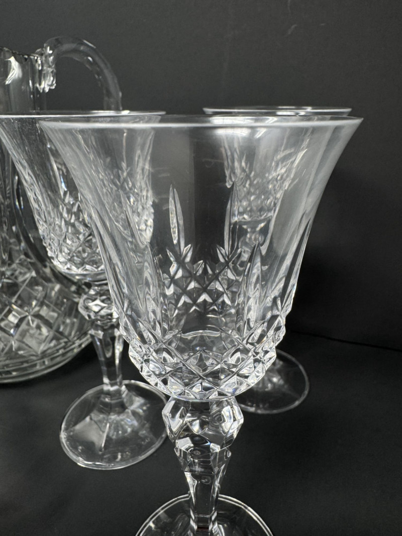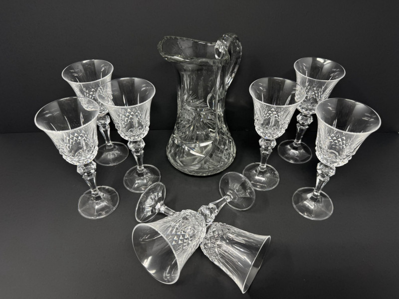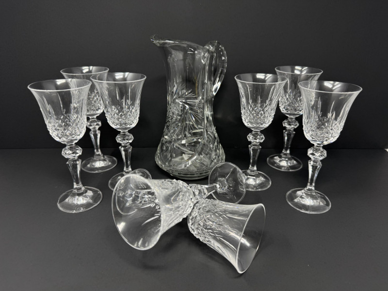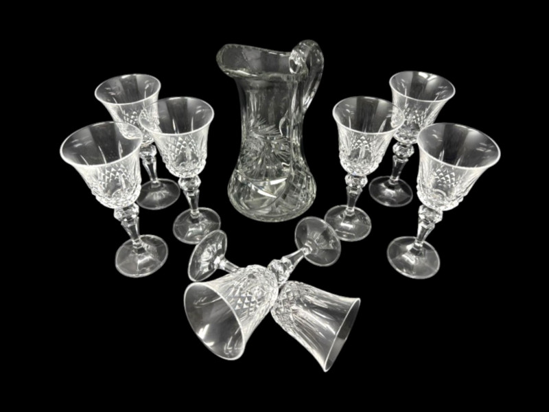 Cut Crystal Pitcher & 8 Stemmed Glasses Set - Starburst Pattern.