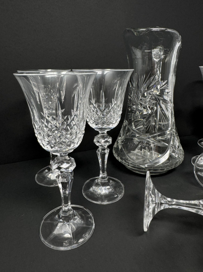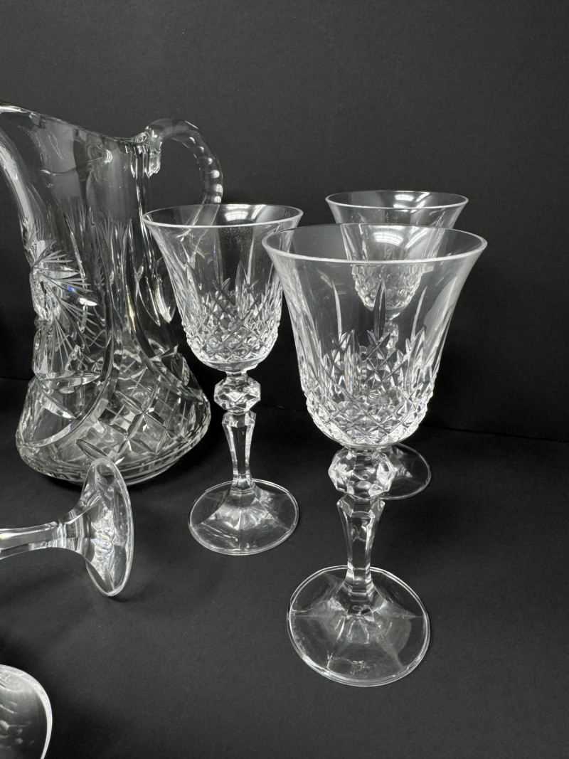 Lot # 143 - Cut Crystal Pitcher & 8 Stemmed Glasses Set - Starburst Pattern