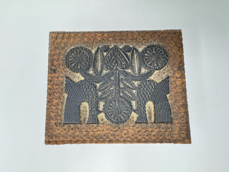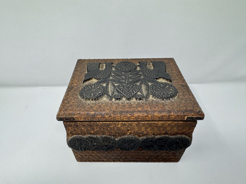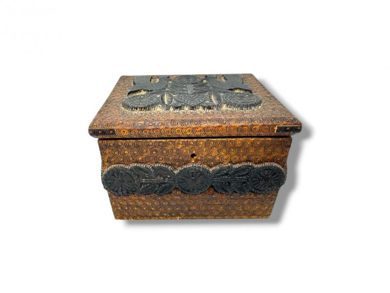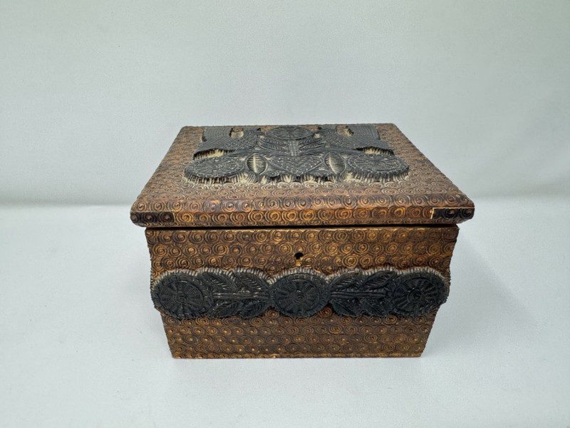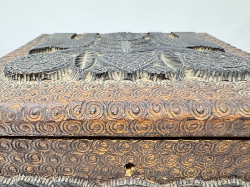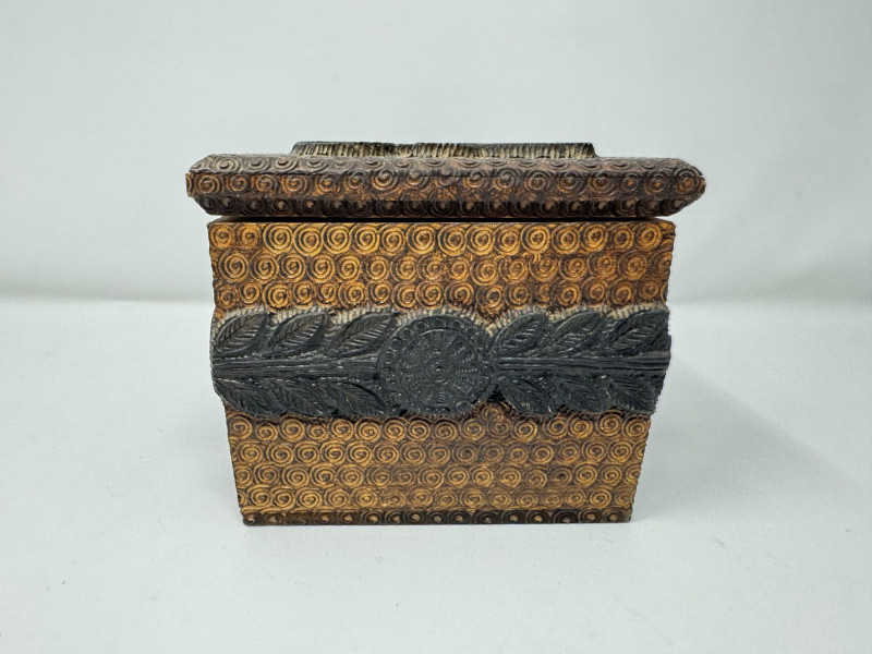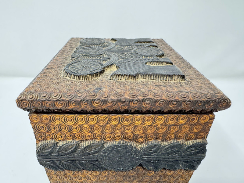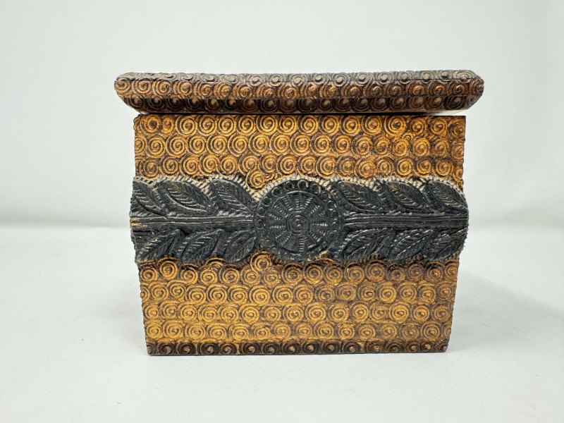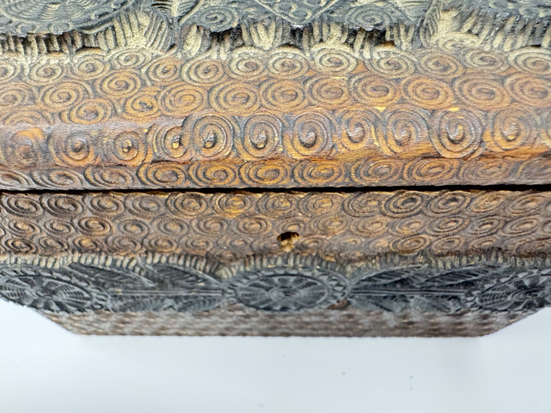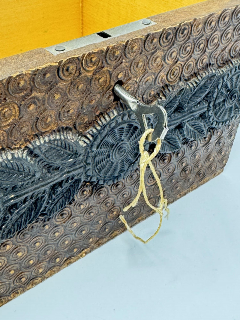 Hand Carved Wood Storage Box w/ Key & Decorative Relief Pattern.