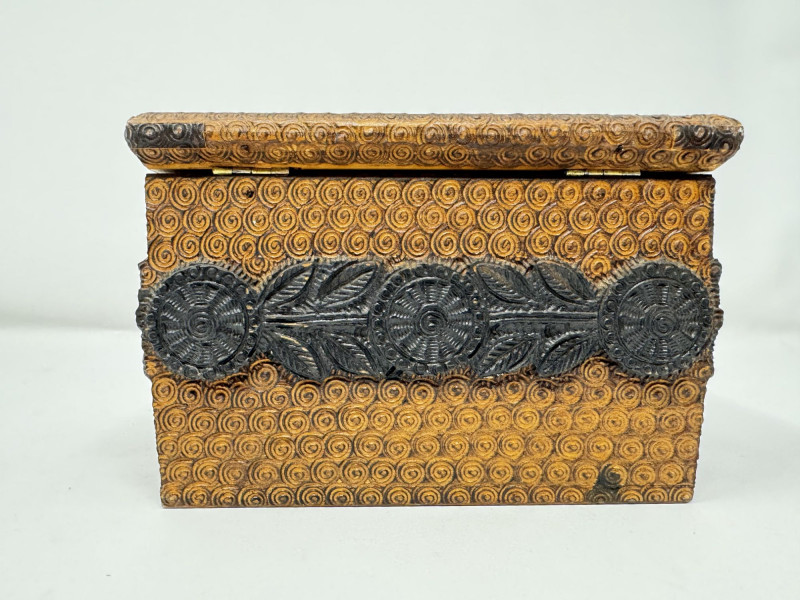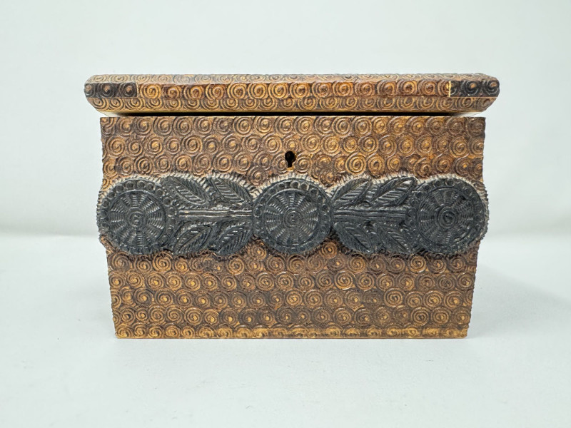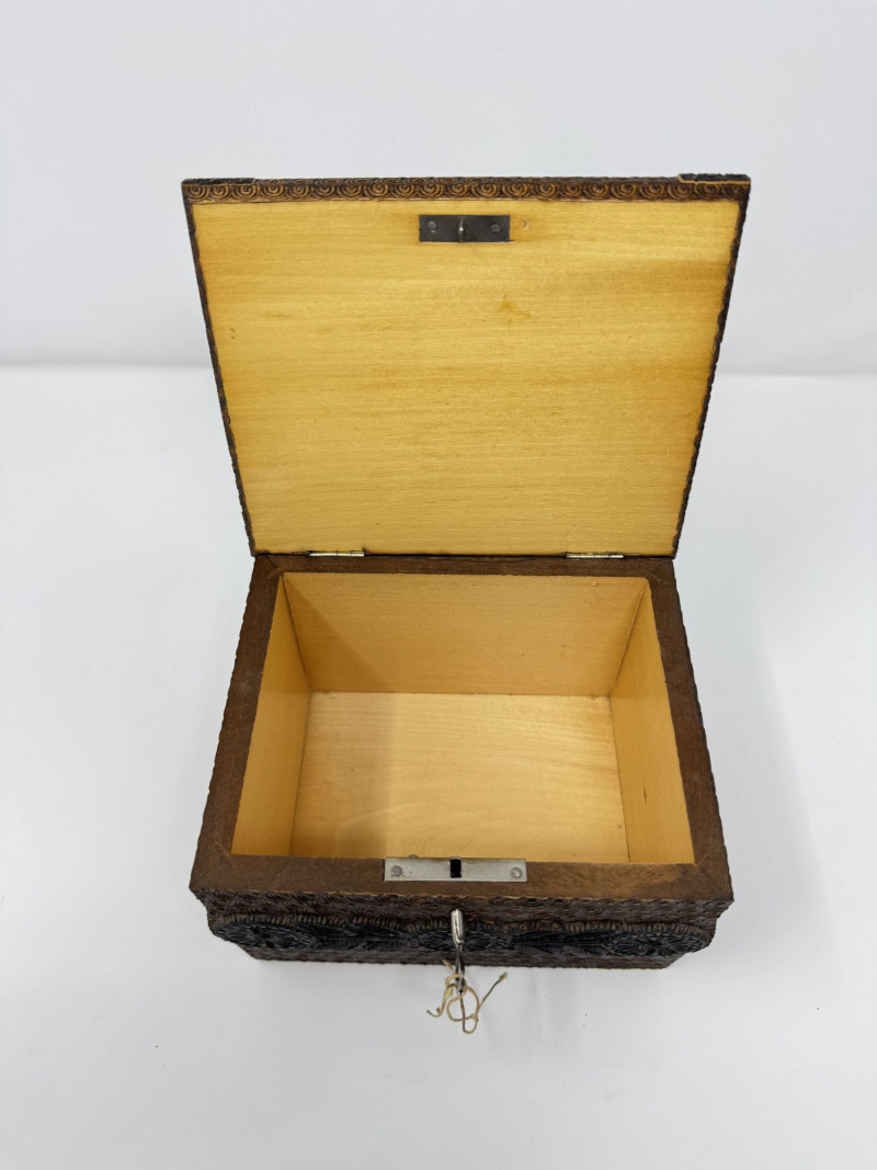 Lot # 156 - Hand Carved Wood Storage Box w/ Key & Decorative Relief Pattern