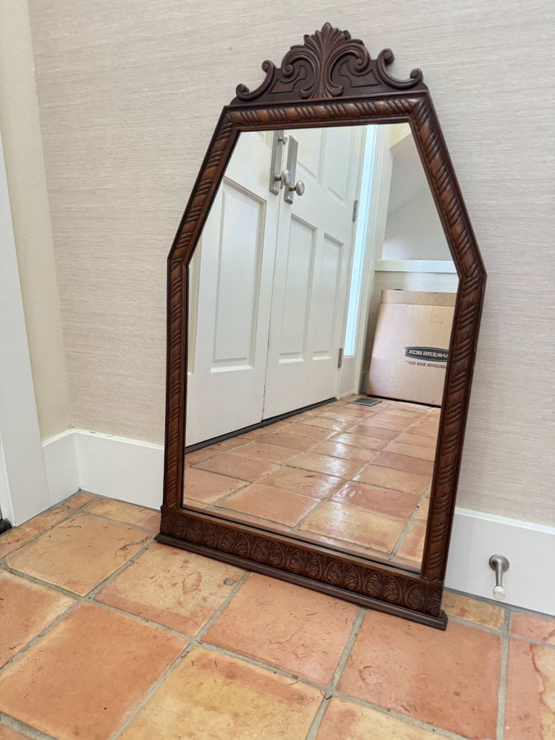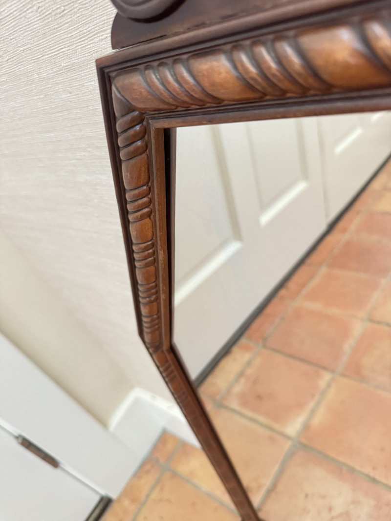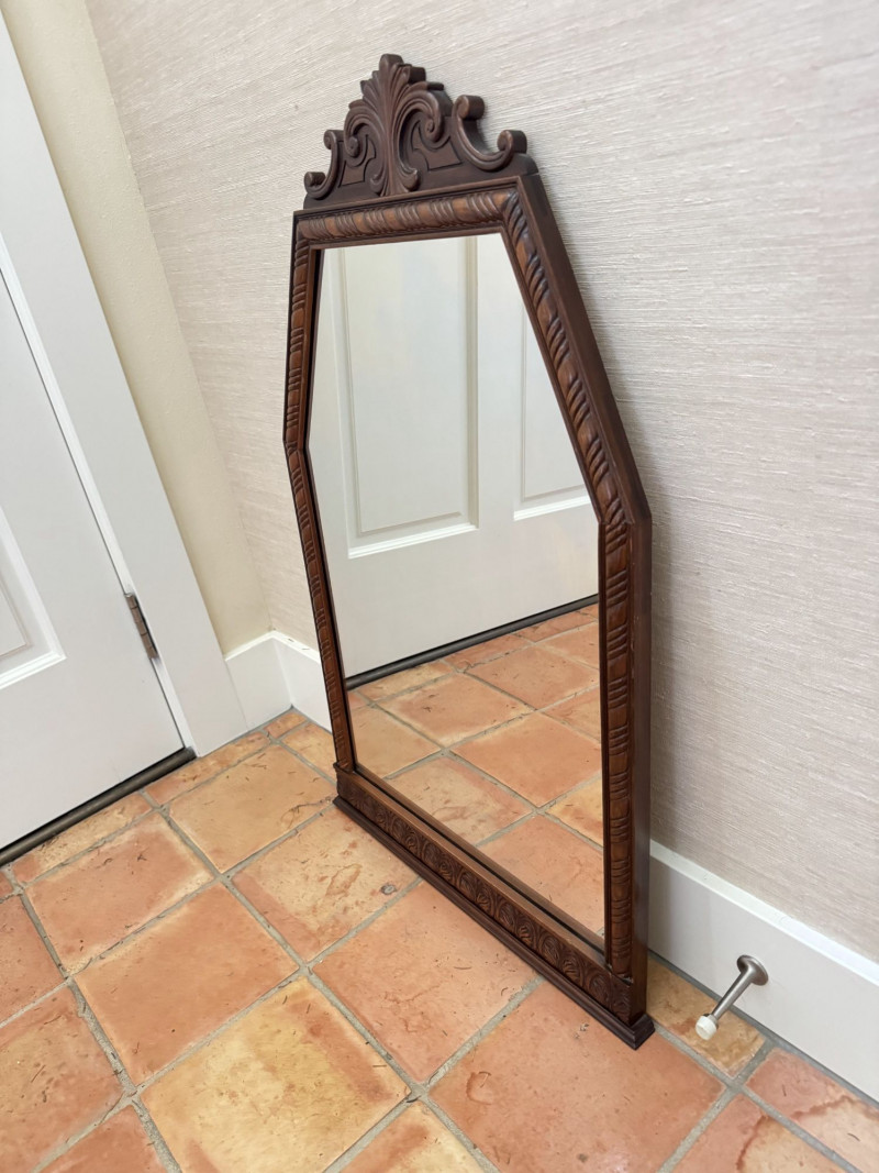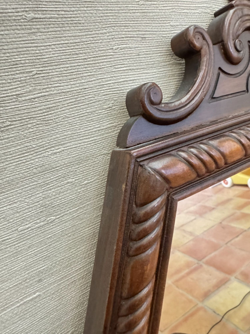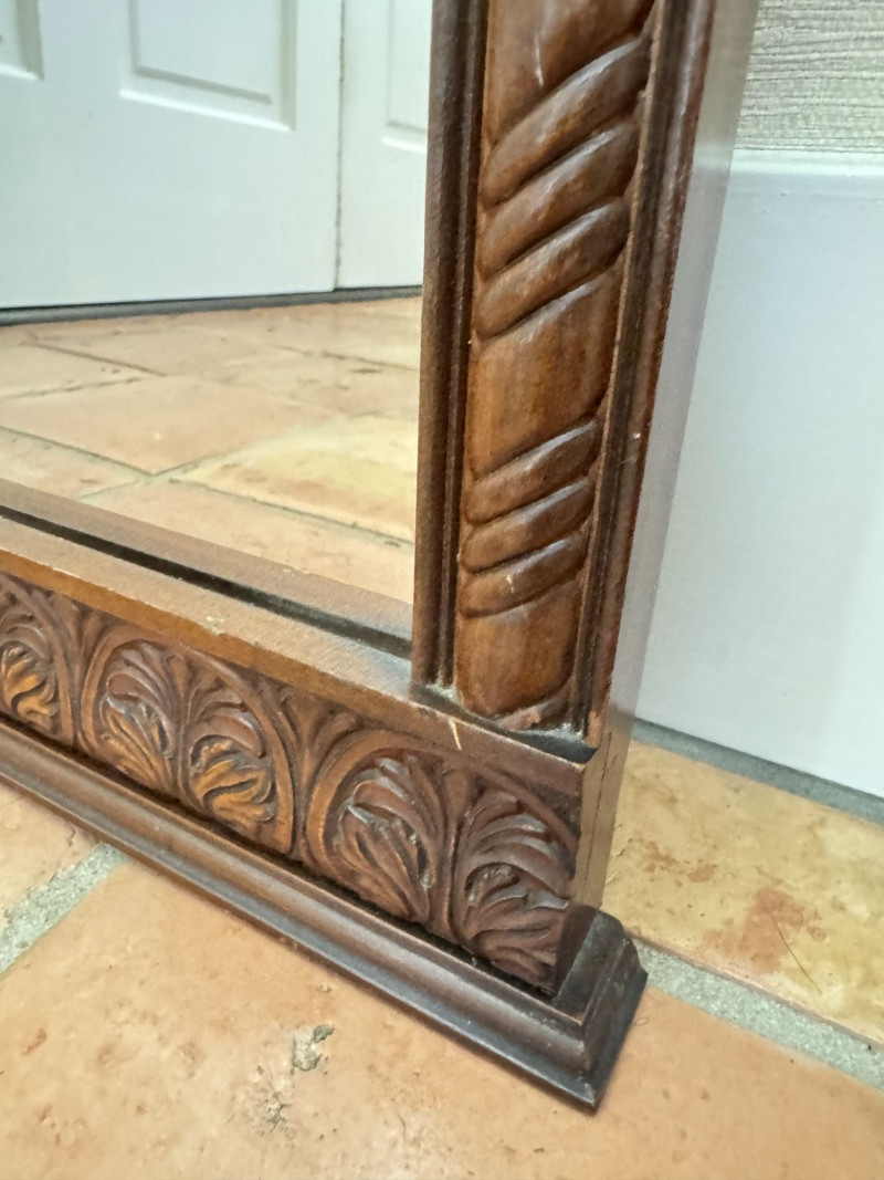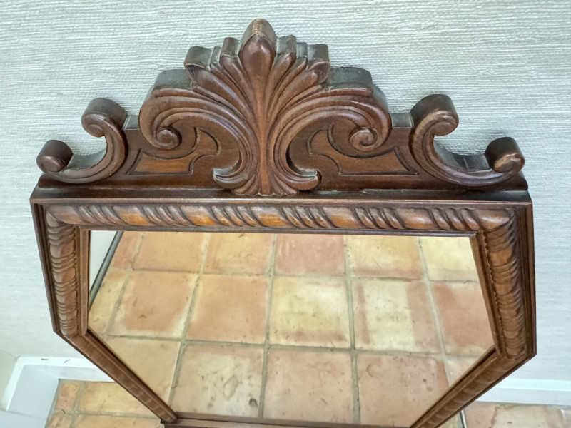 Vintage Ornate Carved Wood Wall Mirror w/ Decorative Crest Top Frame.